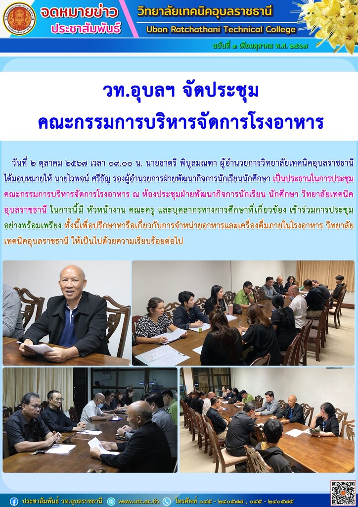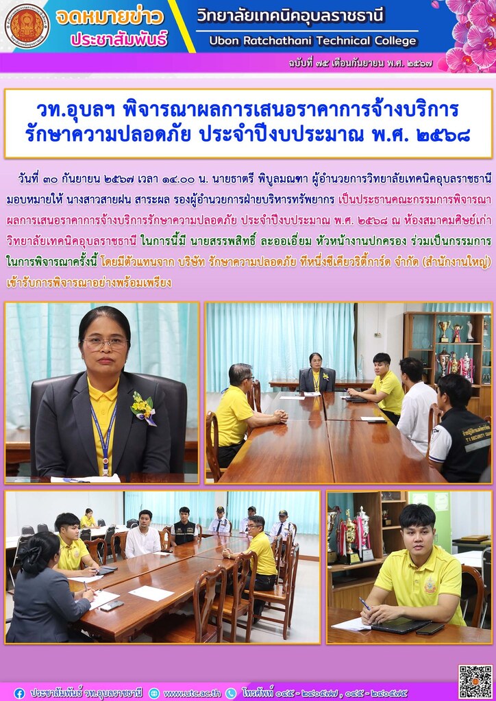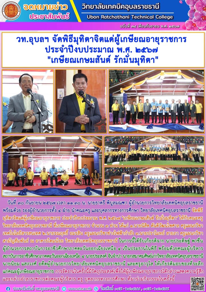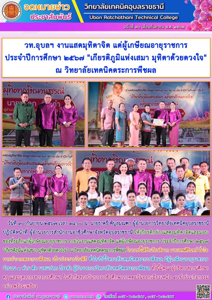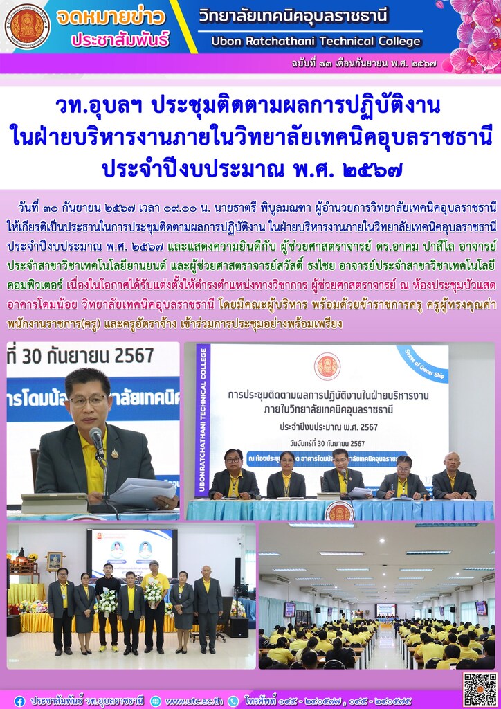 วันที่ ๓๐ กันยายน ๒๕๖๗ เวลา ๑๘.๐๐ น. นายธาตรี พิบูลมณฑา ผู้อำนวยการวิทยาลัยเทคนิคอุบลราชธานี (เพิ่มเติม…)