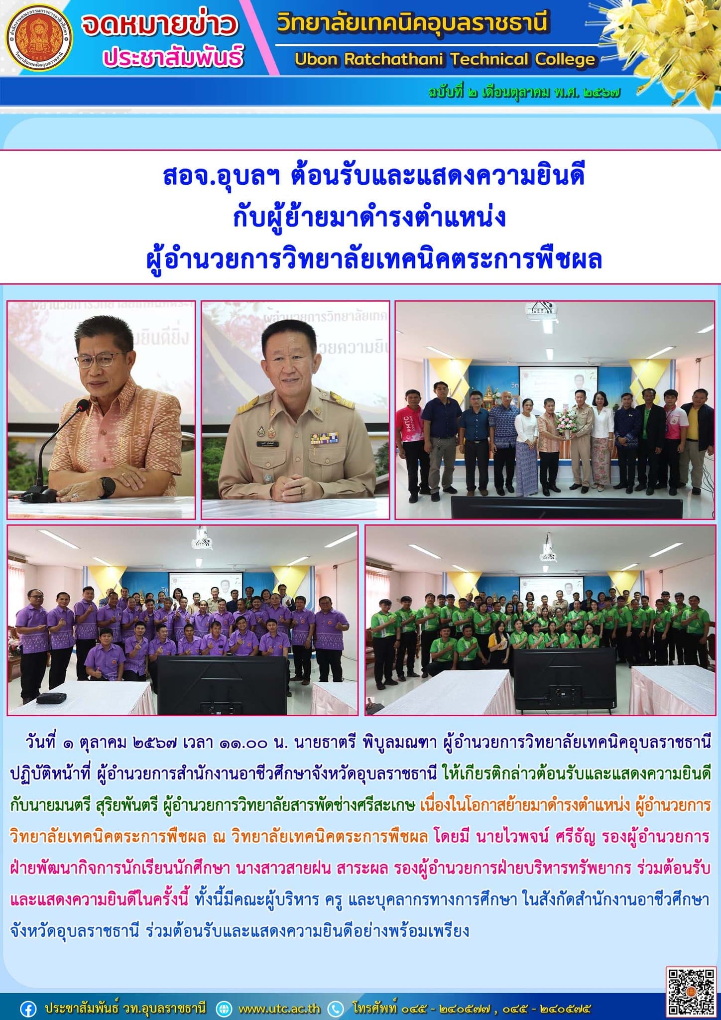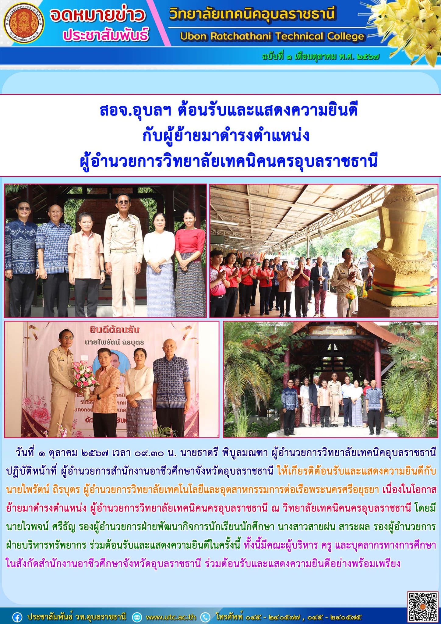 วันที่ ๑ ตุลาคม ๒๕๖๗ เวลา ๑๑.๐๐ น. นายธาตรี พิบูลมณฑา ผู้อำนวยการวิทยาลัยเทคนิคอุบลราชธานี ปฏิบัติหน้าที่ ผู้อำนวยการสำนักงานอาชีวศึกษาจังหวัดอุบลราชธานี ให้เกียรติต้อนรับ (เพิ่มเติม…)