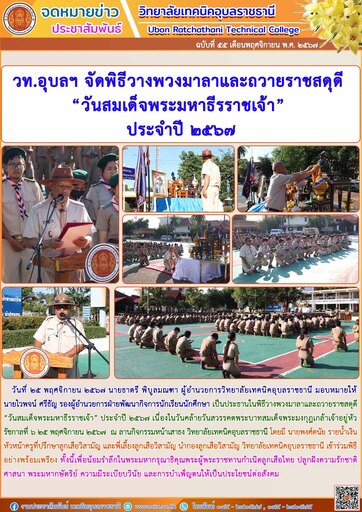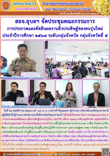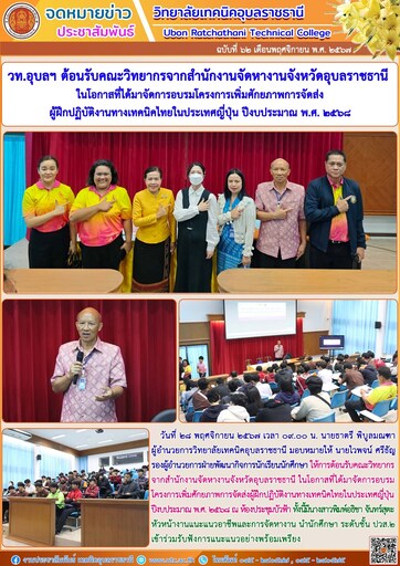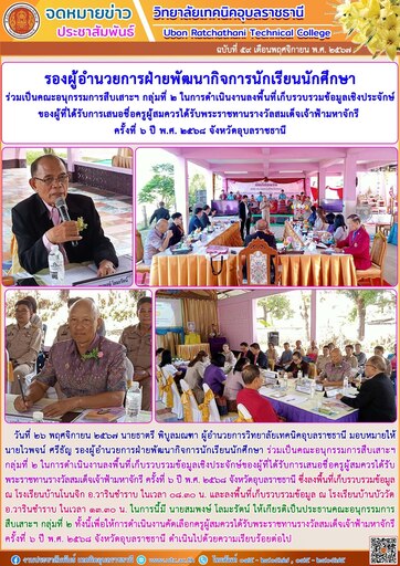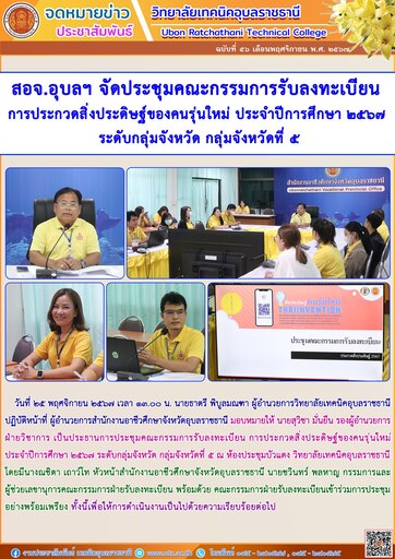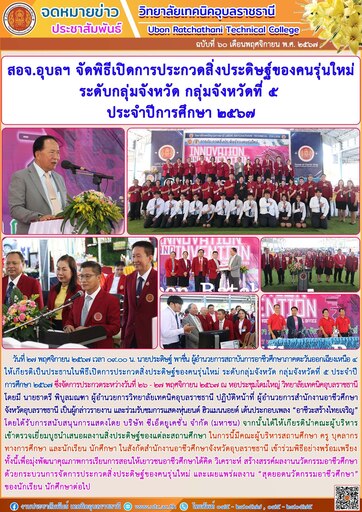วันที่ ๒๕ พฤศจิกายน ๒๕๖๗ นายธาตรี พิบูลมณฑา ผู้อำนวยการวิทยาลัยเทคนิคอุบลราชธานี มอบหมายให้ นายไวพจน์ ศรีธัญ รองผู้อำนวยการฝ่ายพัฒนากิจการนักเรียน (เพิ่มเติม…)