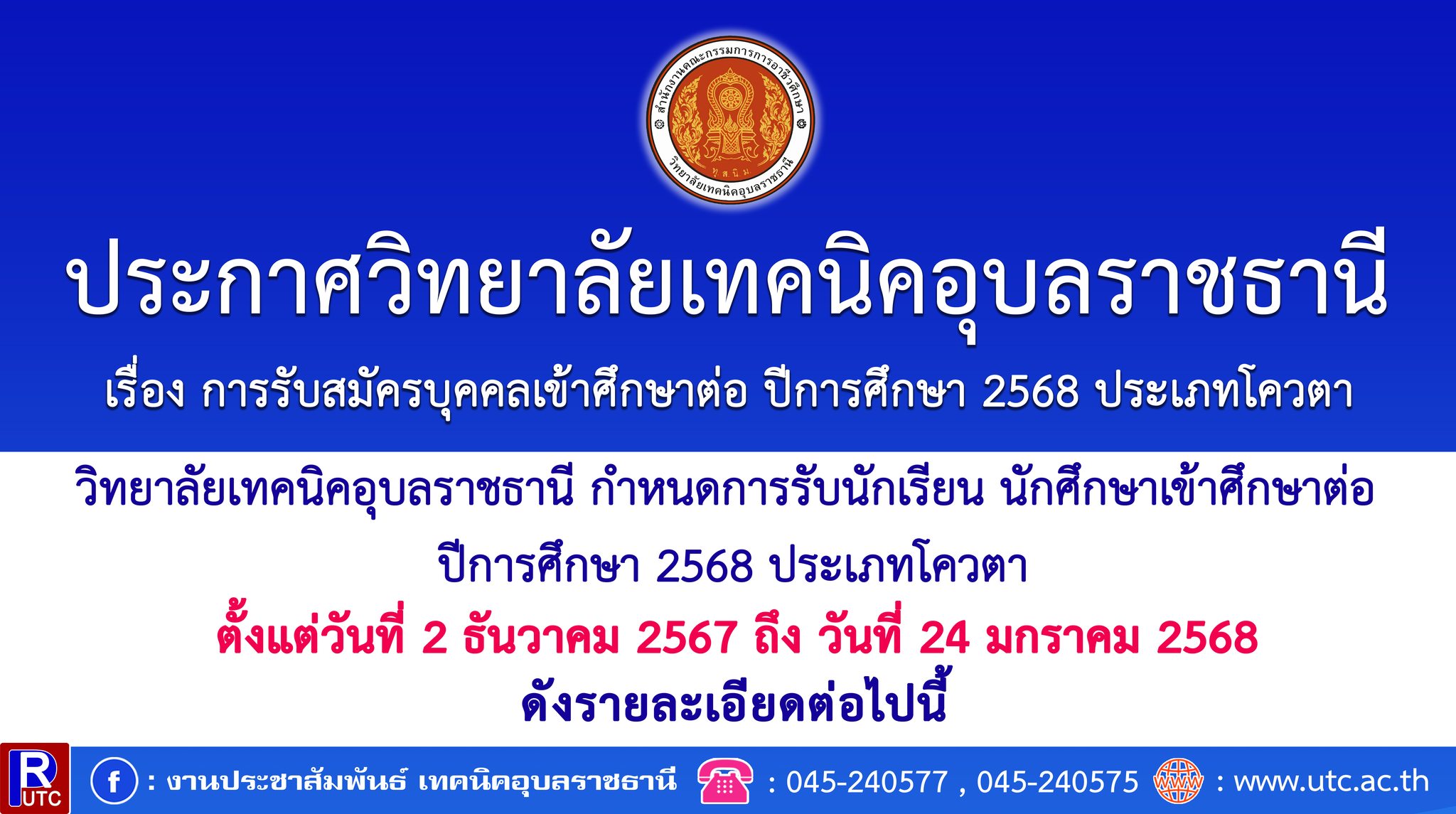 วิทยาลัยเทคนิคอุบลราชธานี กำหนดการรับนักเรียน นักศึกษาเข้าศึกษาต่อ ปีการศึกษา 2568 ประเภทโควตา
