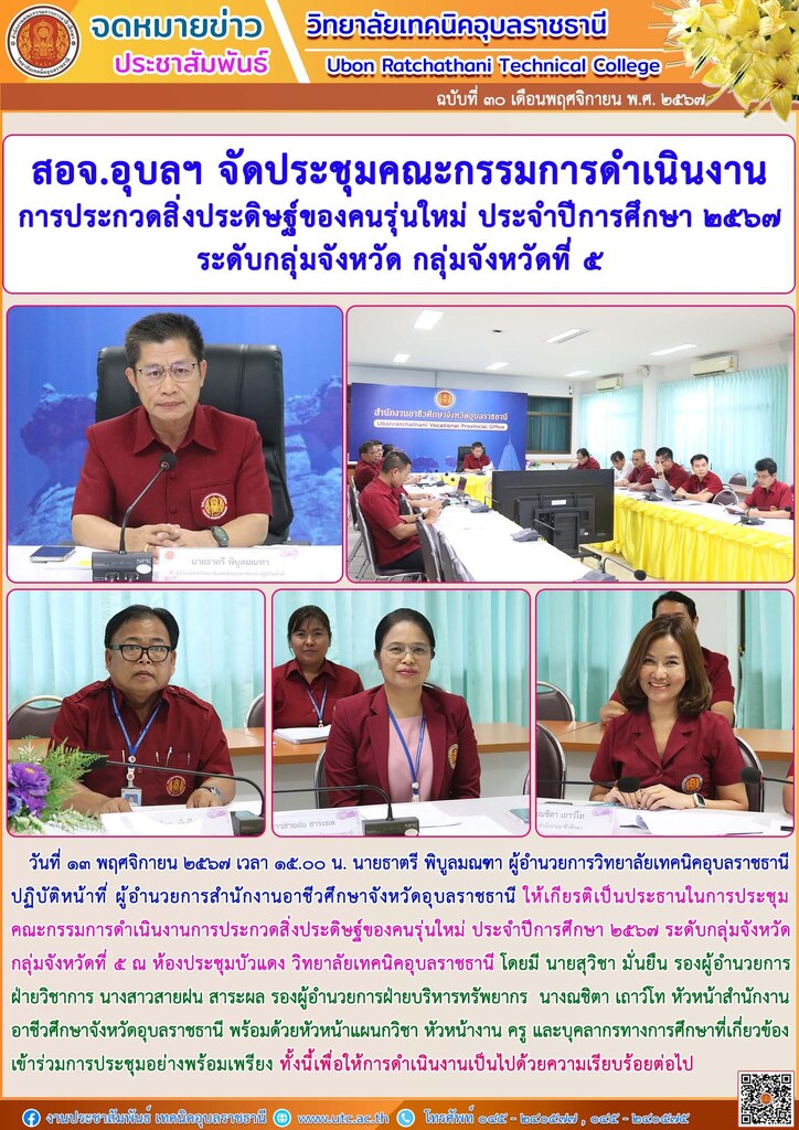 วันที่ ๑๔ พฤศจิกายน ๒๕๖๗ เวลา ๐๘.๓๐ น. นายธาตรี พิบูลมณฑา ผู้อำนวยการวิทยาลัยเทคนิคอุบลราชธานี พร้อมด้วย นายไวพจน์ ศรีธัญ รองผู้อำนวยการฝ่ายพัฒนา (เพิ่มเติม…)