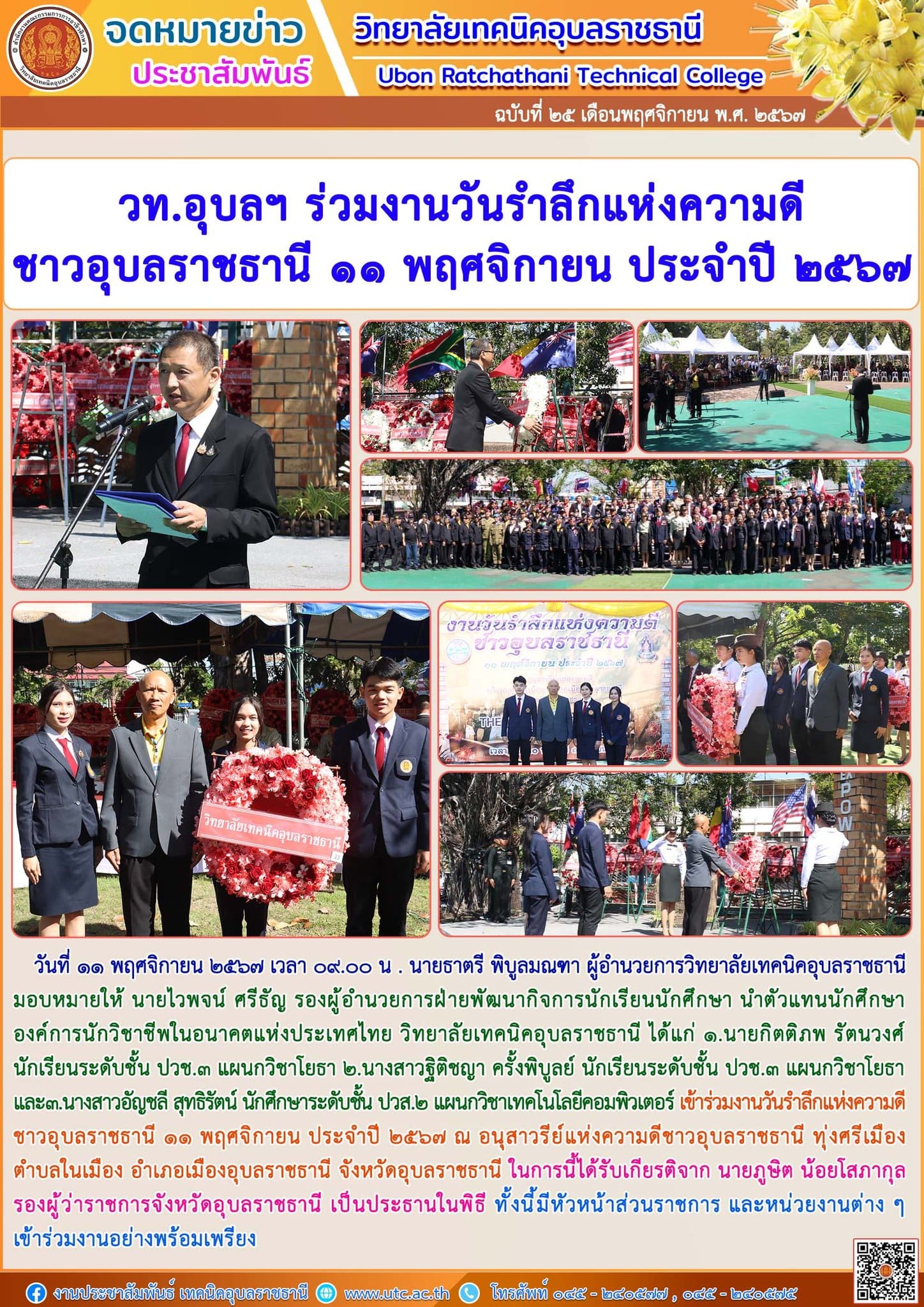 วันที่ ๑๑ พฤศจิกายน ๒๕๖๗ เวลา ๐๙.๐๐ น.นายธาตรี พิบูลมณฑา ผู้อำนวยการวิทยาลัยเทคนิคอุบลราชธานี มอบหมายให้ นายไวพจน์ (เพิ่มเติม…)
