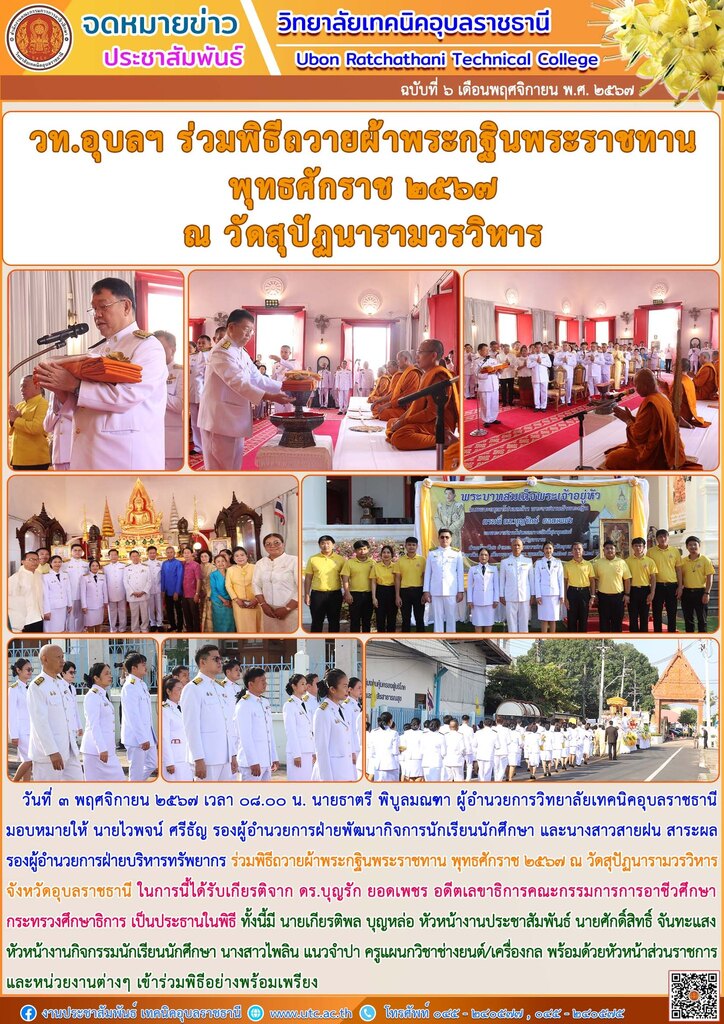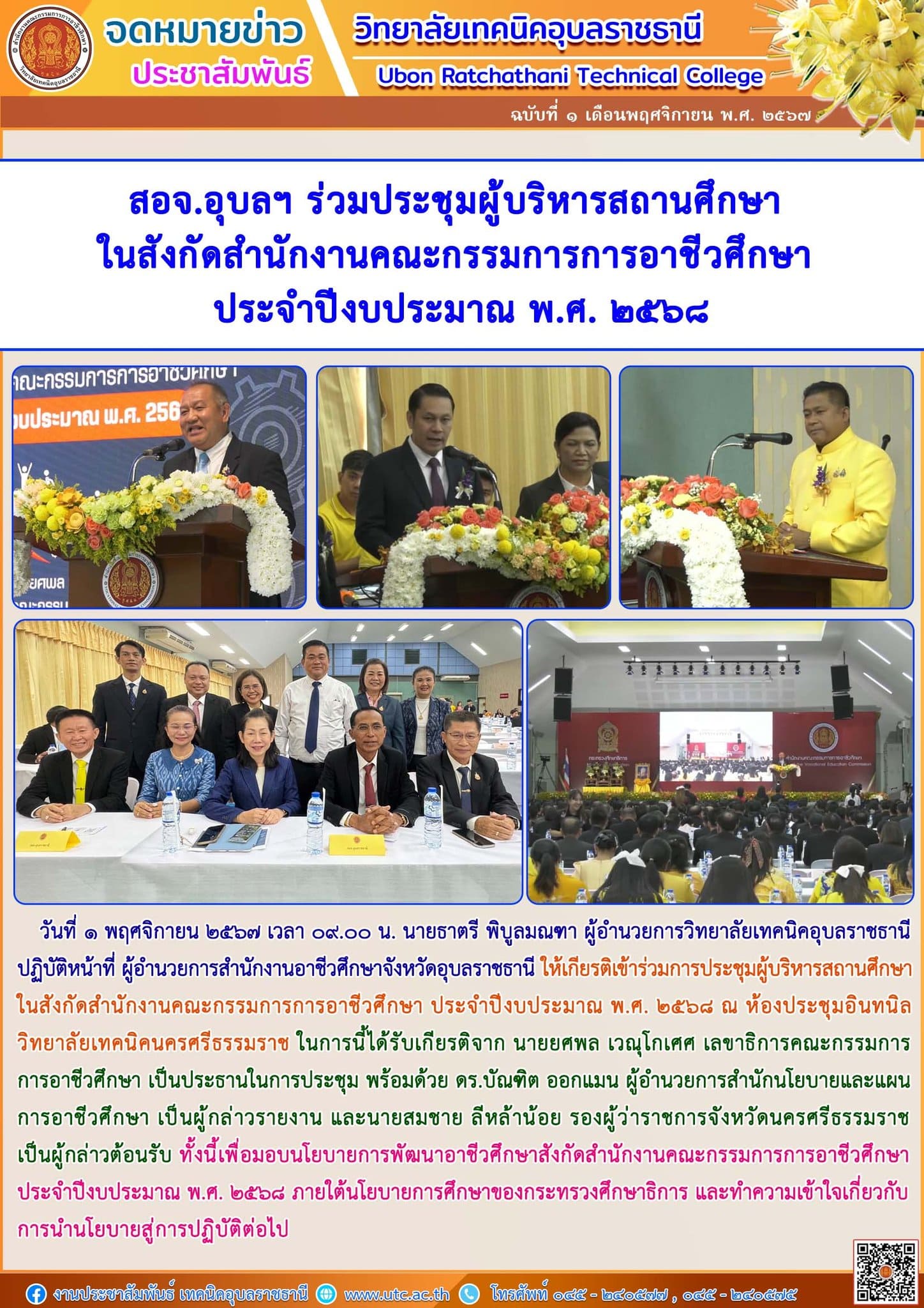 วันที่ ๑ พฤศจิกายน ๒๕๖๗ เวลา ๐๙.๐๐ น. นายธาตรี พิบูลมณฑา ผู้อำนวยการวิทยาลัยเทคนิคอุบลราชธานี ปฏิบัติหน้าที่ ผู้อำนวยการ (เพิ่มเติม…)