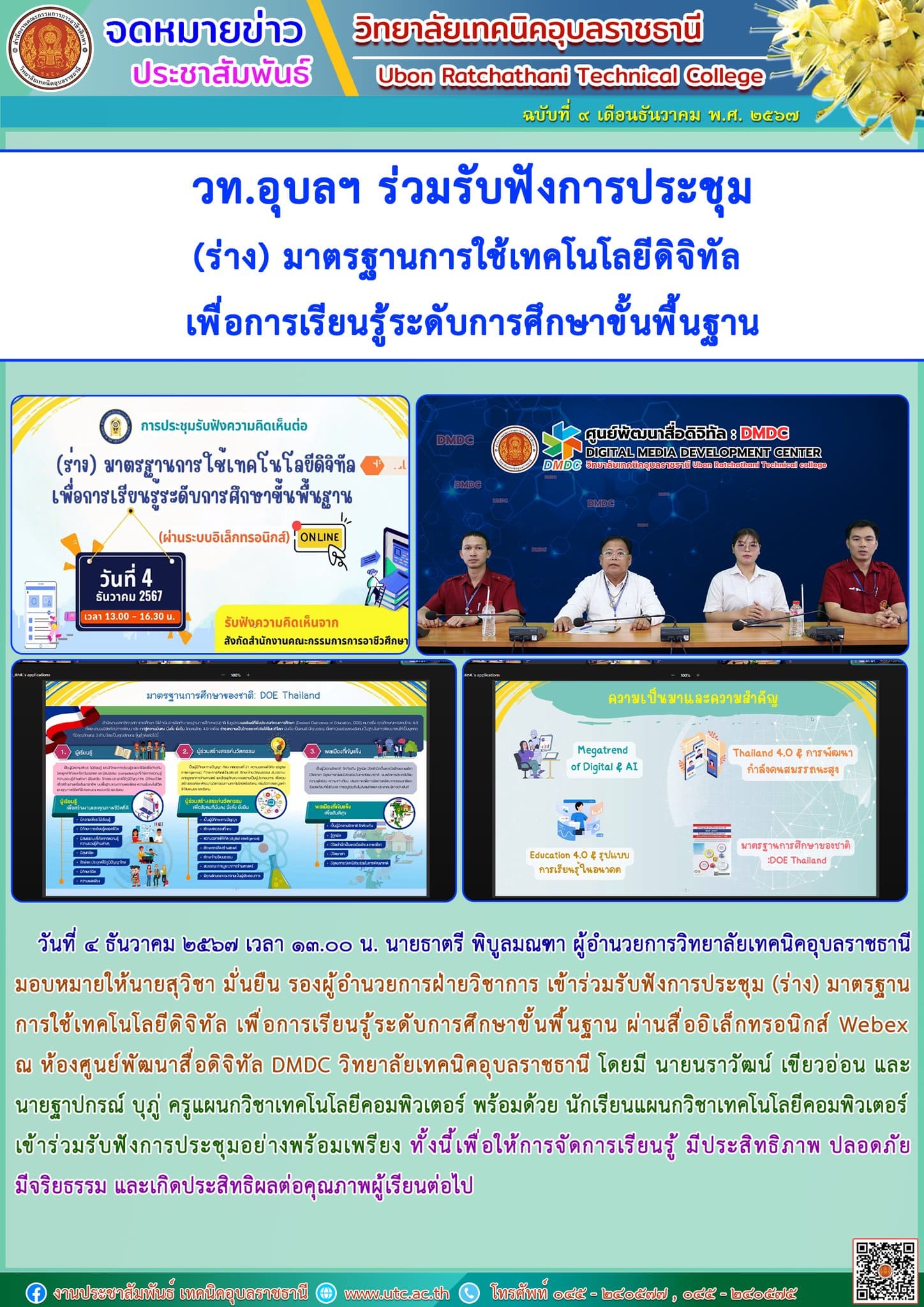 วันที่ ๔ ธันวาคม ๒๕๖๗ เวลา ๑๓.๐๐ น. นายธาตรี พิบูลมณฑา ผู้อำนวยการวิทยาลัยเทคนิคอุบลราชธานี มอบหมายให้นายสุวิชา มั่นยืน รองผู้อำนวยการฝ่ายวิชาการ เข้าร่วมรับฟังการประชุม (ร่าง) มาตรฐานการใช้เทคโน (เพิ่มเติม…)