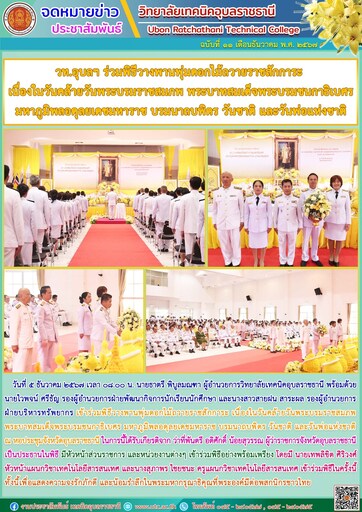 วท.อุบลฯ ร่วมพิธีวางพานพุ่มดอกไม้ถวายราชสักการะ เนื่องในวันคล้ายวันพระบรมราชสมภพ พระบาทสมเด็จพระบรมชนกาธิเบศร มหาภูมิพลอดุลยเดชมหาราช บรมนาถบพิตร วันชาติ และวันพ่อแห่งชาติ
