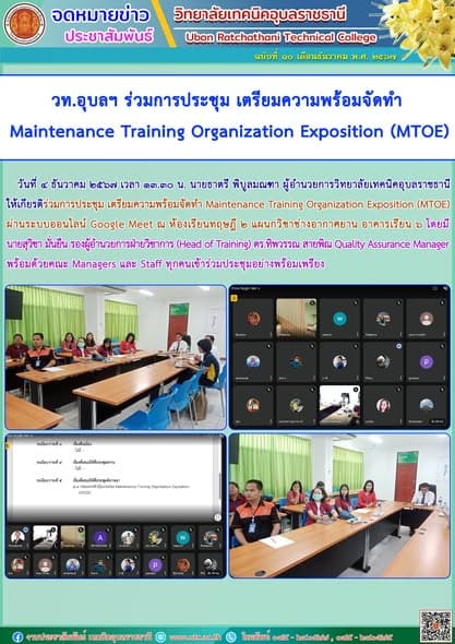 วันที่ ๔ ธันวาคม ๒๕๖๗ เวลา ๑๓.๓๐ น. นายธาตรี พิบูลมณฑา ผู้อำนวยการวิทยาลัยเทคนิคอุบลราชธานี ให้เกียรติร่วมการประชุม เตรียมความพร้อมจัดทำ Maintenance Training Organization Exposit (เพิ่มเติม…)