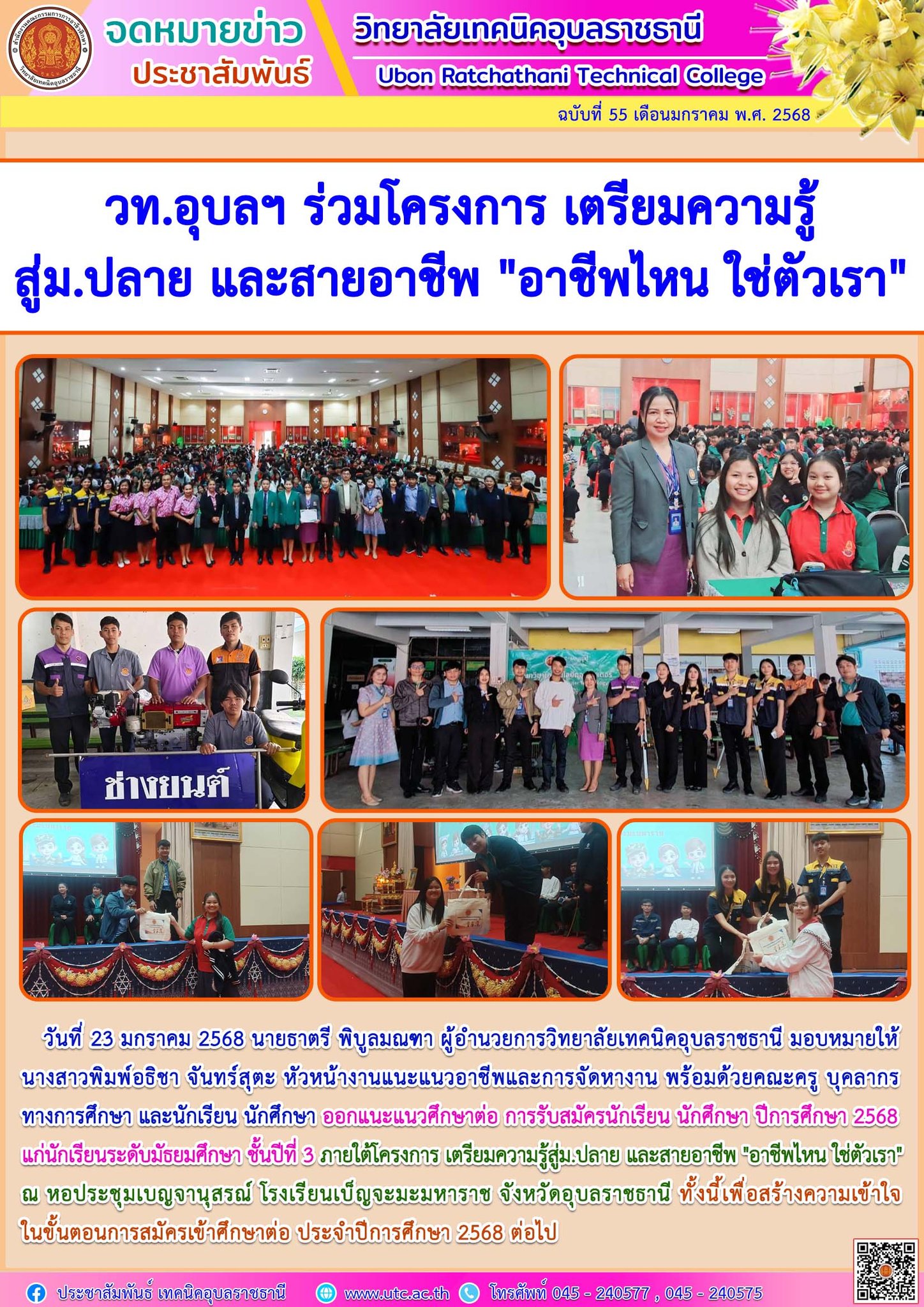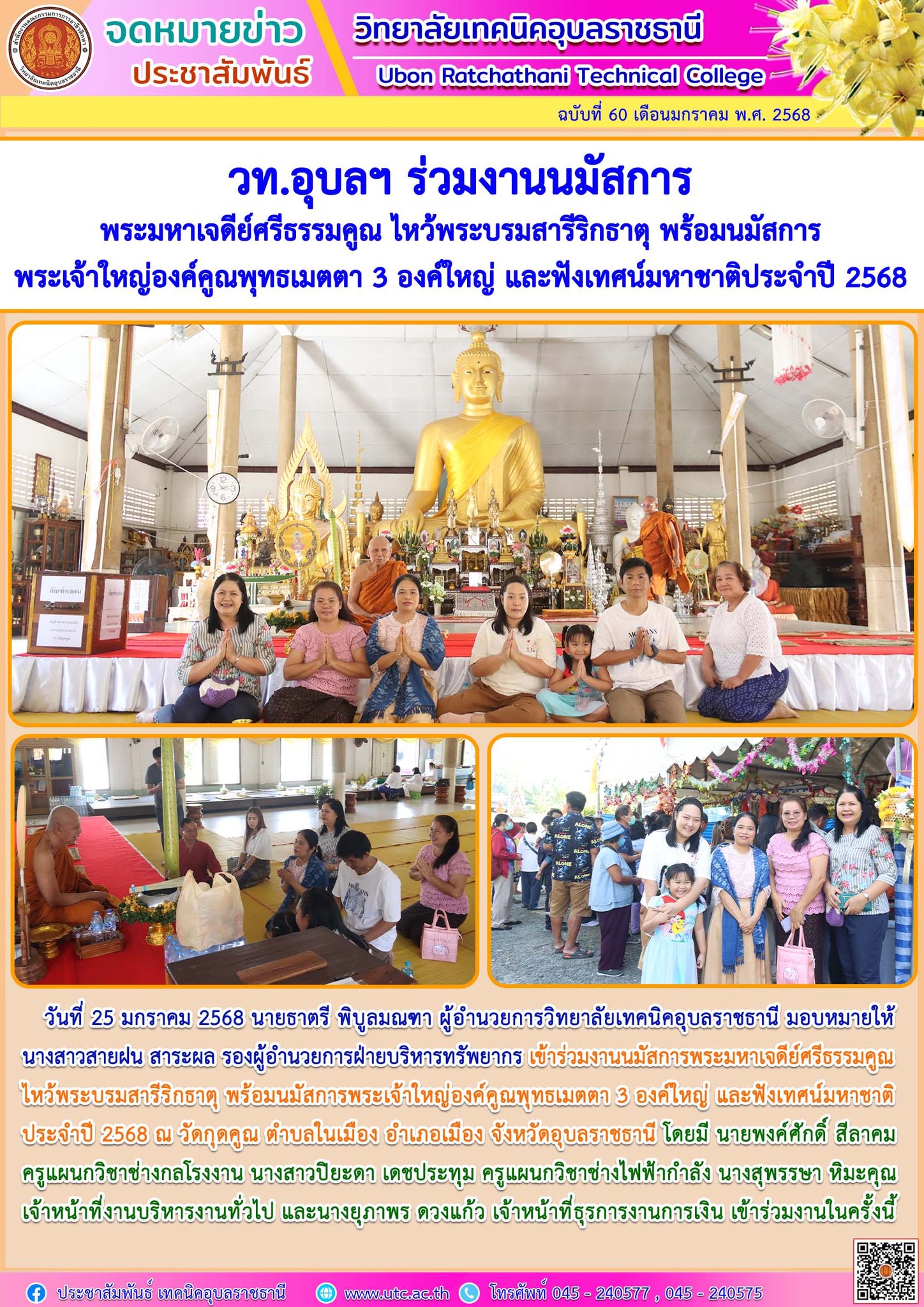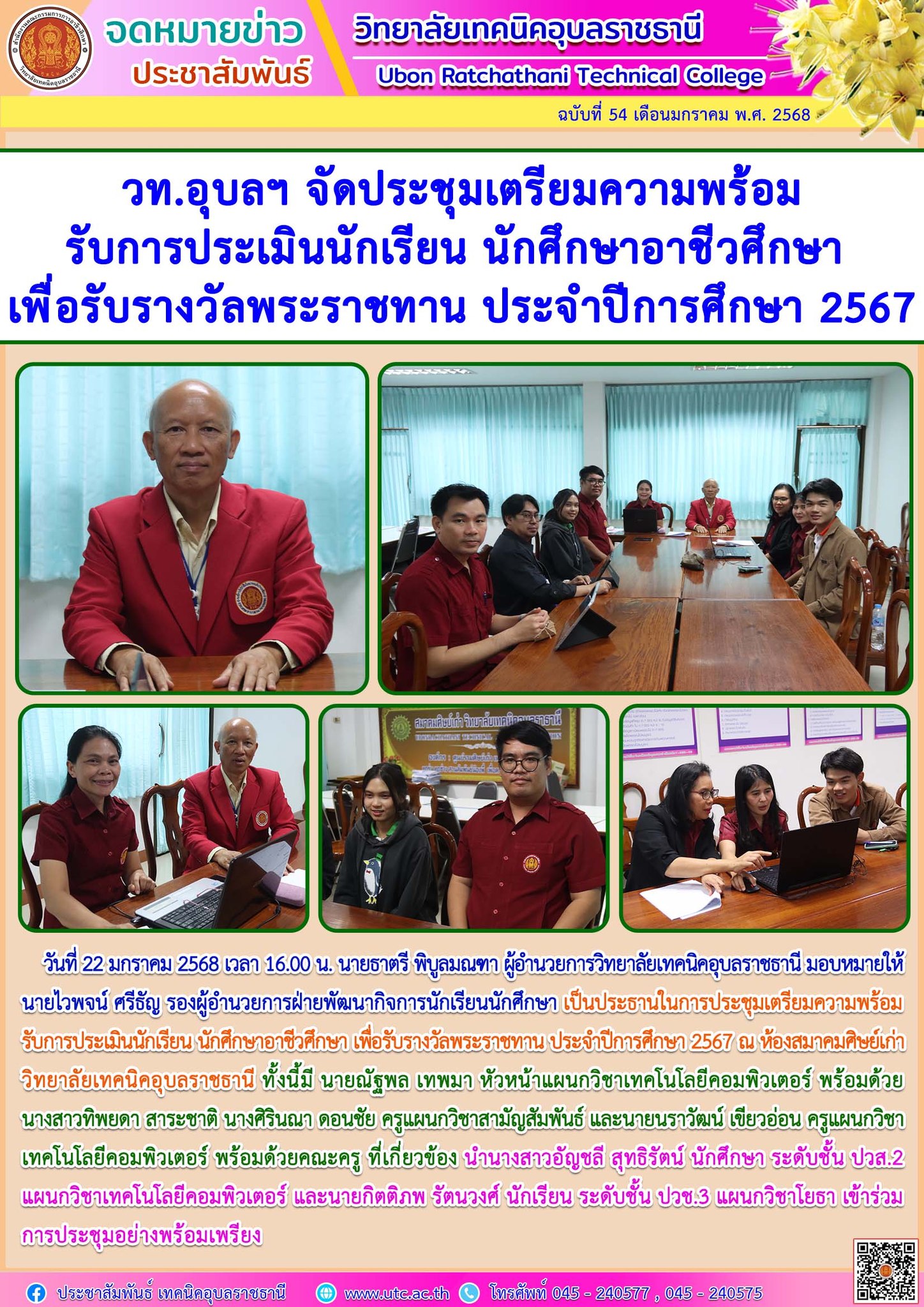 วันที่ 25 มกราคม 2568 นายธาตรี พิบูลมณฑา ผู้อำนวยการวิทยาลัยเทคนิคอุบลราชธานี มอบหมายให้ นายไวพจน์ ศรีธัญ รองผู้อำนวยการฝ่ายพัฒนากิจการนักเรียน (เพิ่มเติม…)
