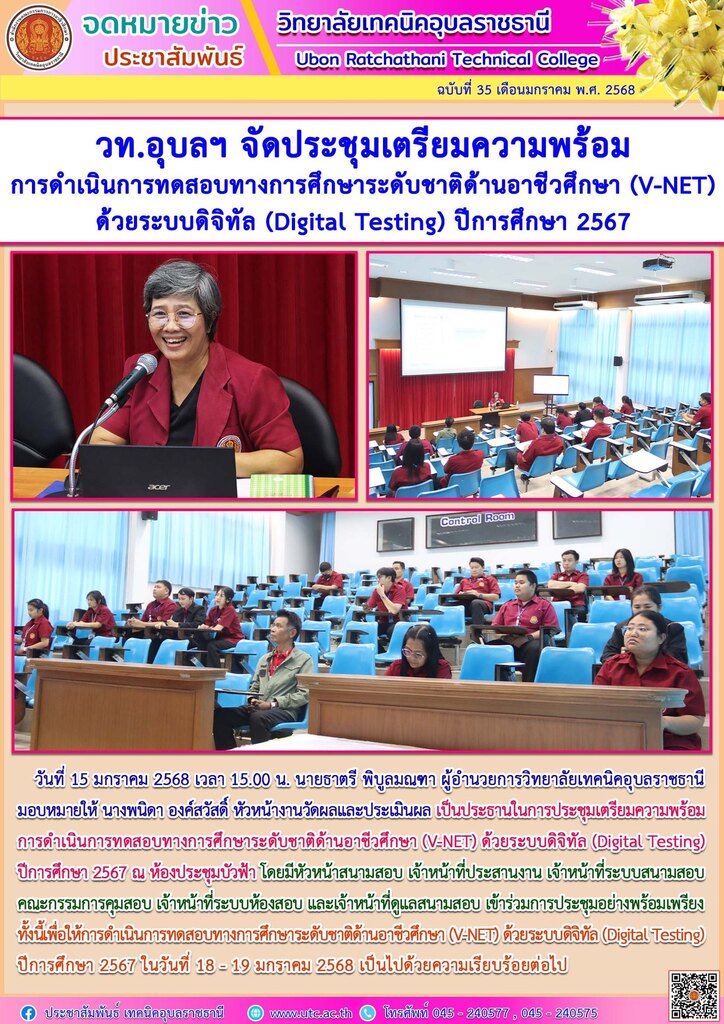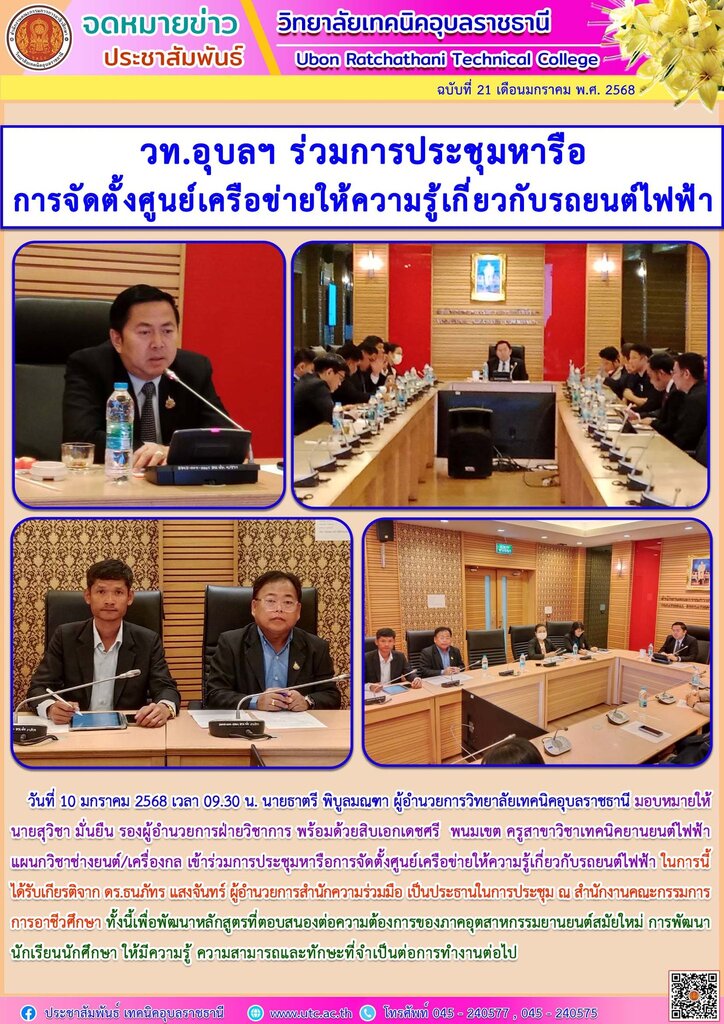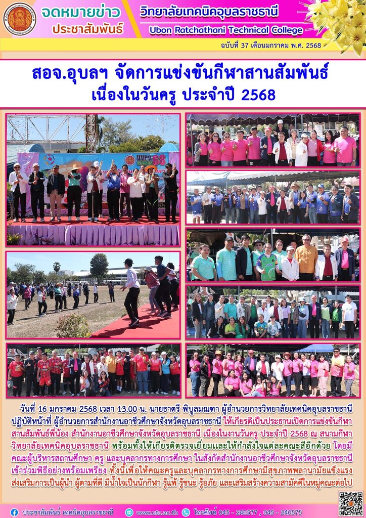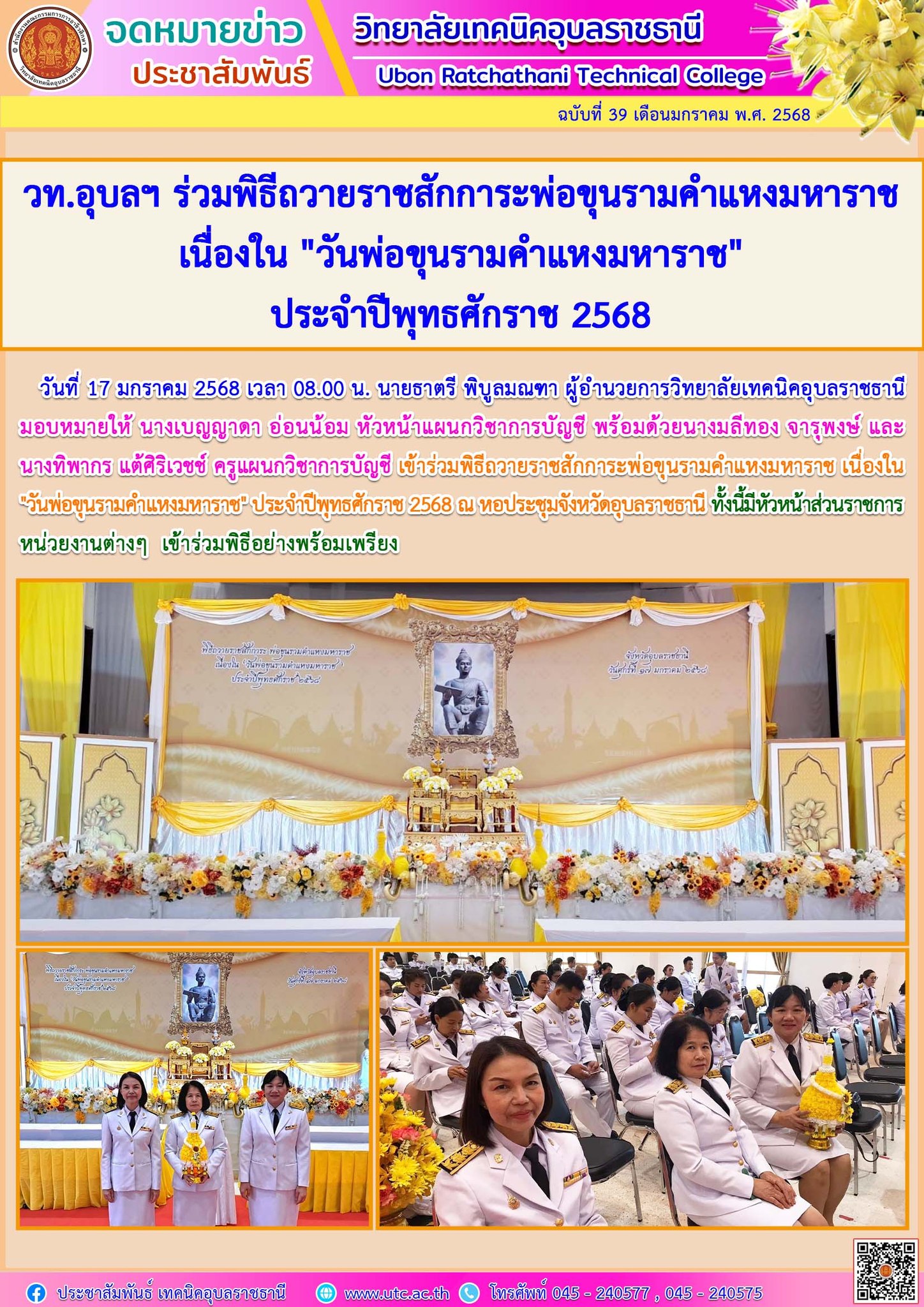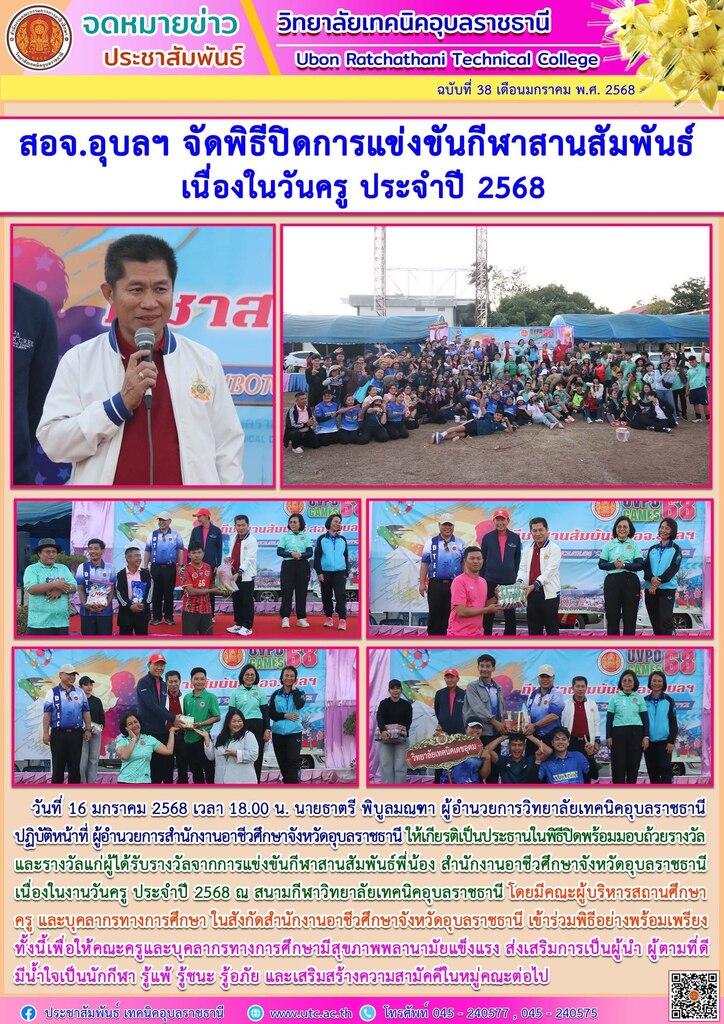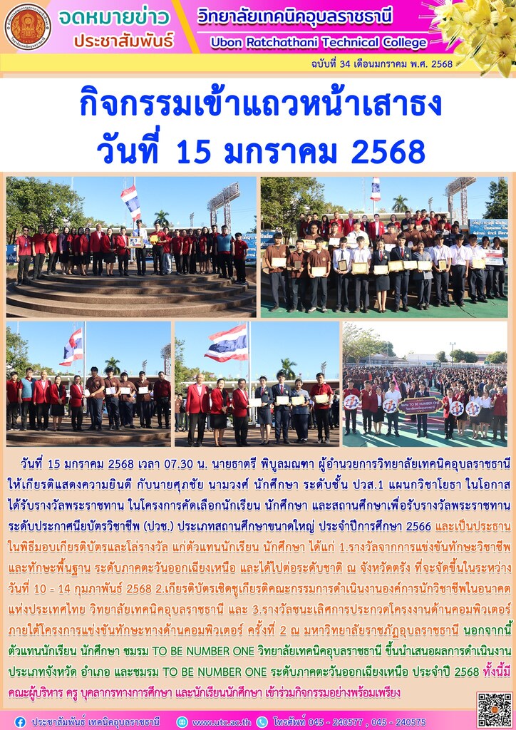 วันที่ 15 มกราคม 2568 เวลา 07.30 น. นายธาตรี พิบูลมณฑา ผู้อำนวยการวิทยาลัยเทคนิคอุบลราชธานี ให้เกียรติแสดงความยินดี กับนายศุภชัย นามวงศ์ นักศึกษา ระดับชั้น ปวส.1 แผนกวิชาโยธา ในโอกาสได้รับรางวัลพระราชทาน ในโครงการคัดเลือกนักเรียน นักศึกษา และสถานศึกษาเพื่อรับรางวัลพระราชทาน ระดับประกาศนียบัตรวิชาชีพ (ปวช.) ประเภทสถานศึกษาขนาดใหญ่ ประจำปีการศึกษา 2566 และเป็นประธานในพิธีมอบเกียรติบัตรและโล่รางวัล แก่ตัวแทนนักเรียน นักศึกษา ได้แก่ 1.รางวัลจากการแข่งขันทักษะวิชาชีพและทักษะพื้นฐาน ระดับภาคตะวันออกเฉียงเหนือ และได้ไปต่อระดับชาติ ณ จังหวัดตรัง ที่จะจัดขึ้นในระหว่างวันที่ 10 – 14 กุมภาพันธ์ 2568 2.เกียรติบัตรเชิดชูเกียรติคณะกรรมการดำเนินงานองค์การนักวิชาชีพในอนาคตแห่งประเทศไทย วิทยาลัยเทคนิคอุบลราชธานี และ 3.รางวัลชนะเลิศการประกวดโครงงานด้านคอมพิวเตอร์ ภายใต้โครงการแข่งขันทักษะทางด้านคอมพิวเตอร์ ครั้งที่ 2 ณ มหาวิทยาลัยราชภัฏอุบลราชธานี นอกจากนี้ ตัวแทนนักเรียน นักศึกษา ชมรม TO BE NUMBER ONE วิทยาลัยเทคนิคอุบลราชธานี ขึ้นนำเสนอผลการดำเนินงานประเภทจังหวัด อำเภอ และชมรม TO BE NUMBER ONE ระดับภาคตะวันออกเฉียงเหนือ ประจำปี 2568 ทั้งนี้มีคณะผู้บริหาร ครู บุคลากรทางการศึกษา และนักเรียนนักศึกษา เข้าร่วมกิจกรรมอย่างพร้อมเพรียง