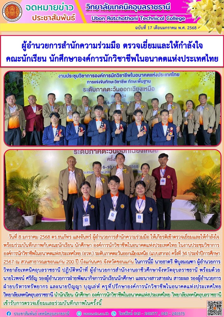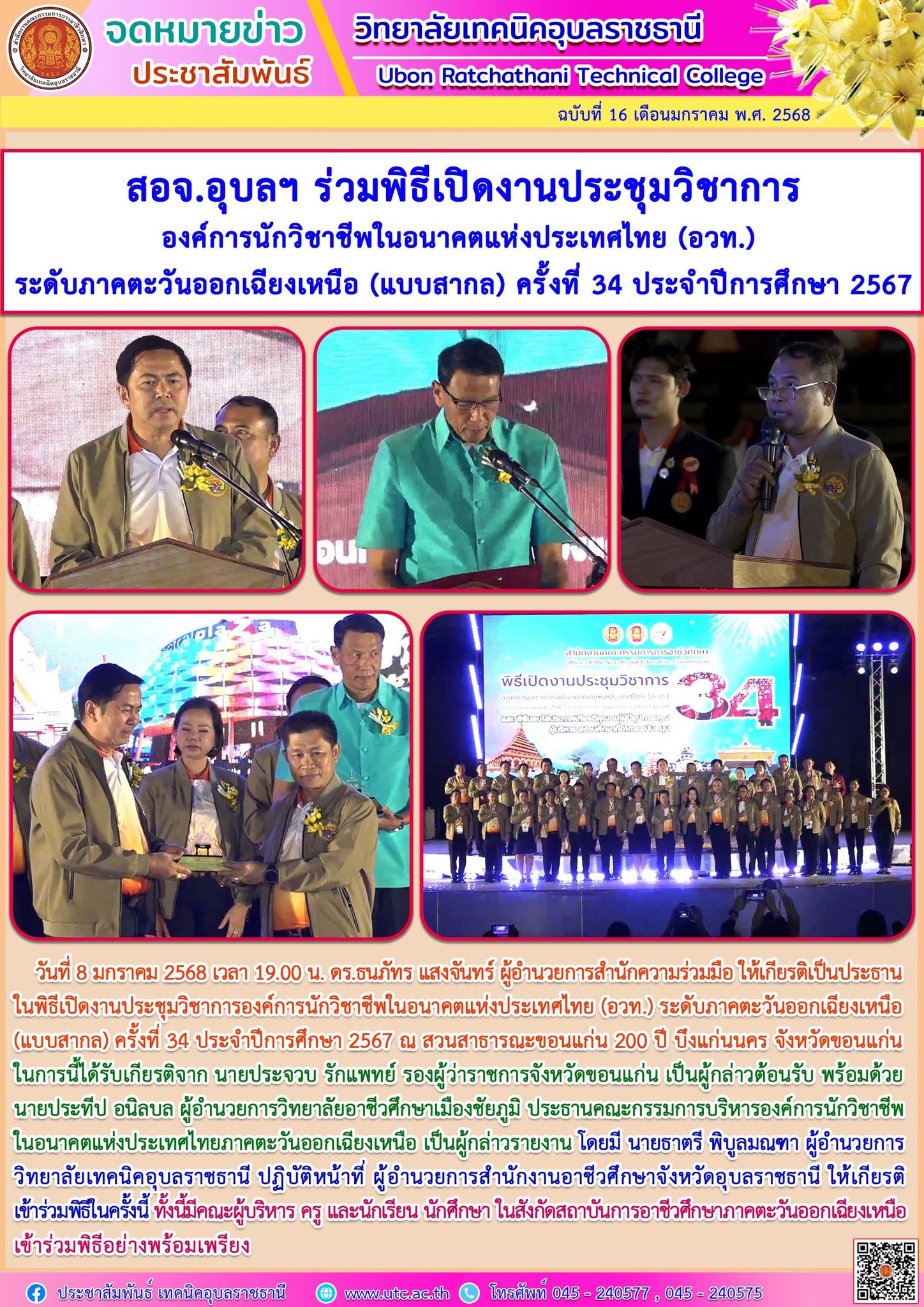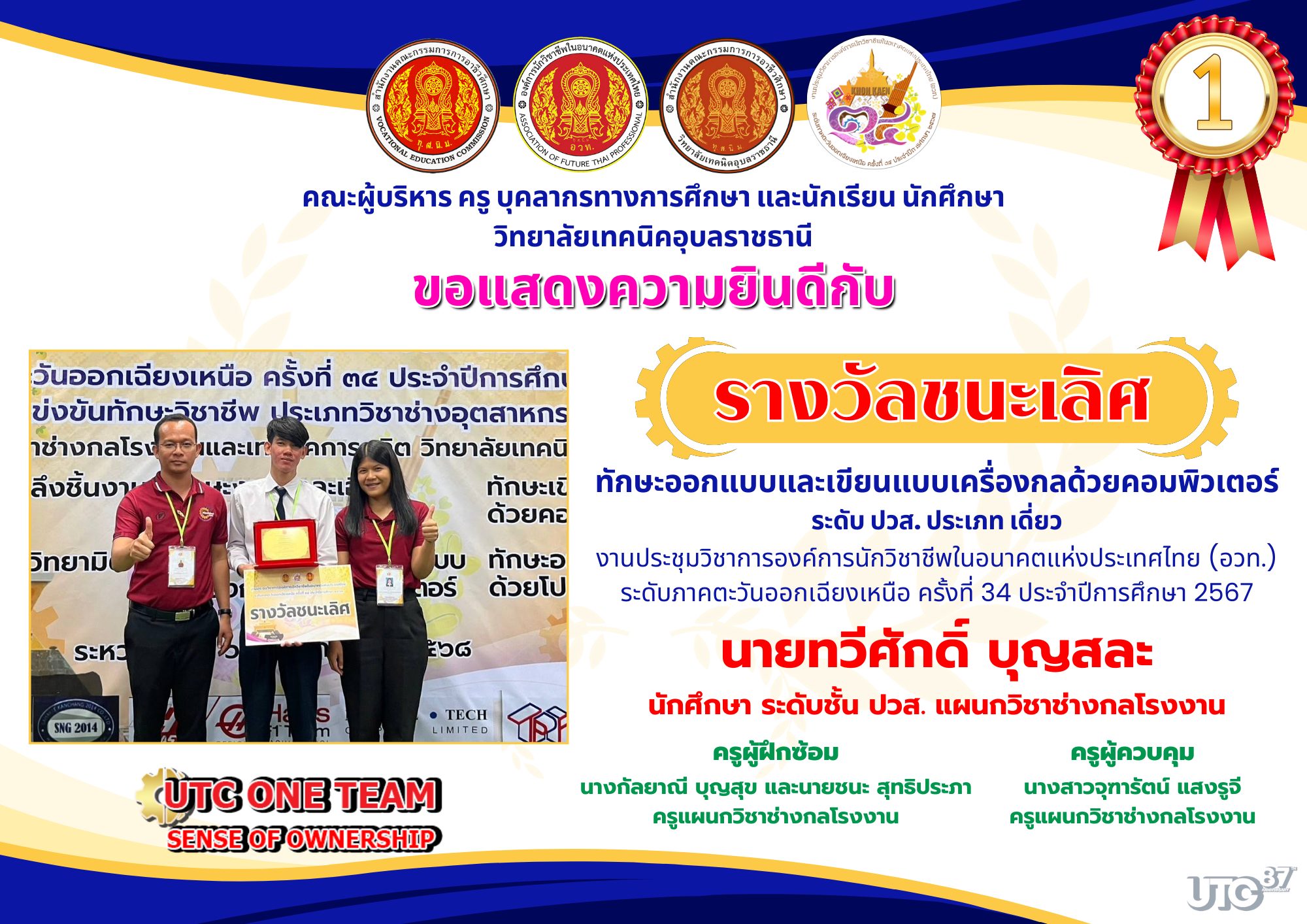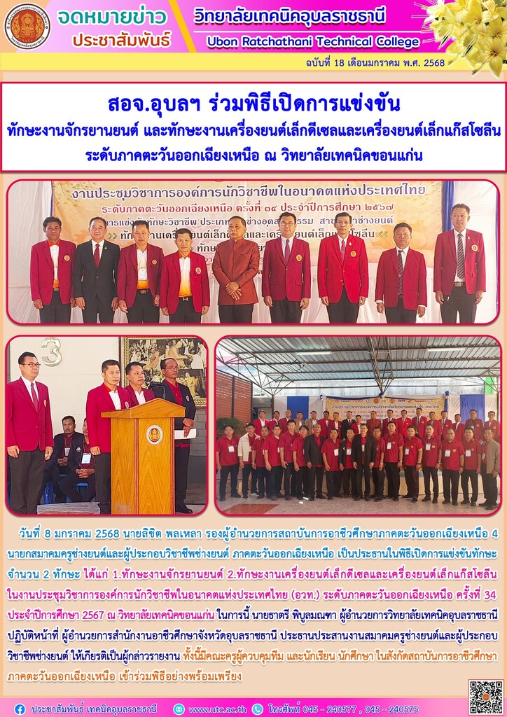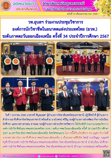 คณะผู้บริหาร ครู บุคลากรทางการศึกษา และนักเรียนนักศึกษา วิทยาลัยเทคนิคอุบลราชธานี ขอแสดงความยินดีกับการแข่งขันทักษะ ระดับภาคตะวันออกเฉียงเหนือ ครั้งที่ 34 ประจำปีการศึกษา 2567