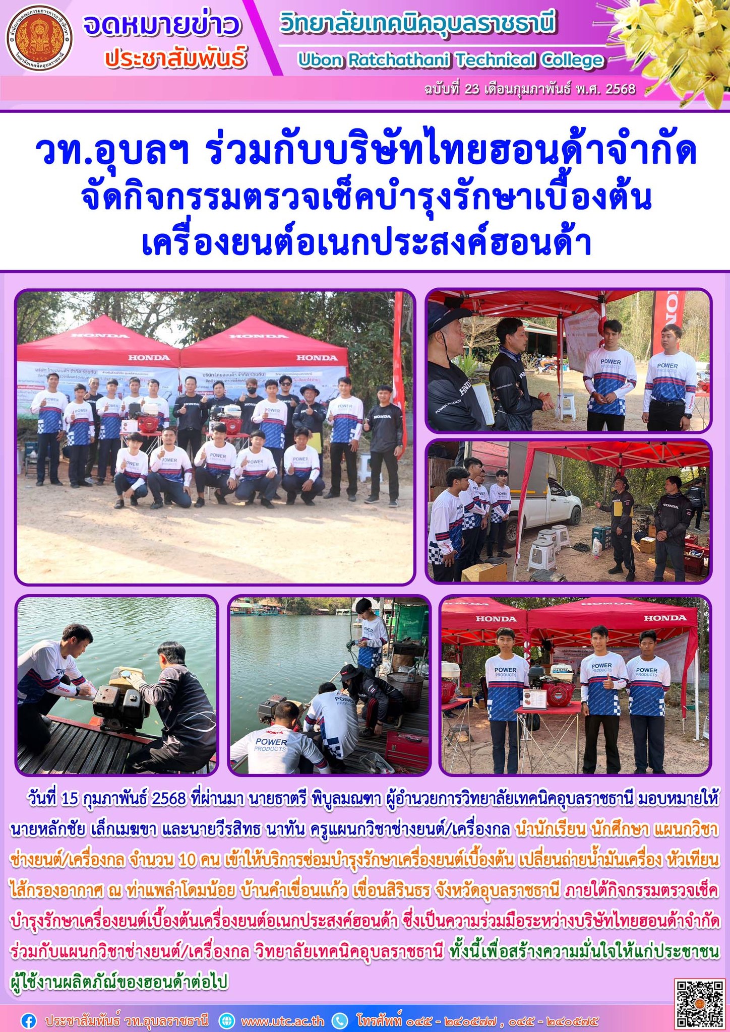 วิทยาลัยเทคนิคอุบลราชธานีร่วมกับร่วมมือระหว่างบริษัทไทยฮอนด้าจำกัด จัดกิจกรรมซ่อมบำรุง เครื่องยนต์อเนกประสงค์ฮอนด้า