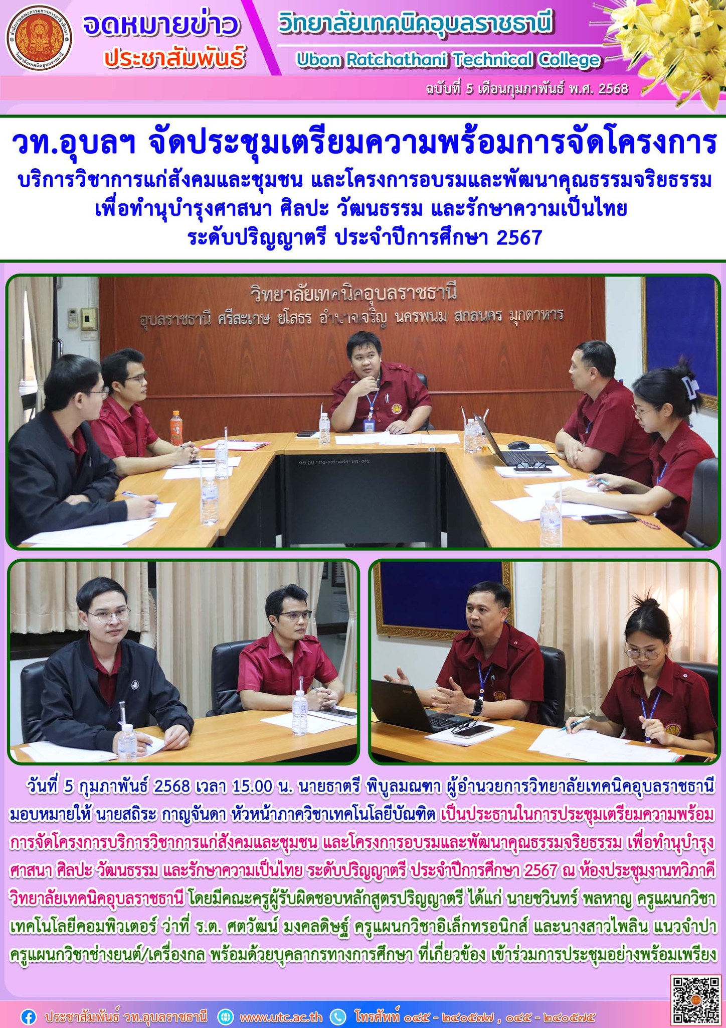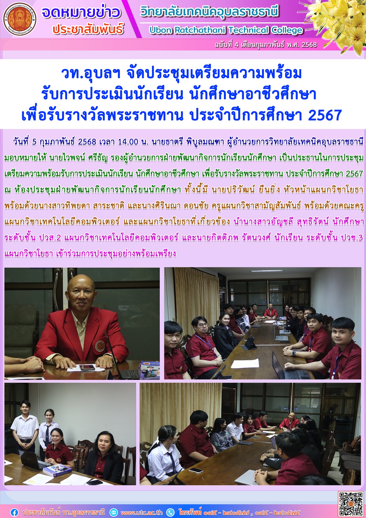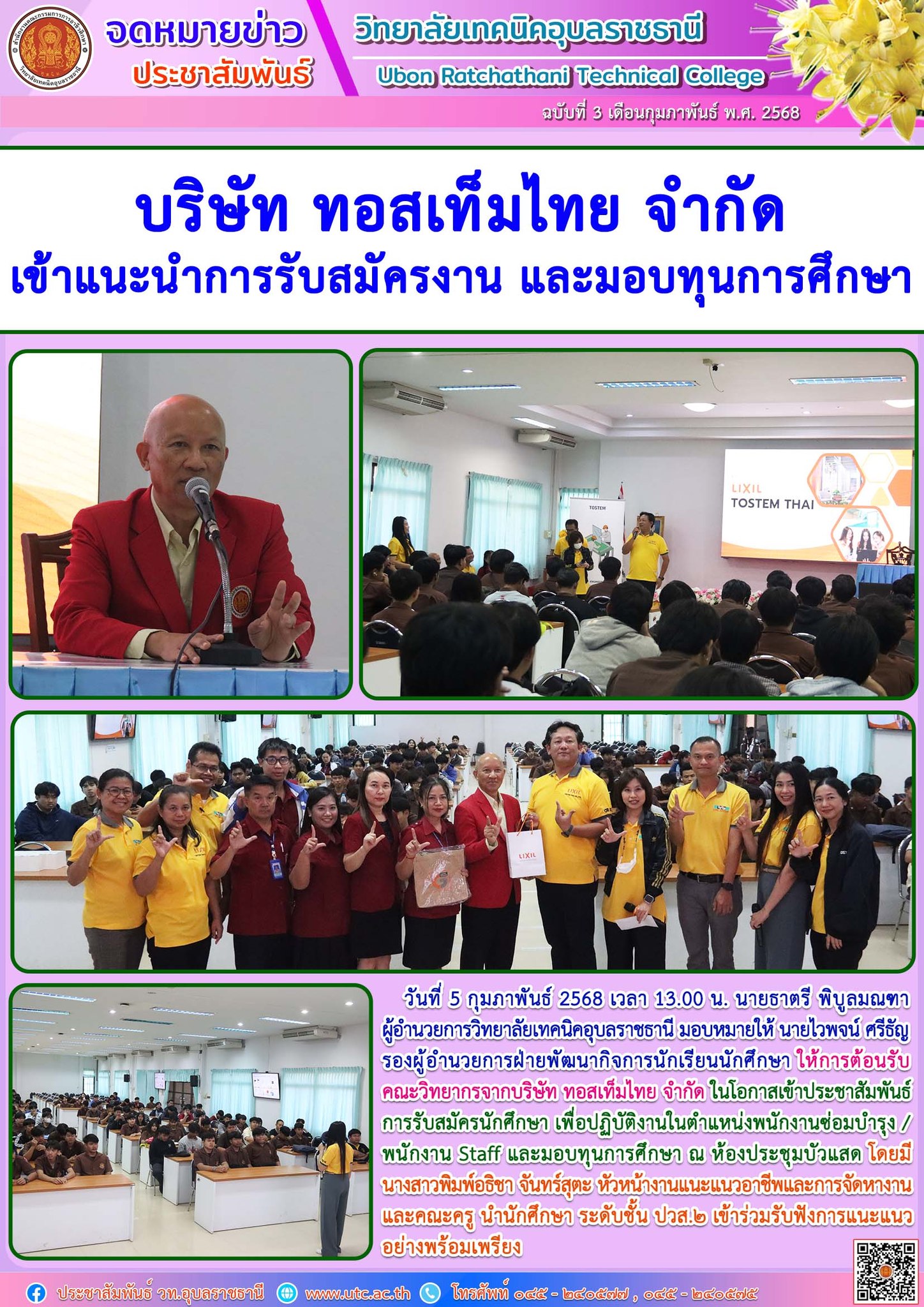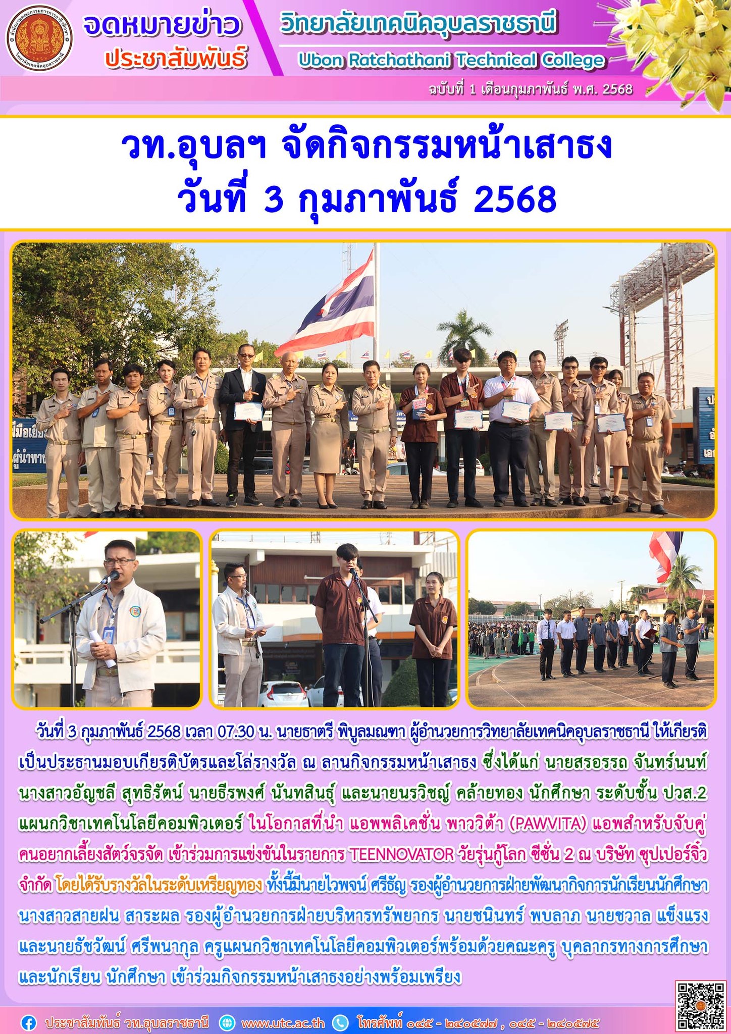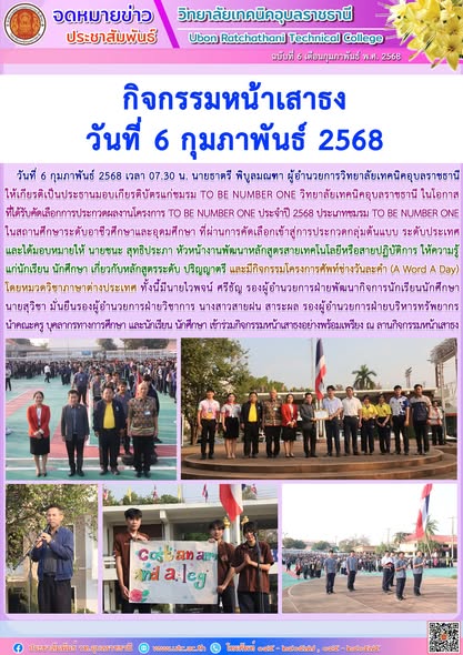วันที่ 6 กุมภาพันธ์ 2568 เวลา 07.30 น. นายธาตรี พิบูลมณฑา ผู้อำนวยการวิทยาลัยเทคนิคอุบลราชธานีให้เกียรติเป็นประธานมอบเกียรติบัตรแก่ชมรม TO BE NUMBER ONE วิทยาลัยเทคนิคอุบลราชธานี ในโอกาสที่ได้รับคัดเลือกการประกวดผลงานโครงการ TO BE NUMBER ONE ประจำปี 2568 ประเภทชมรม TO BE NUMBER ONEในสถานศึกษาระดับอาชีวศึกษาและอุดมศึกษา ที่ผ่านการคัดเลือกเข้าสู่การประกวดกลุ่มต้นแบบ ระดับประเทศและได้มอบหมายให้ นายชนะ สุทธิประภา หัวหน้างานพัฒนาหลักสูตรสายเทคโนโลยีหรือสายปฏิบัติการ ให้ความรู้แก่นักเรียน นักศึกษา เกี่ยวกับหลักสูตรระดับ ปริญญาตรี และมีกิจกรรมโครงการศัพท์ช่างวันละคำ (A Word A Day)โดยหมวดวิชาภาษาต่างประเทศ ทั้งนี้มีนายไวพจน์ ศรีธัญ รองผู้อำนวยการฝ่ายพัฒนากิจการนักเรียนนักศึกษา นายสุวิชา มั่นยืนรองผู้อำนวยการฝ่ายวิชาการ นางสาวสายฝน สาระผล รองผู้อำนวยการฝ่ายบริหารทรัพยากร นำคณะครู บุคลากรทางการศึกษา และนักเรียน นักศึกษา เข้าร่วมกิจกรรมหน้าเสาธงอย่างพร้อมเพรียง ณ ลานกิจกรรมหน้าเสาธง