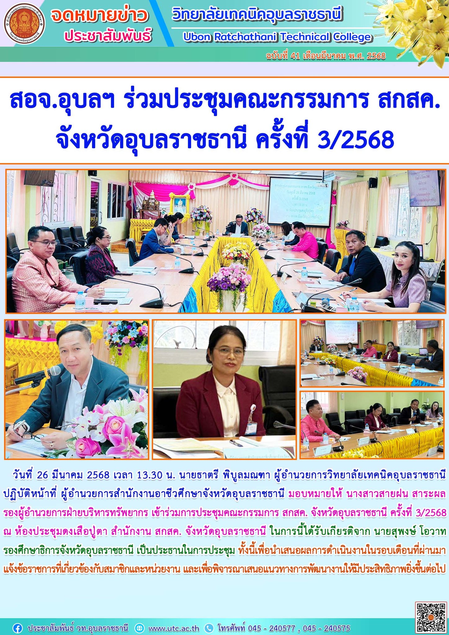 วันที่ 26 มีนาคม 2568 เวลา 13.30 น. นายธาตรี พิบูลมณฑา ผู้อำนวยการวิทยาลัยเทคนิคอุบลราชธานี ปฏิบัติหน้าที่ ผู้อำนวยการสำนักงานอาชีวศึกษาจังหวัดอุบลราชธานี มอบหมายให้ นางสาวสายฝน สาระผล (เพิ่มเติม…)