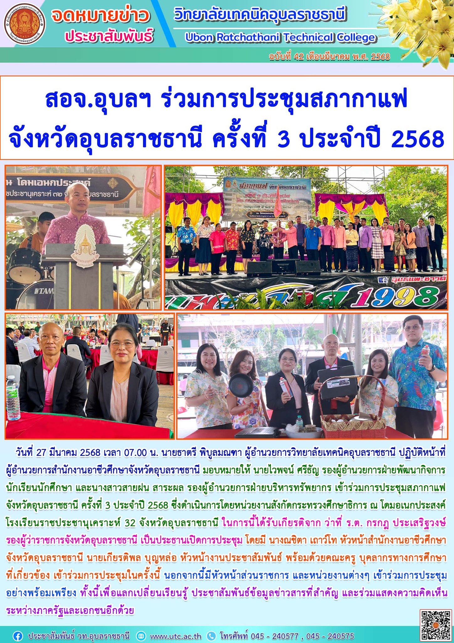 วันที่ 27 มีนาคม 2568 เวลา 07.00 น. นายธาตรี พิบูลมณฑา ผู้อำนวยการวิทยาลัยเทคนิคอุบลราชธานี ปฏิบัติหน้าที่ ผู้อำนวยการสำนักงานอาชีวศึกษาจังหวัดอุบลราชธานี มอบหมายให้ นายไวพจน์ ศรีธัญ รองผู้อำ (เพิ่มเติม…)