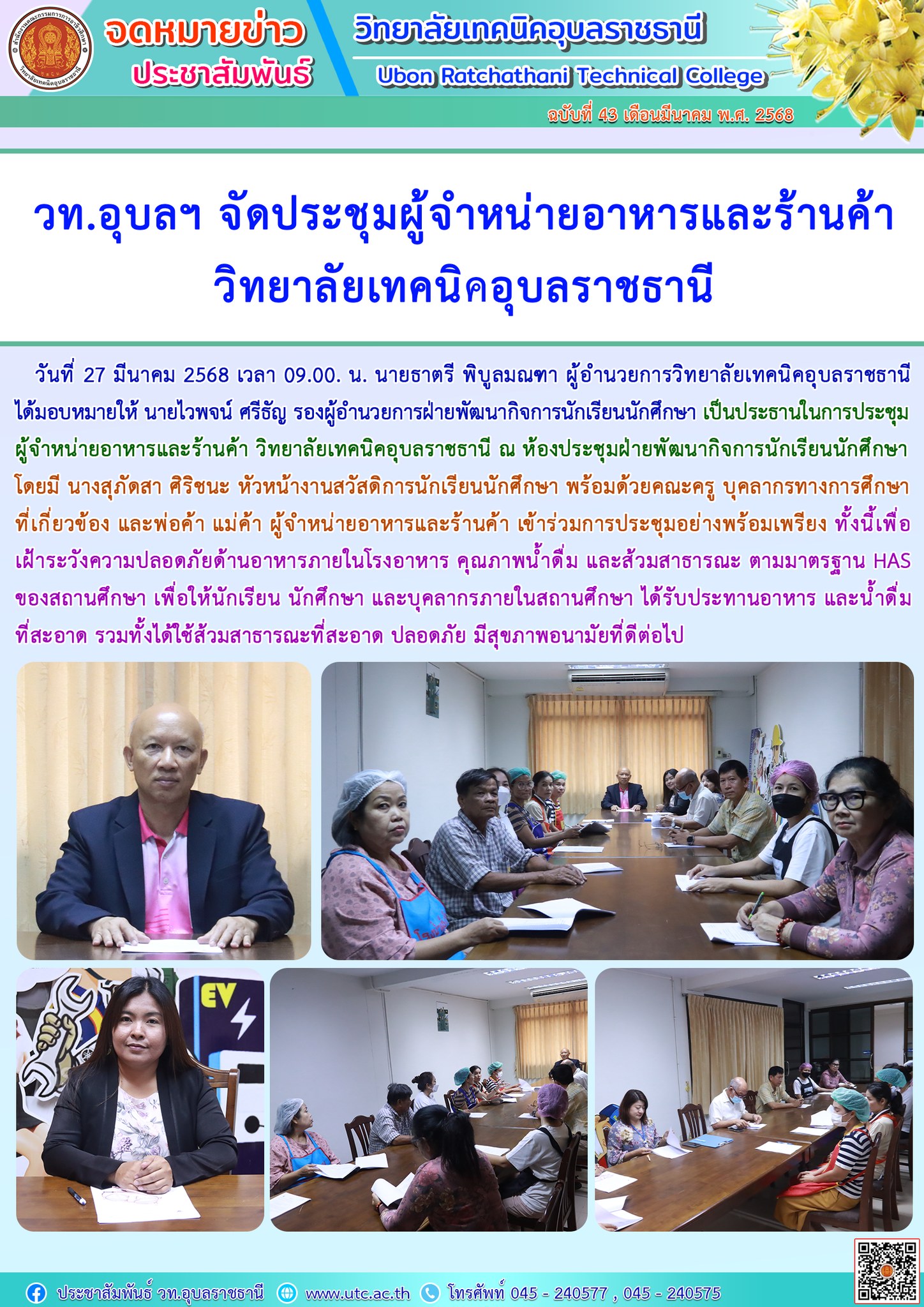 วันที่ 27 มีนาคม 2568 เวลา 09.00. น. นายธาตรี พิบูลมณฑา ผู้อำนวยการวิทยาลัยเทคนิคอุบลราชธานี ได้มอบหมายให้ นายไวพจน์ ศรีธัญ รองผู้อำนวยการฝ่ายพัฒนากิจการนักเรียนนักศึกษา เป็นประธานในการประชุมผู้จำหน่ายอาหารและร้านค้า (เพิ่มเติม…)
