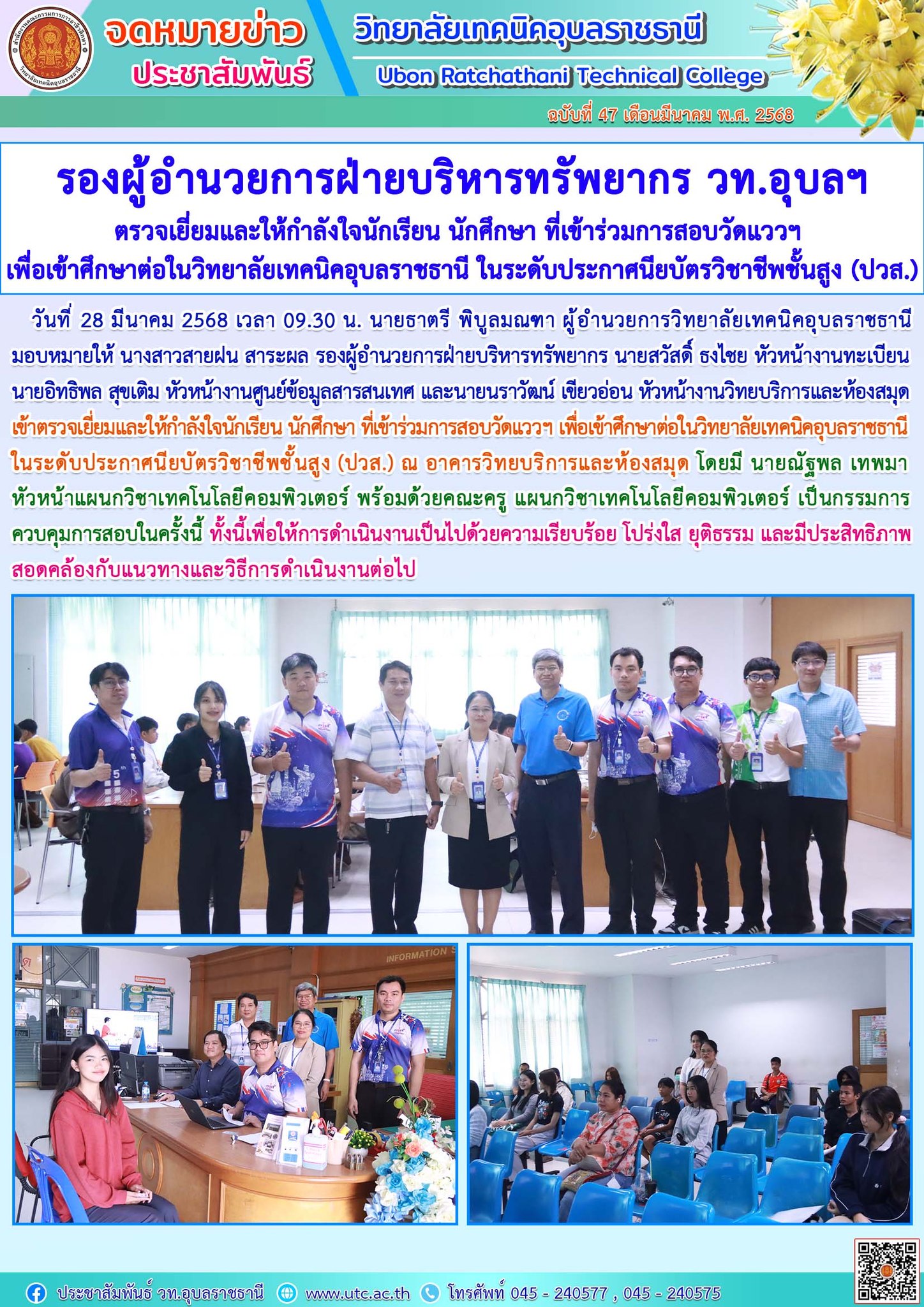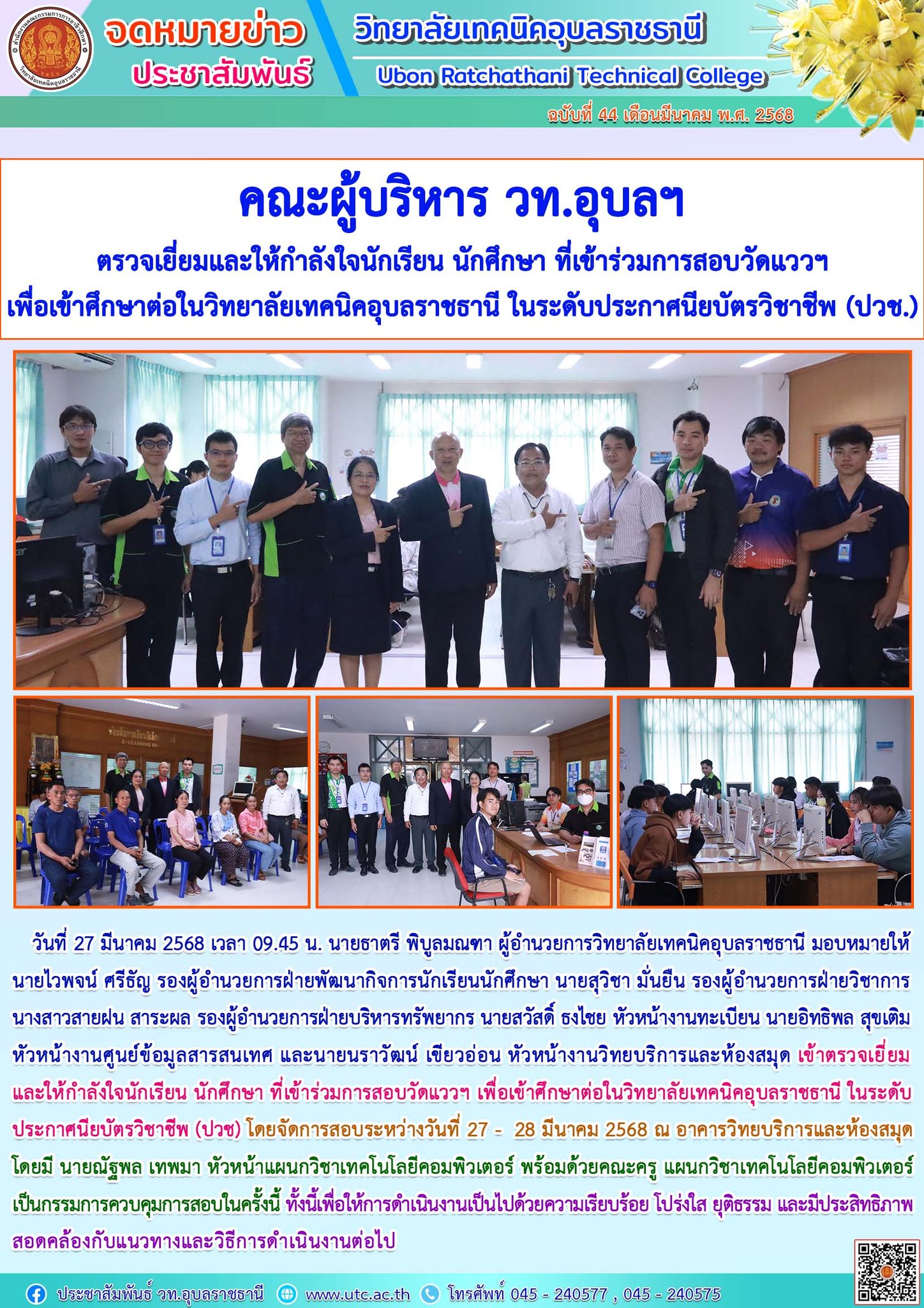 รองผู้อำนวยการ วท.อุบลฯ ตรวจเยี่ยมและให้กำลังใจนักเรียน นักศึกษา ที่เข้าร่วมการสอบวัดแววฯ เพื่อเข้าศึกษาต่อในวิทยาลัยเทคนิคอุบลราชธานี ในระดับประกาศนียบัตรวิชาชีพชั้นสูง (ปวส.)