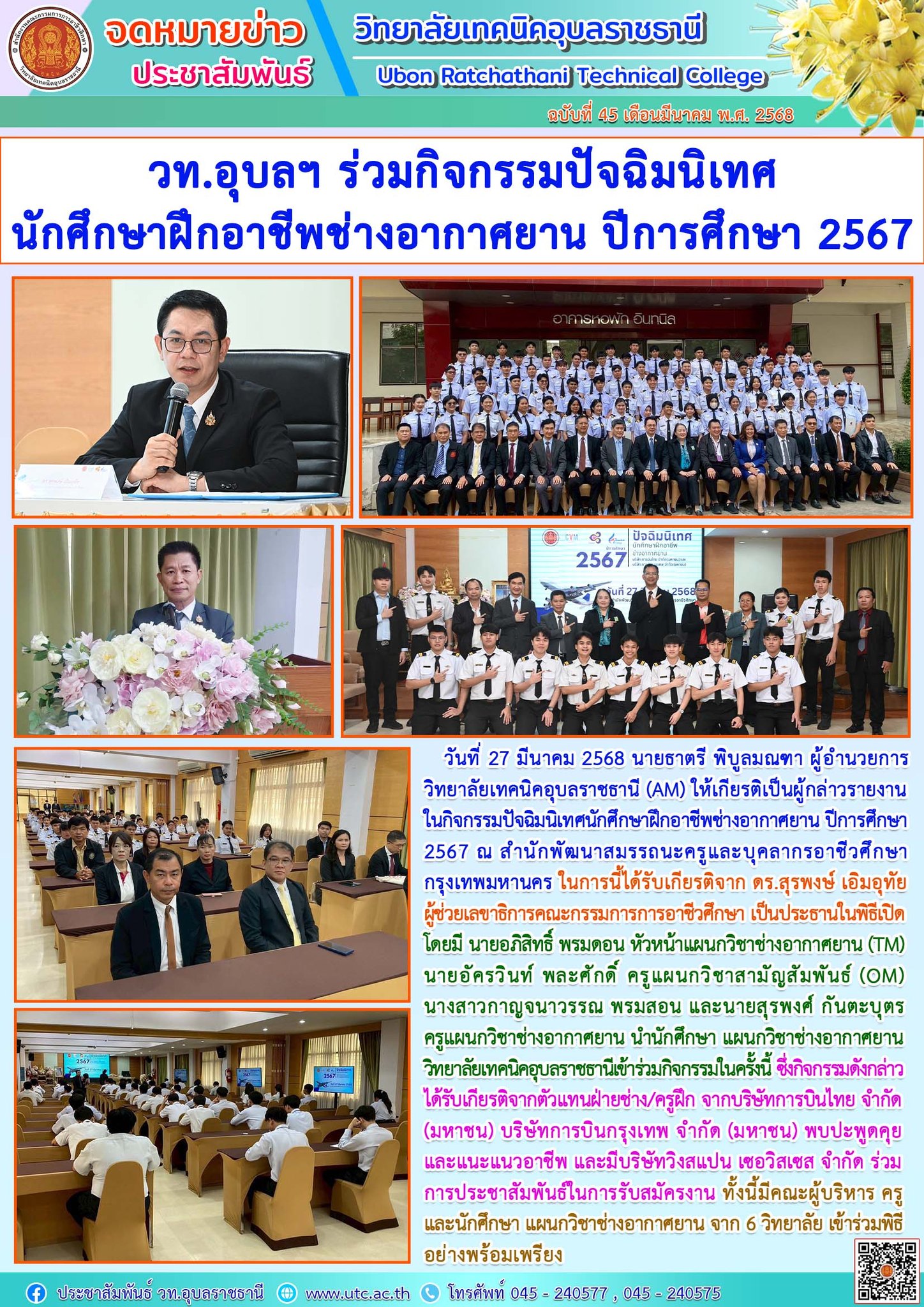 วันที่ 27 มีนาคม 2568 นายธาตรี พิบูลมณฑา ผู้อำนวยการวิทยาลัยเทคนิคอุบลราชธานี (AM) ให้เกียรติเป็นผู้กล่าวรายงานในกิจกรรมปัจฉิมนิเทศนักศึกษาฝึกอาชีพช่างอากาศยาน ปีการศึกษา 2567 ณ สำนักพัฒนา (เพิ่มเติม…)