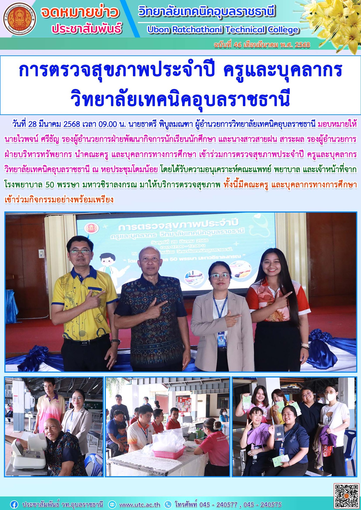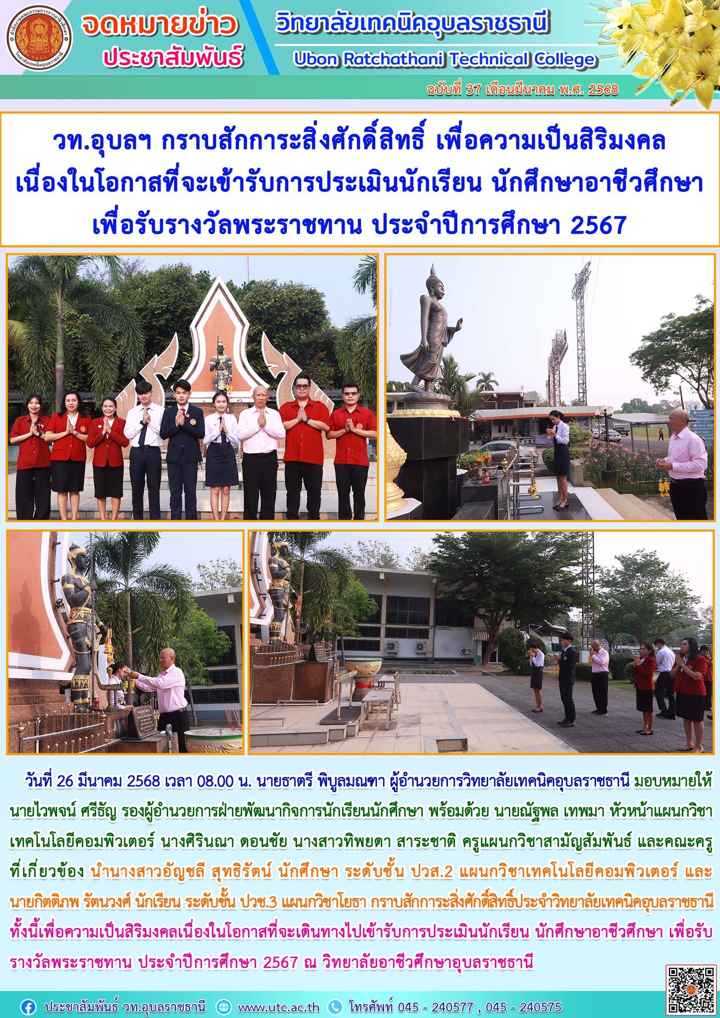วันที่ 26 มีนาคม 2568 เวลา 08.30 น. นายธาตรี พิบูลมณฑา ผู้อำนวยการวิทยาลัยเทคนิคอุบลราชธานี ได้มอบหมายให้ นายสุวิชา มั่นยืน (เพิ่มเติม…)