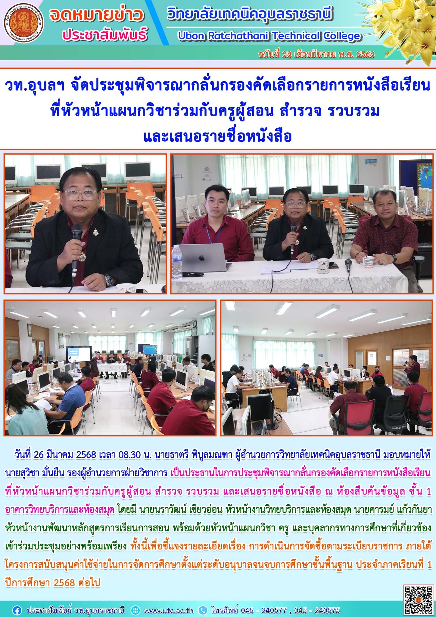 วันที่ 27 มีนาคม 2568 เวลา 09.45 น. นายธาตรี พิบูลมณฑา ผู้อำนวยการวิทยาลัยเทคนิคอุบลราชธานี (เพิ่มเติม…)