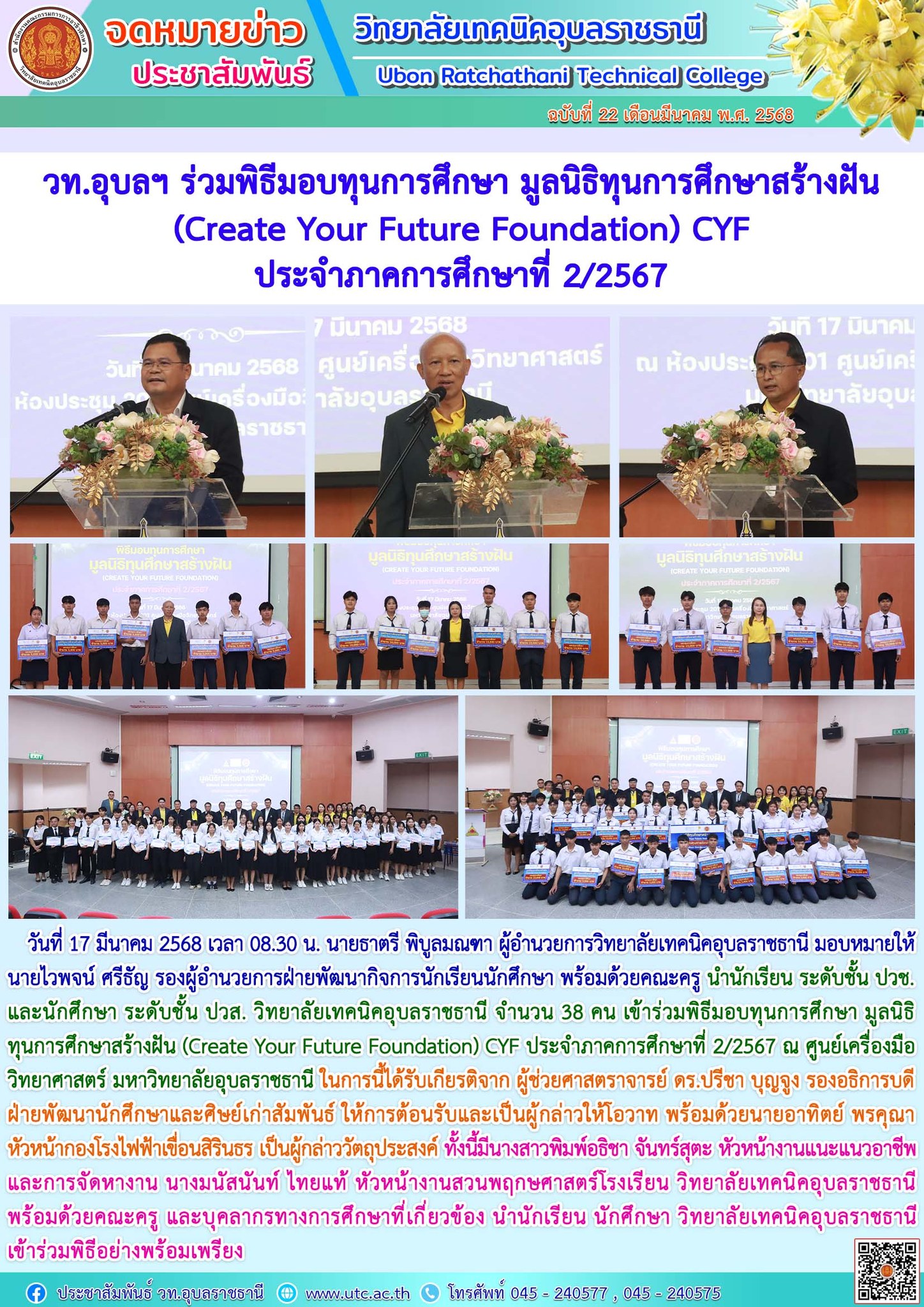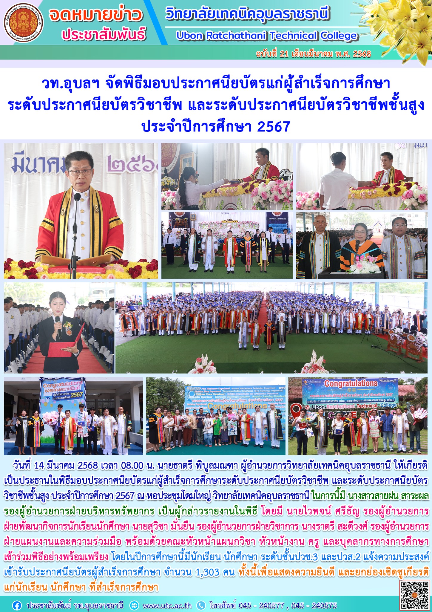 วันที่ 14 มีนาคม 2568 เวลา 08.00 น. นายธาตรี พิบูลมณฑา ผู้อำนวยการวิทยาลัยเทคนิคอุบลราชธานี ให้เกียรติเป็นประธานในพิธีมอบ (เพิ่มเติม…)
