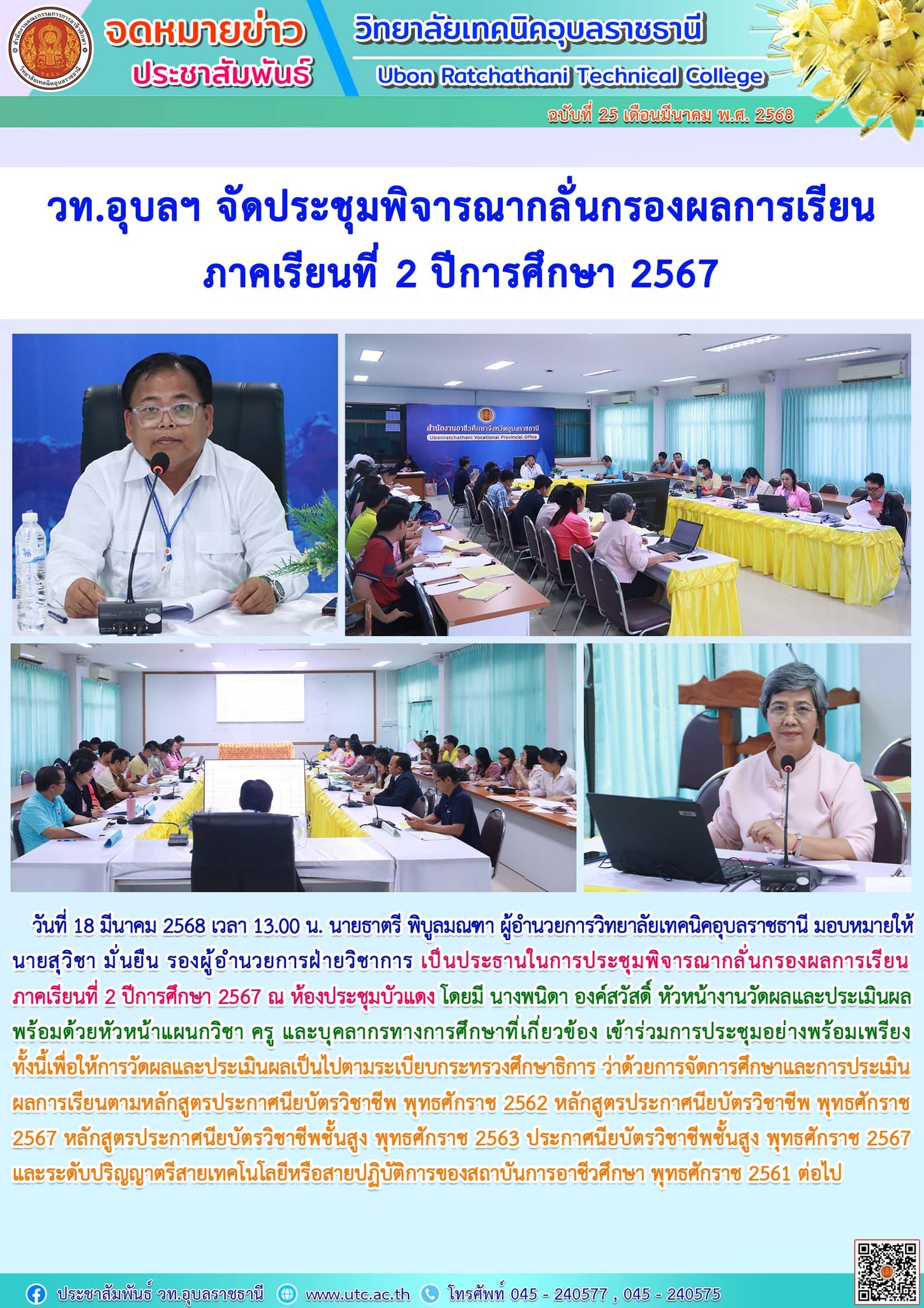 วันที่ 18 มีนาคม 2568 เวลา 13.00 น. นายธาตรี พิบูลมณฑา ผู้อำนวยการวิทยาลัยเทคนิคอุบลราชธานี มอบหมายให้ นายสุวิชา มั่นยืน รองผู้อำนวยการฝ่ายวิชาการ เป็นประธานในการประชุมพิจารณากลั่นกรอง (เพิ่มเติม…)