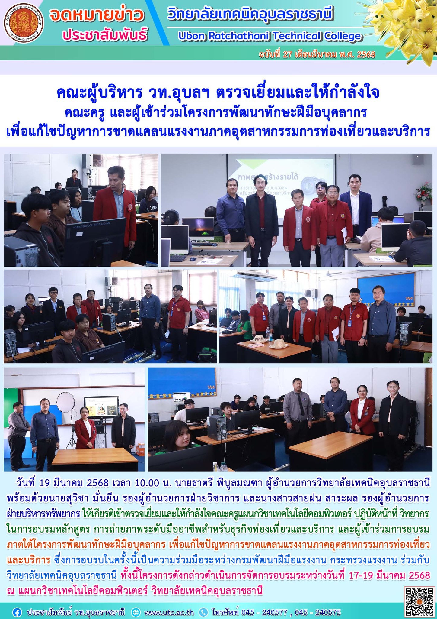 คณะผู้บริหาร วท.อุบลฯ ตรวจเยี่ยมและให้กำลังใจคณะครู เเละผู้เข้าร่วมโครงการพัฒนาทักษะฝีมือบุคลากร เพื่อแก้ไขปัญหาการขาดแคลนแรงงานภาคอุตสาหกรรมการท่องเที่ยวและบริการ