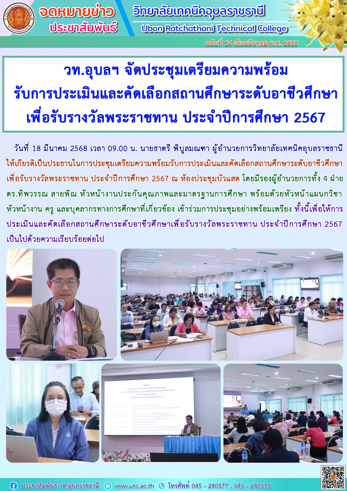วันที่ 18 มีนาคม 2568 เวลา 09.00 น. นายธาตรี พิบูลมณฑา ผู้อำนวยการวิทยาลัยเทคนิคอุบลราชธานี ให้เกียรติเป็นประธานในการประชุมเตรียมความพร้อมรับการประเมิน (เพิ่มเติม…)