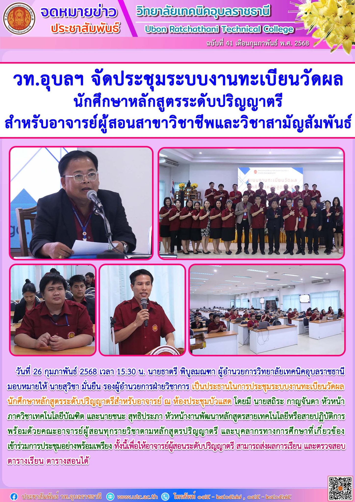 วันที่ 26 กุมภาพันธ์ 2568 เวลา 15.30 น. นายธาตรี พิบูลมณฑา ผู้อำนวยการวิทยาลัยเทคนิคอุบลราชธานี มอบหมายให้ นายสุวิชา มั่นยืน (เพิ่มเติม…)