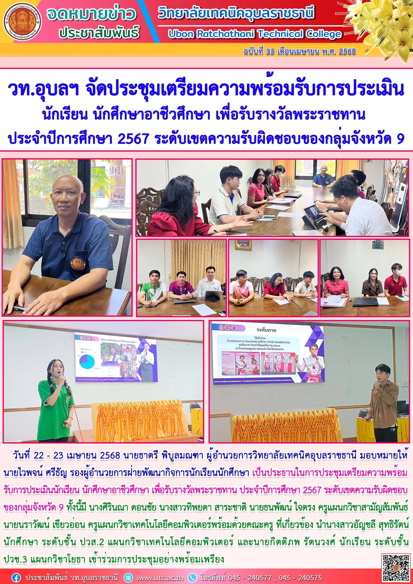 วันที่ 21 เมษายน 2568 เวลา 09.00 น. นายธาตรี พิบูลมณฑา ผู้อำนวยการวิทยาลัยเทคนิคอุบลราชธานี มอบหมายให้ นายไวพจน์ ศรีธัญ รองผู้อำนวยการฝ่ายพัฒนากิจการนักเรียน (เพิ่มเติม…)