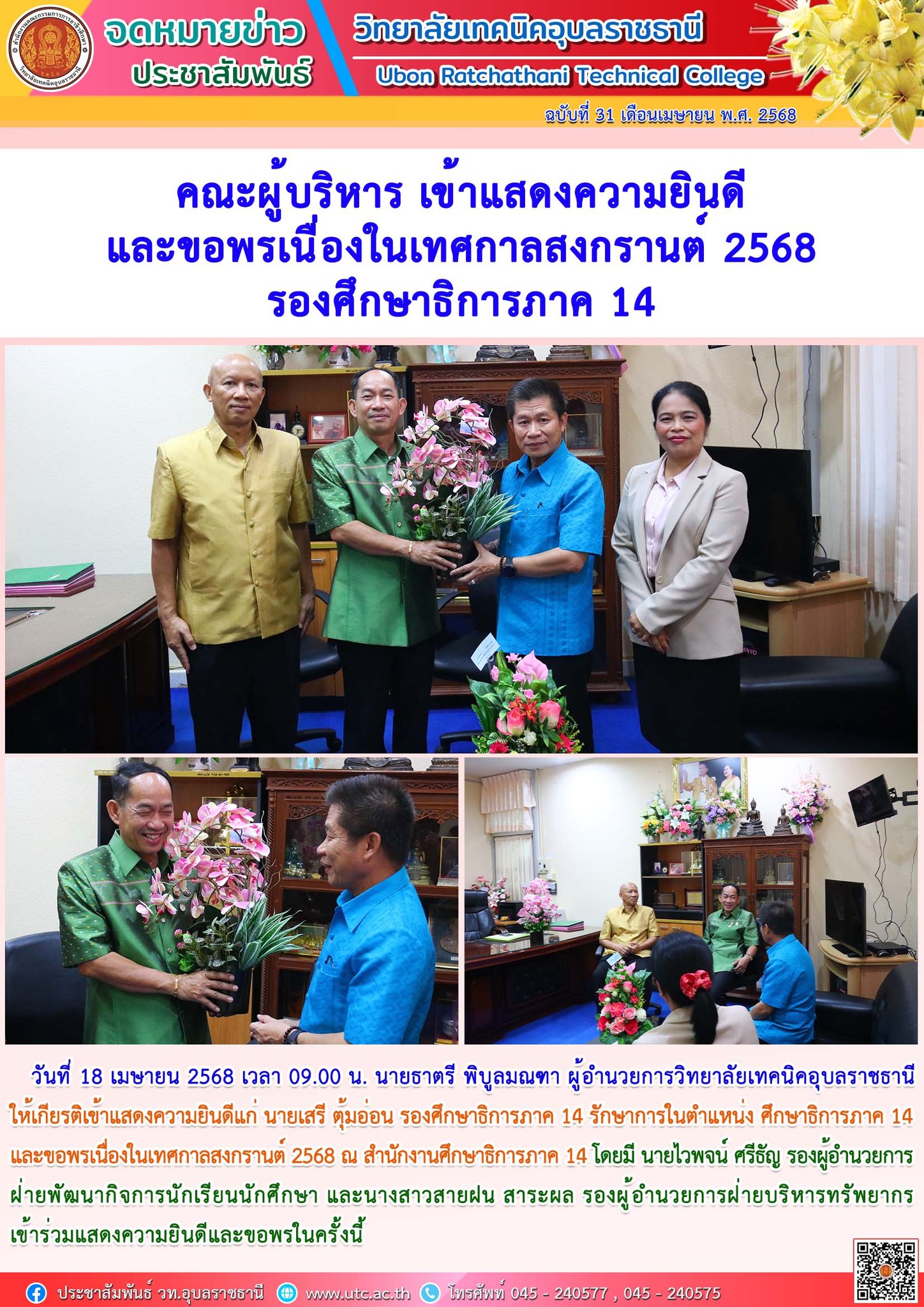 วันที่ 18 เมษายน 2568 เวลา 09.00 น. นายธาตรี พิบูลมณฑา ผู้อำนวยการวิทยาลัยเทคนิคอุบลราชธานี ให้เกียรติเข้าแสดงความยินดีแก่ นายเสรี ตุ้มอ่อน รองศึกษาธิการภาค 14 รักษาการในตำแหน่ง ศึกษาธิการภาค 14 และขอพรเนื่องในเทศกาลสงกรานต์ (เพิ่มเติม…)