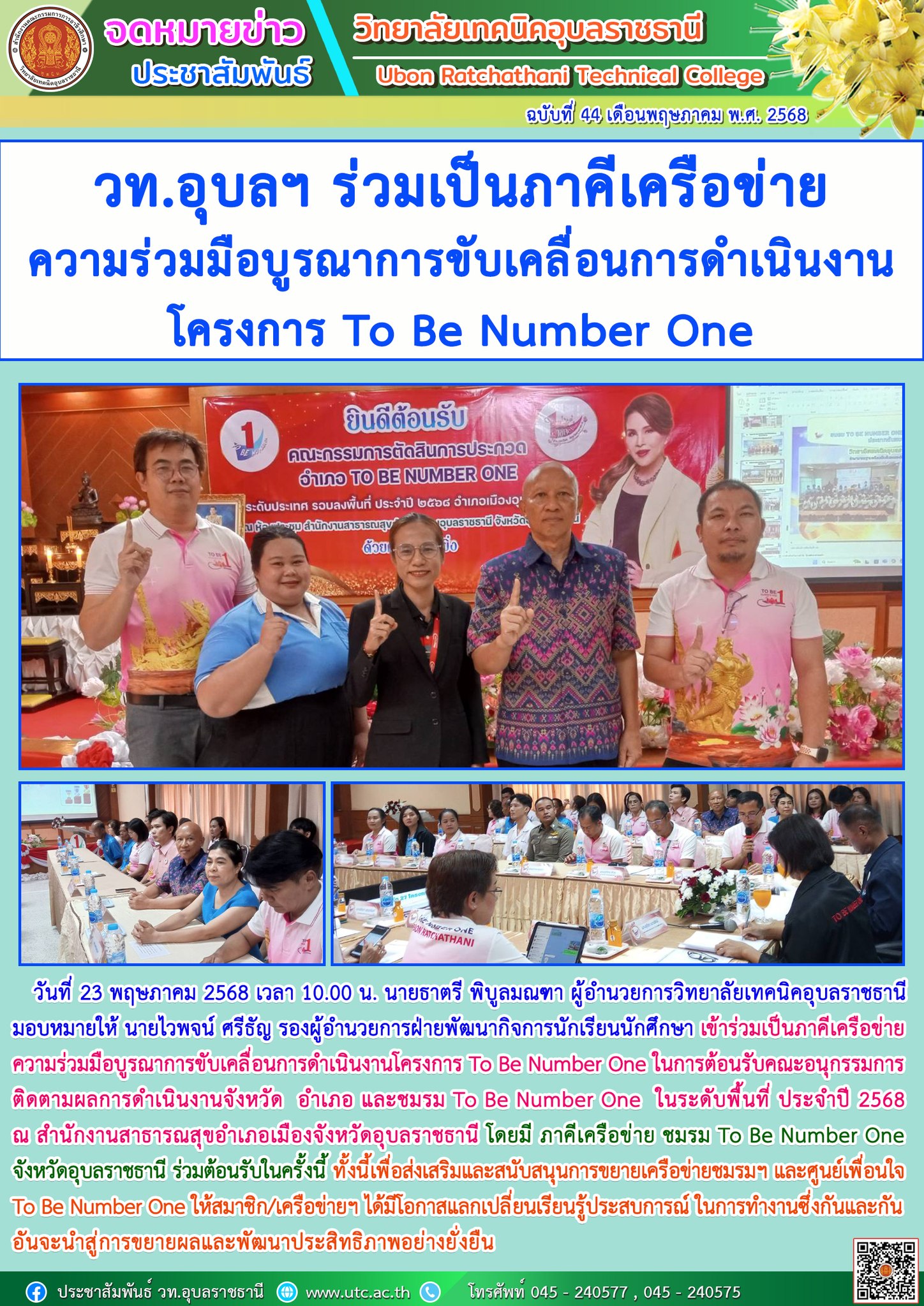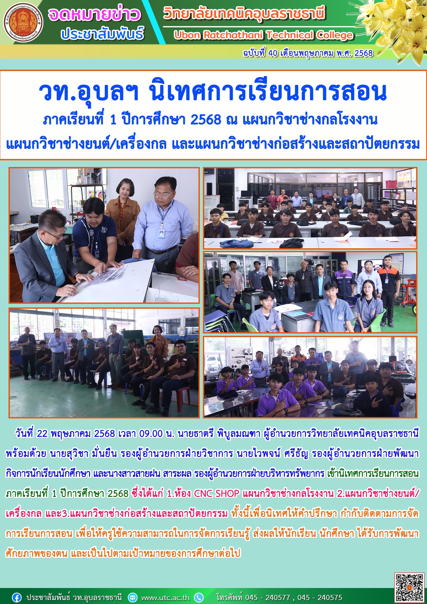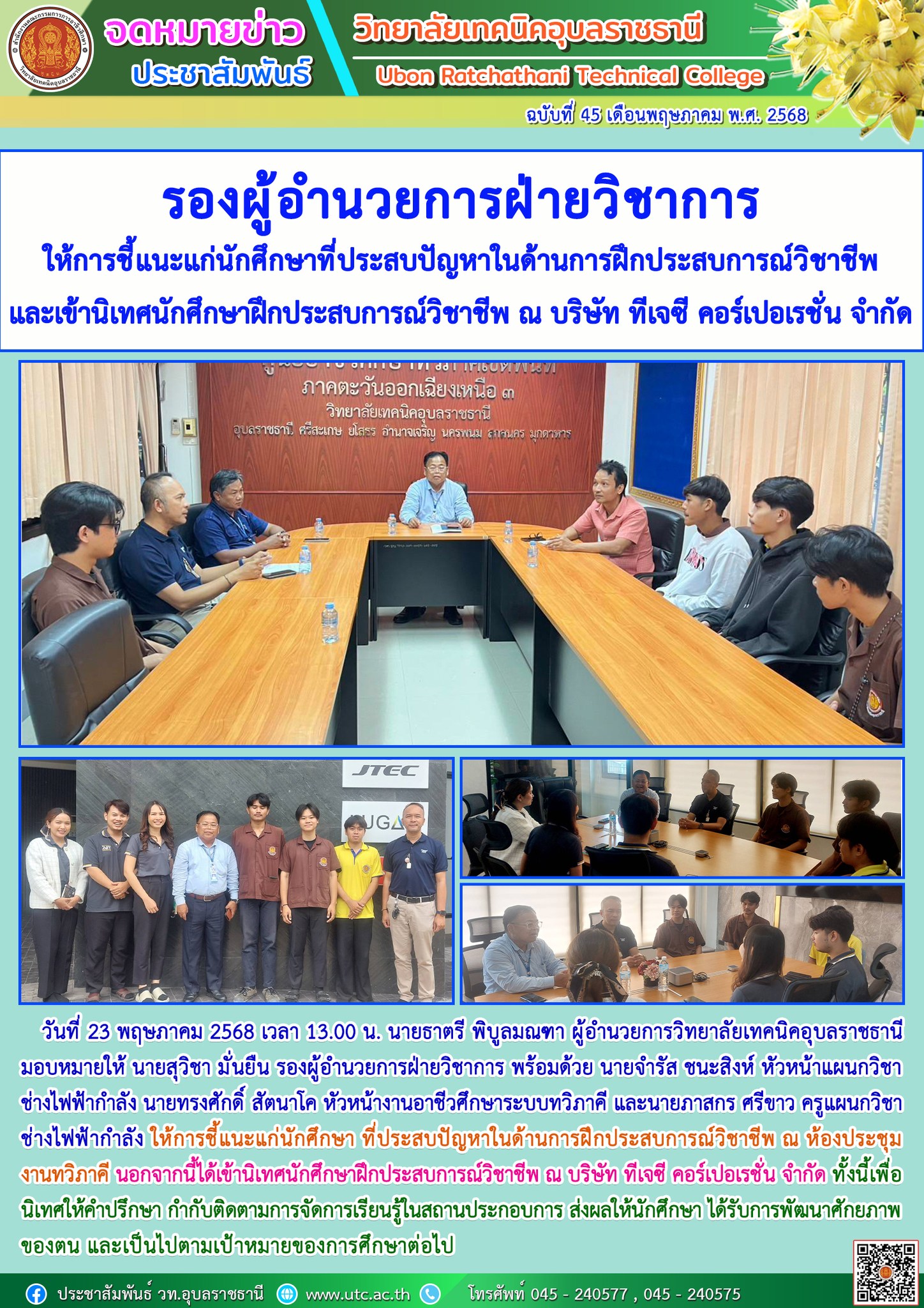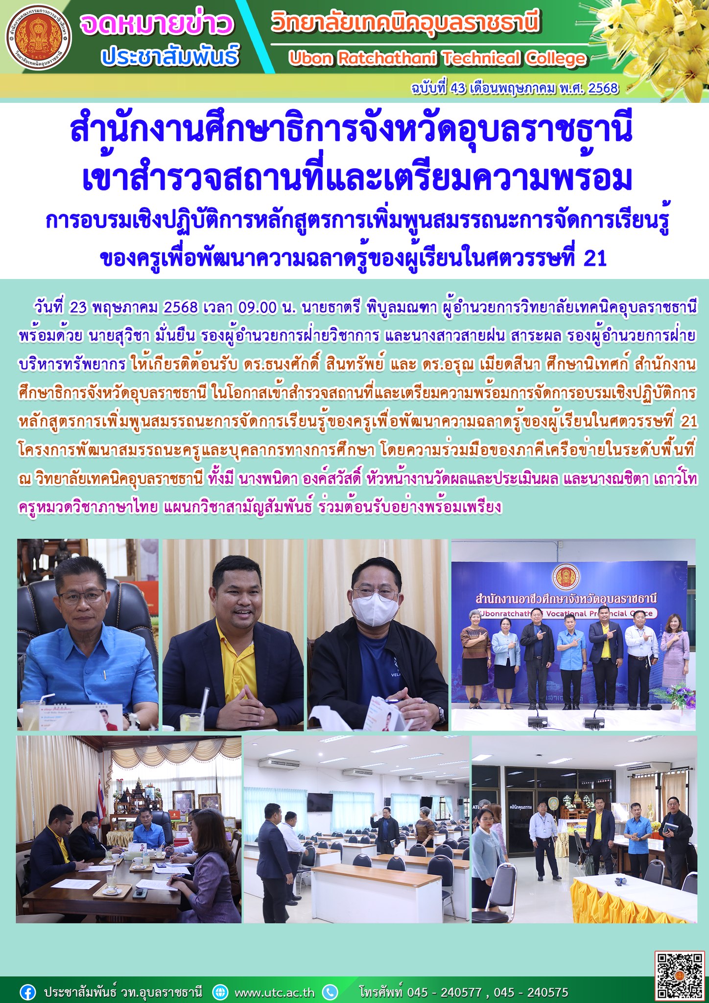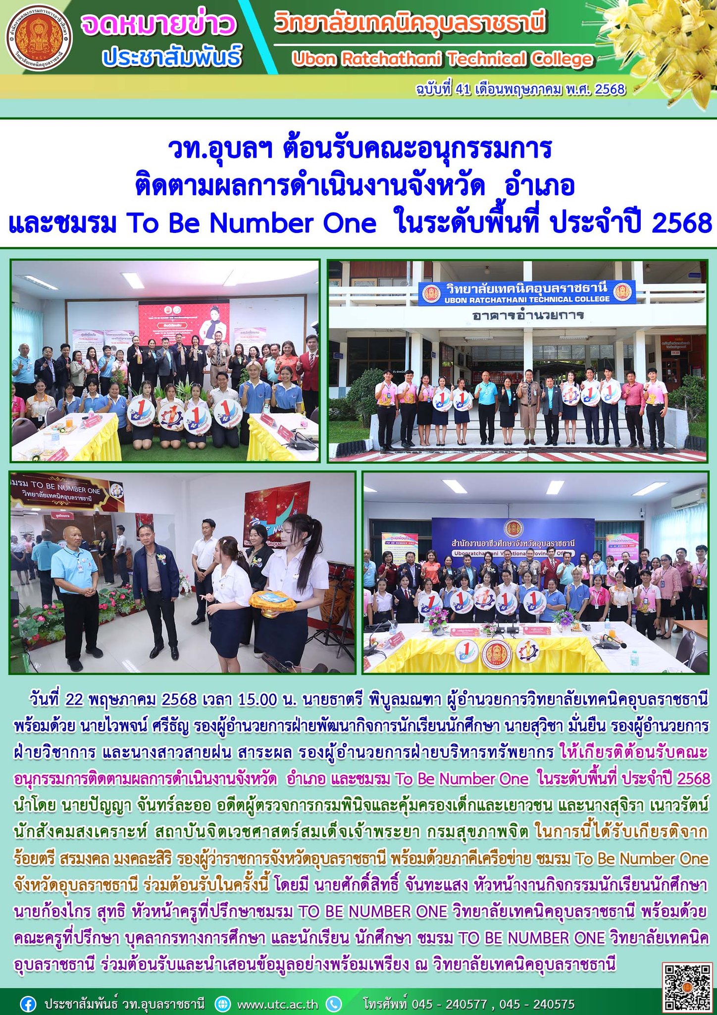 วันที่ 22 พฤษภาคม 2568 เวลา 15.00 น. นายธาตรี พิบูลมณฑา ผู้อำนวยการวิทยาลัยเทคนิคอุบลราชธานี พร้อมด้วย นายไวพจน์ ศรีธัญ รองผู้อำนวยการฝ่ายพัฒนากิจการนักเรียน (เพิ่มเติม…)