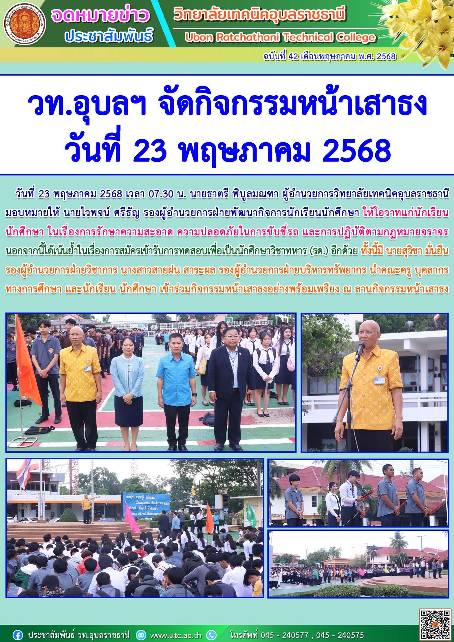วันที่ 23 พฤษภาคม 2568 เวลา 07.30 น. นายธาตรี พิบูลมณฑา ผู้อำนวยการวิทยาลัยเทคนิคอุบลราชธานี มอบหมายให้ นายไวพจน์ ศรีธัญ รองผู้อำนวยการฝ่ายพัฒนากิจการนักเรียนนักศึกษา ให้โอวาทแก่นักเรียน นักศึกษา ในเรื่อง การรักษาความสะอาด ความปลอดภัยในการขับขี่รถ การปฏิบัติตาม (เพิ่มเติม…)