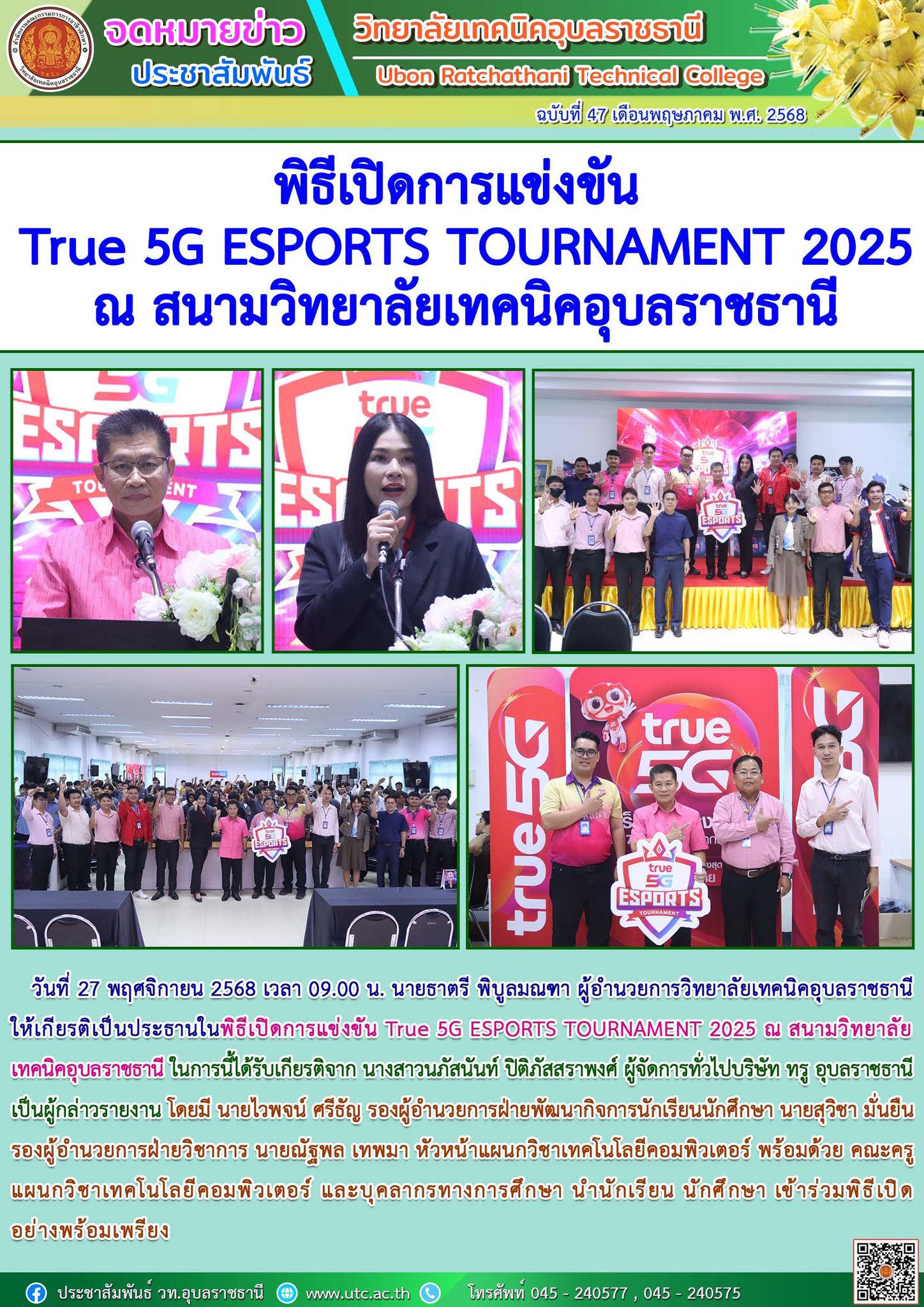วันที่ 27 พฤศจิกายน 2568 เวลา 09.00 น. นายธาตรี พิบูลมณฑา ผู้อำนวยการวิทยาลัยเทคนิคอุบลราชธานี ให้เกียรติเป็นประธานในพิธีเปิดการแข่งขัน True 5G ESPORTS TOURNAMENT 2025 (เพิ่มเติม…)