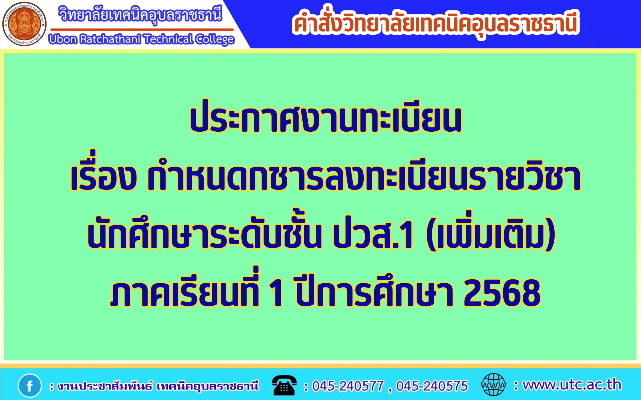 ประกาศงานทะเบียน เรื่อง กำหนดกชารลงทะเบียนรายวิชานักศึกษาระดับชั้น ปวส.1 (เพิ่มเติม) ภาคเรียนที่ 1 ปีการศึกษา 2568