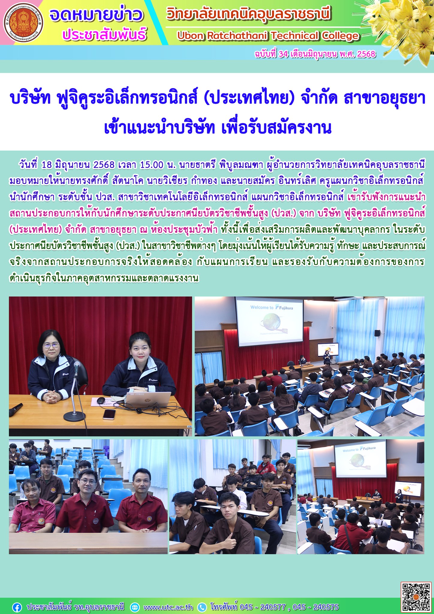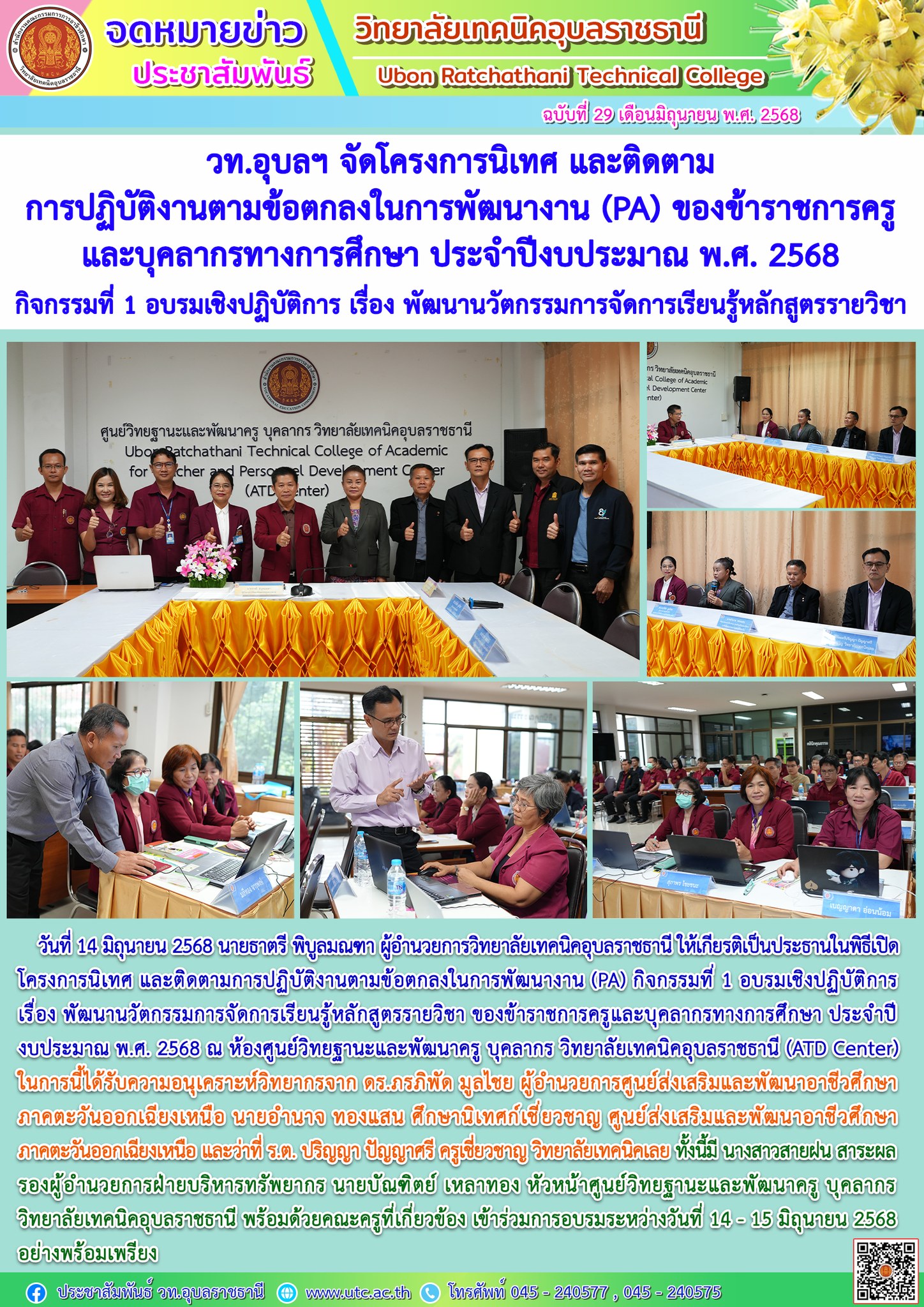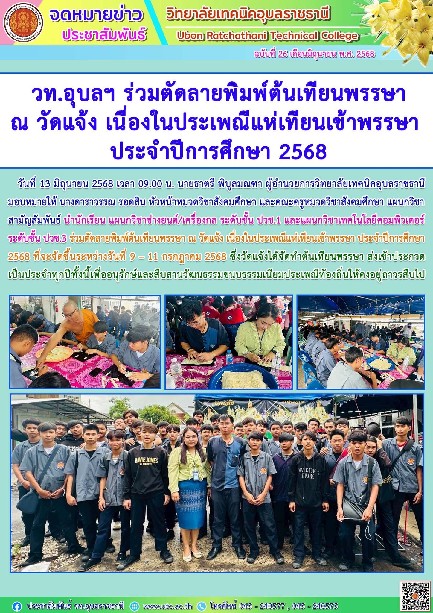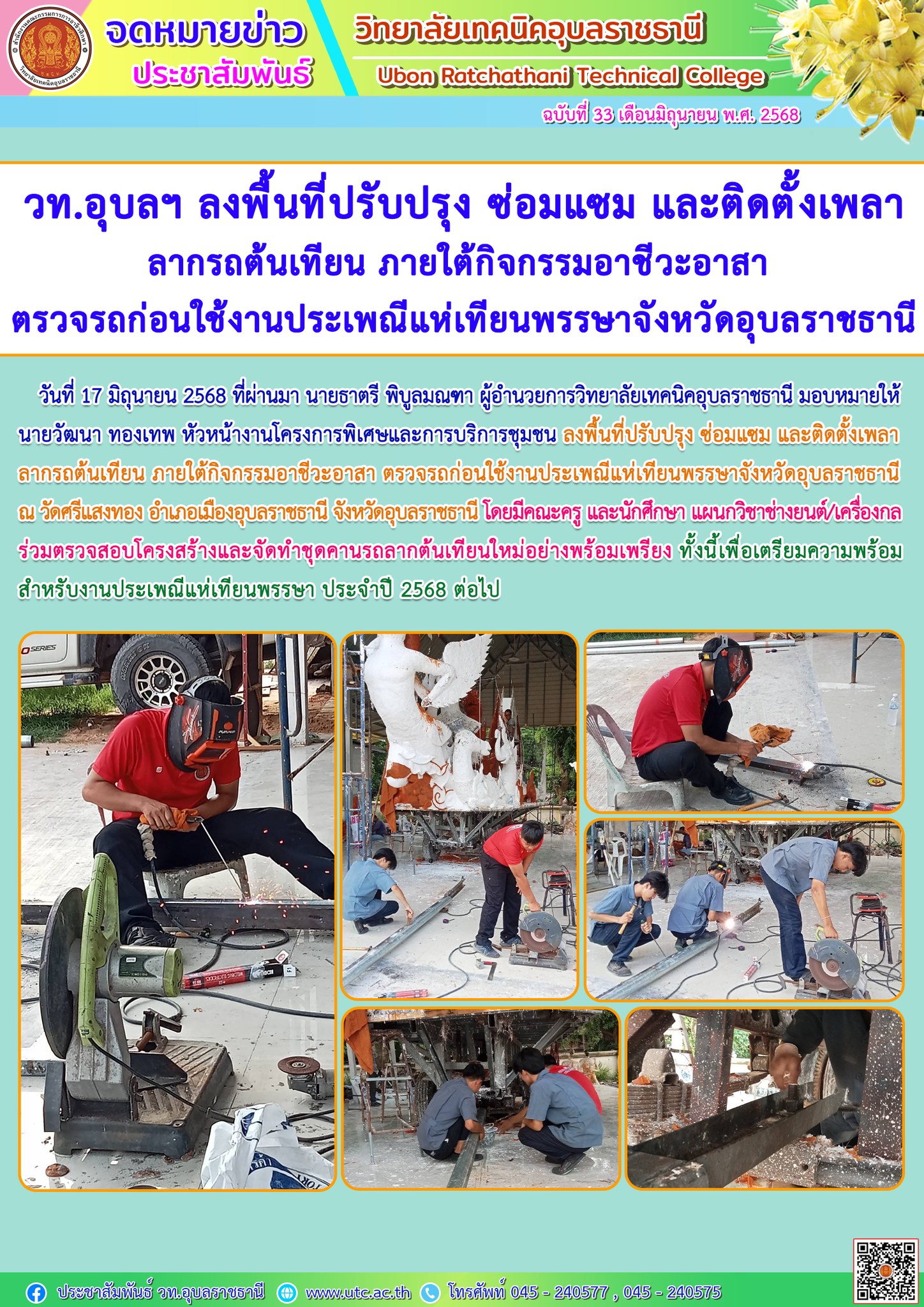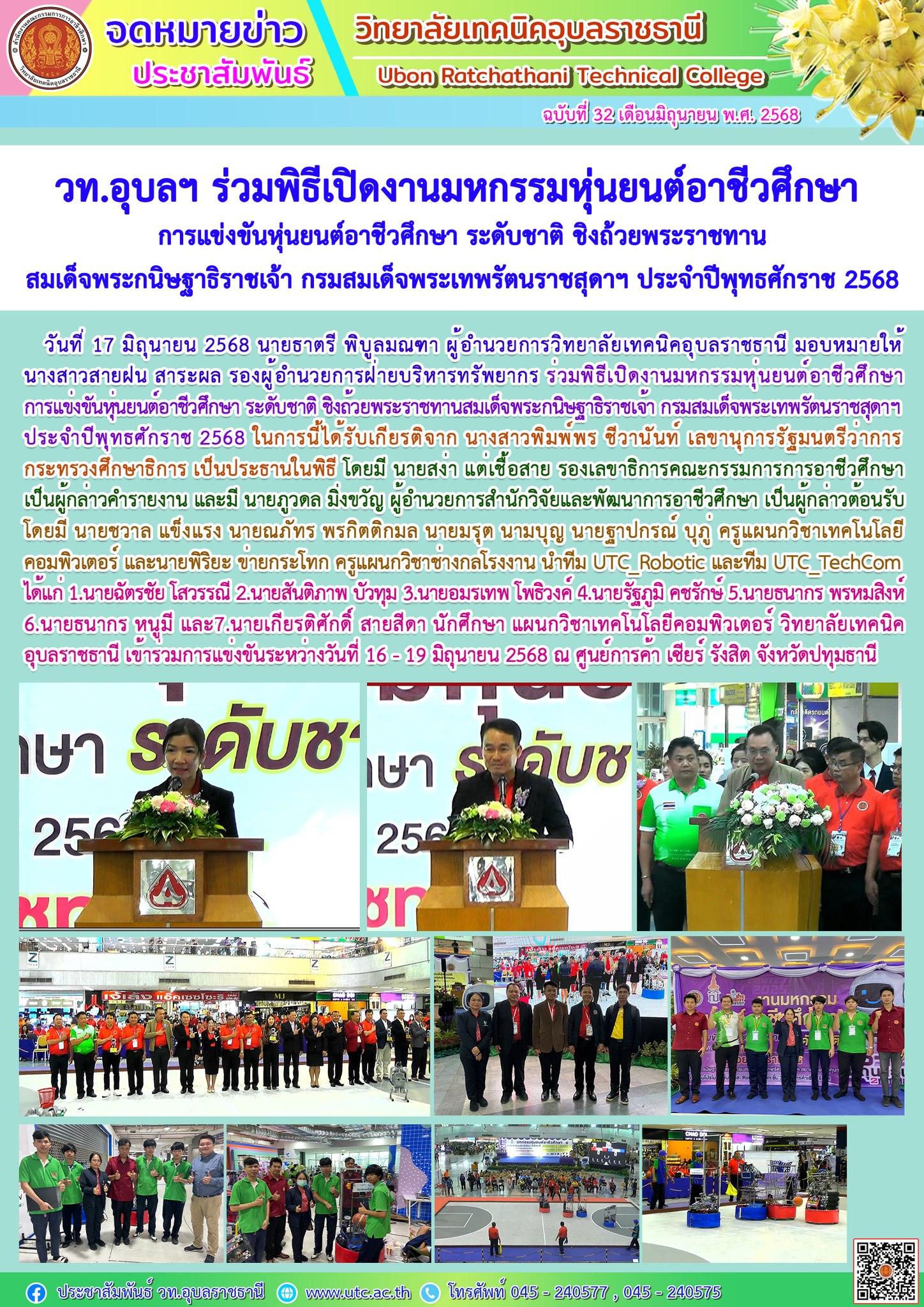 วันที่ 16 มิถุนายน 2568 เวลา 07.30 น. นายธาตรี พิบูลมณฑา ผู้อำนวยการวิทยาลัยเทคนิคอุบลราชธานี ให้เกียรติเป็นประธานในพิธีมอบรางวัลการประกวดพานไหว้ครู ประจำปีการศึกษา 2568 ให้แก่ตัวแทนนักเรียน นักศึกษา ที่ได้รับรางวัลจากการประกวด ซึ่งแบ่งเป็น 2 ประเภท ได้แก่ 1. ประเภทสวยงาม รางวัลชนะเลิศ ได้แก่ นักศึกษาระดับชั้น ปวส.2 แผนกวิชาการบัญชี รางวัลรองชนะเลิศ อันดับ 1 ได้แก่ นักเรียนระดับชั้น ปวช.3 แผนกวิชาโยธา และรางวัลรองชนะเลิศ อันดับ 2 ได้แก่ นักศึกษาระดับชั้น ปวส.1 แผนกวิชาช่างเชื่อมโลหะ 2.ประเภทความคิดสร้างสรรค์ รางวัลชนะเลิศ ได้แก่ นักเรียนระดับชั้น ปวส.1 แผนกวิชาช่างก่อสร้างและสถาปัตยกรรม รางวัลรองชนะเลิศ อันดับ 1 ได้แก่ นักศึกษาระดับชั้น ปวส.1 แผนกวิชาการบัญชี และรางวัลรองชนะเลิศ อันดับ 2 ได้แก่ นักเรียนระดับชั้น ปวส.1 แผนกวิชาโยธา โดยมี นายไวพจน์ ศรีธัญ รองผู้อำนวยการฝ่ายพัฒนากิจการนักเรียนนักศึกษา นายสุวิชา มั่นยืน รองผู้อำนวยการฝ่ายวิชาการ นำคณะครู และนักเรียน นักศึกษา เข้าร่วมกิจกรรมอย่างพร้อมเพรียง ทั้งนี้มี นายวัฒนา ทองเทพ หัวหน้างานโครงการพิเศษและการบริการชุมชน ได้ให้การอบรมคุณธรรม จริยธรรม และให้ความรู้แก่นักเรียน นักศึกษา ณ ลานกิจกรรมหน้าเสาธง