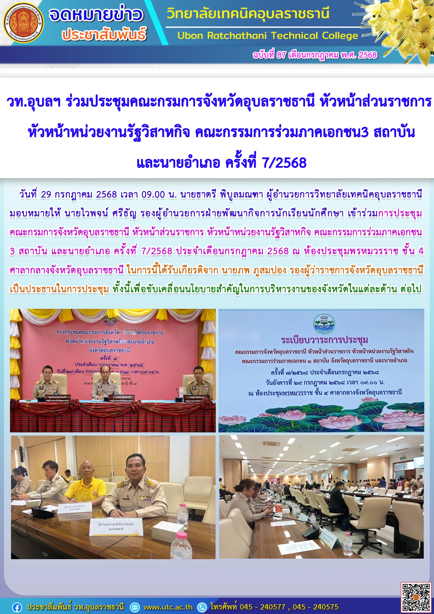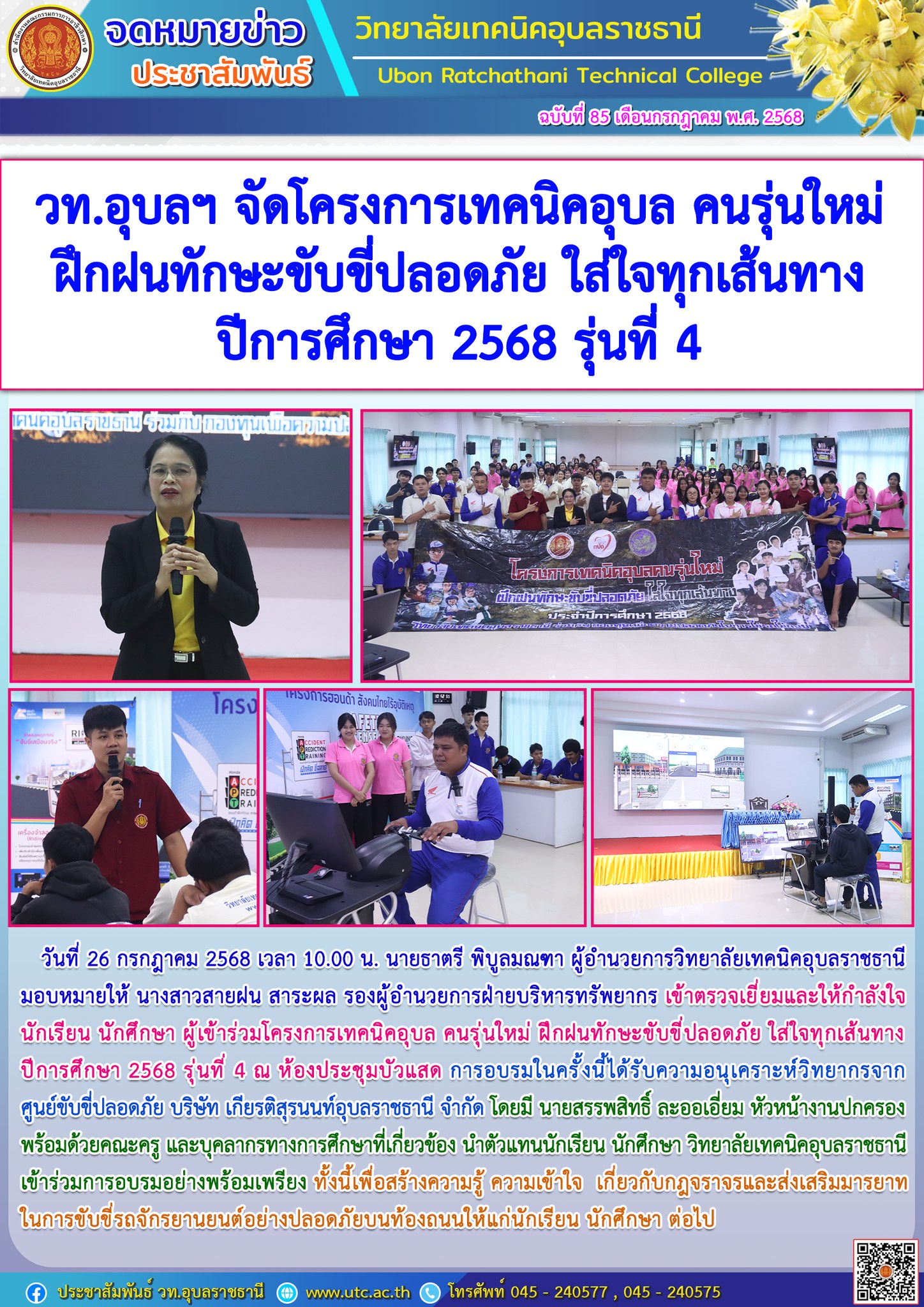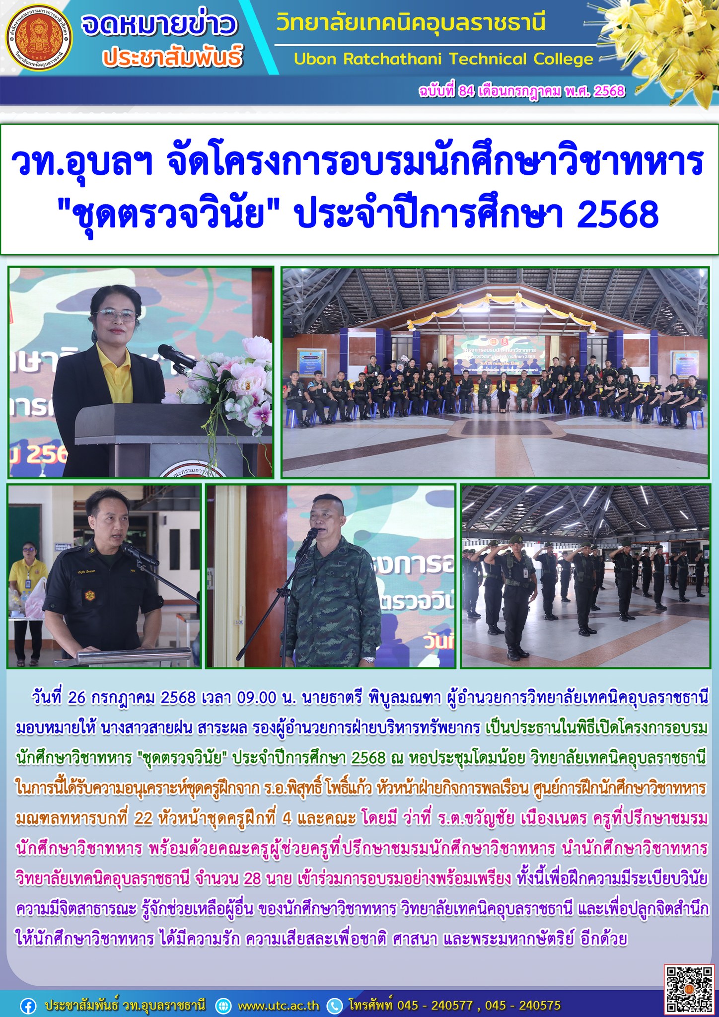 วันที่ 29 กรกฎาคม 2568 เวลา 09.00 น. นายธาตรี พิบูลมณฑา ผู้อำนวยการวิทยาลัยเทคนิคอุบลราชธานี มอบหมายให้ นายไวพจน์ ศรีธัญ (เพิ่มเติม…)