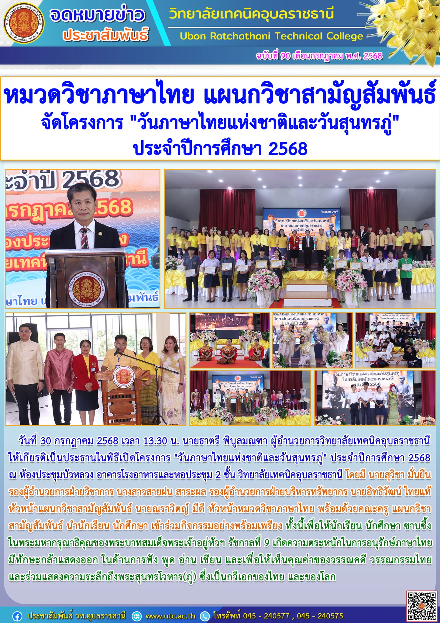 วันที่ 30 กรกฎาคม 2568 เวลา 13.30 น. นายธาตรี พิบูลมณฑา ผู้อำนวยการวิทยาลัยเทคนิคอุบลราชธานี ให้เกียรติเป็นประธานในพิธีเปิดโครงการ “วันภาษาไทยแห่งชาติและวันสุนทรภู่” ประจำปีการศึกษา 2568 ณ ห้องประชุม (เพิ่มเติม…)