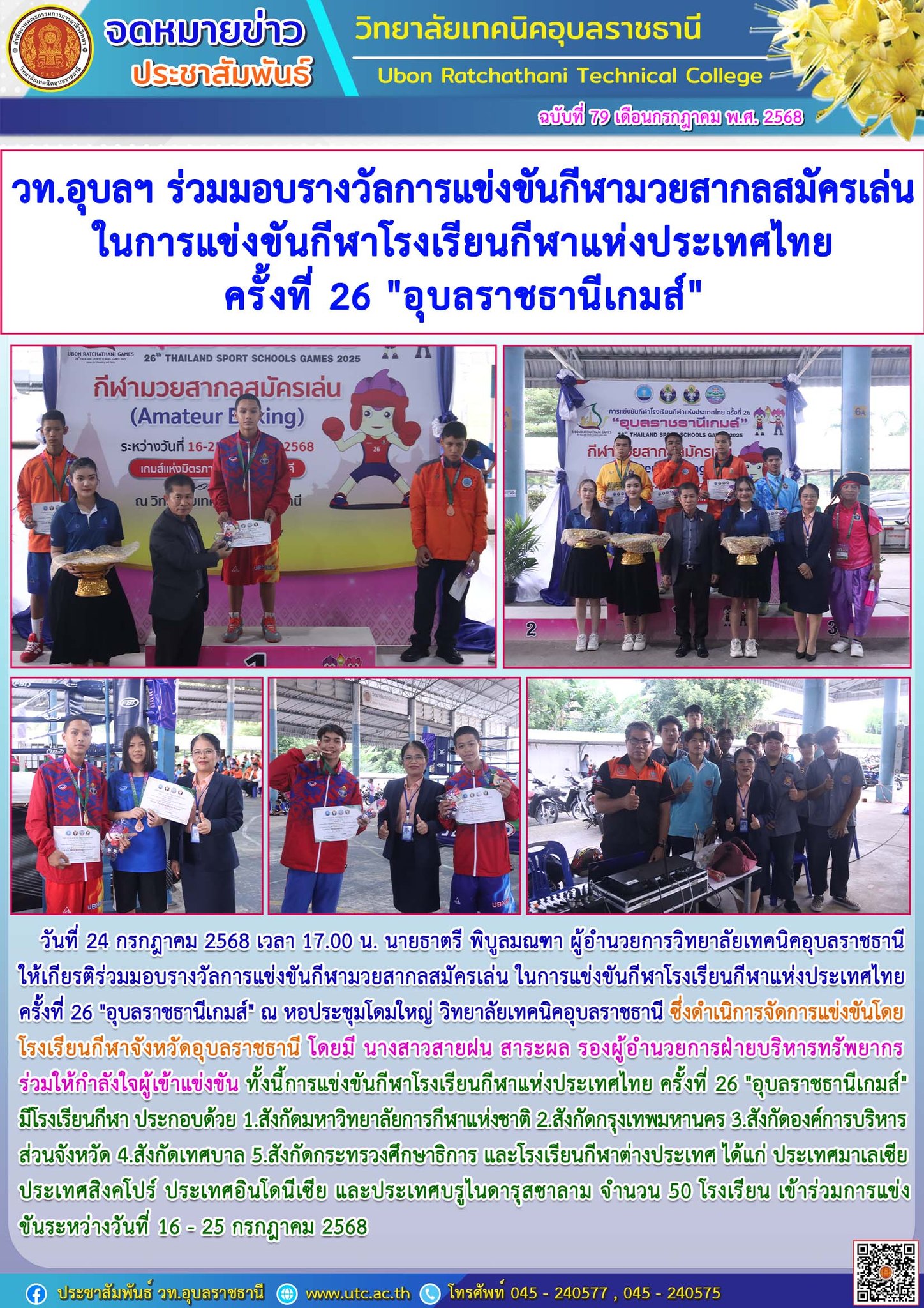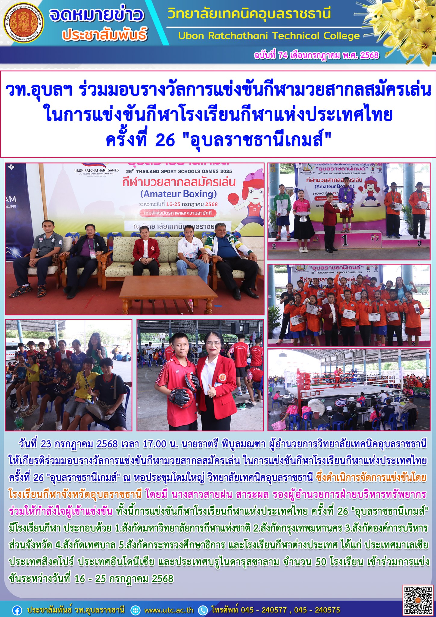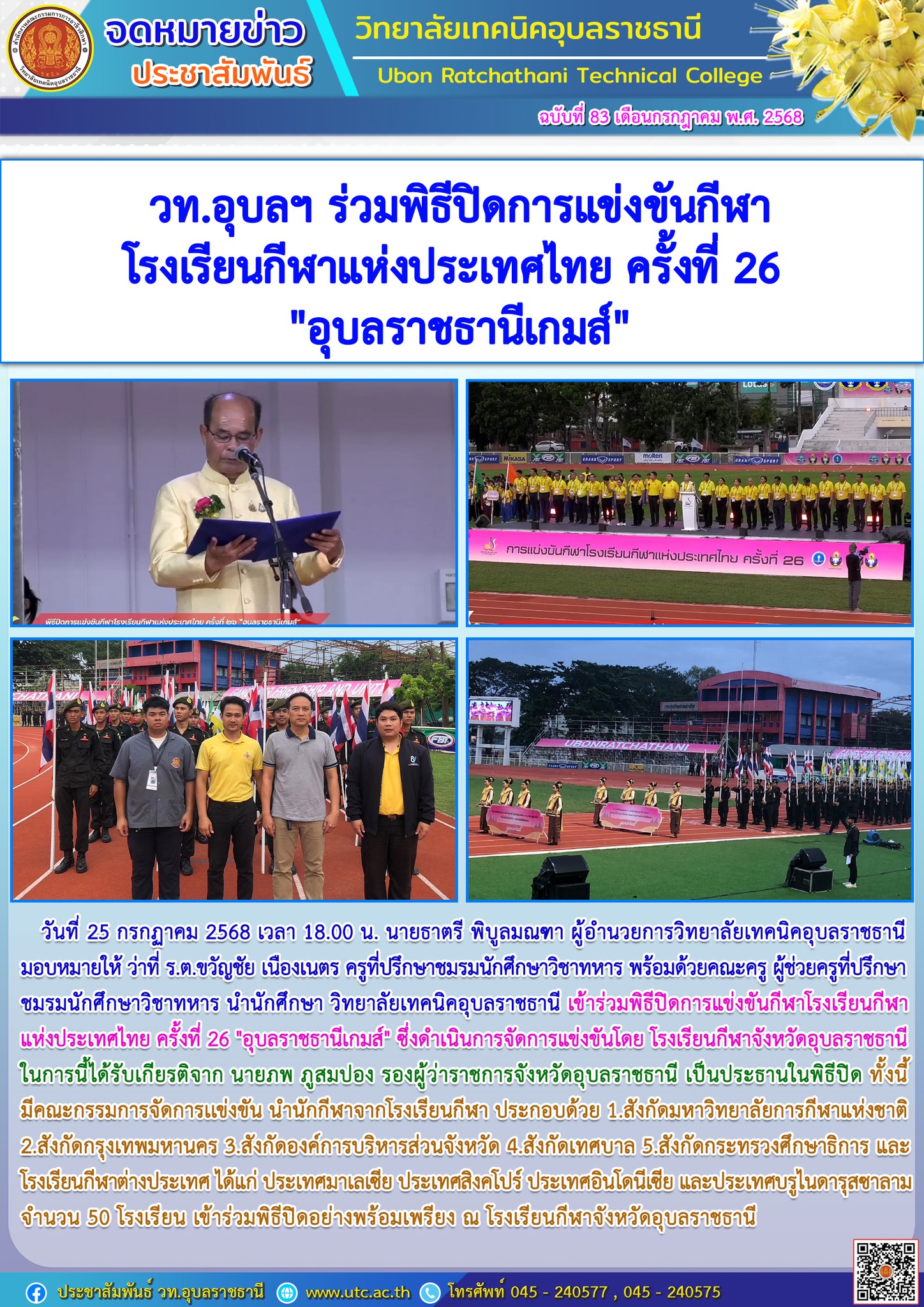 วท.อุบลฯ ร่วมพิธีปิดการแข่งขันกีฬาโรงเรียนกีฬาแห่งประเทศไทย ครั้งที่ 26 “อุบลราชธานีเกมส์”