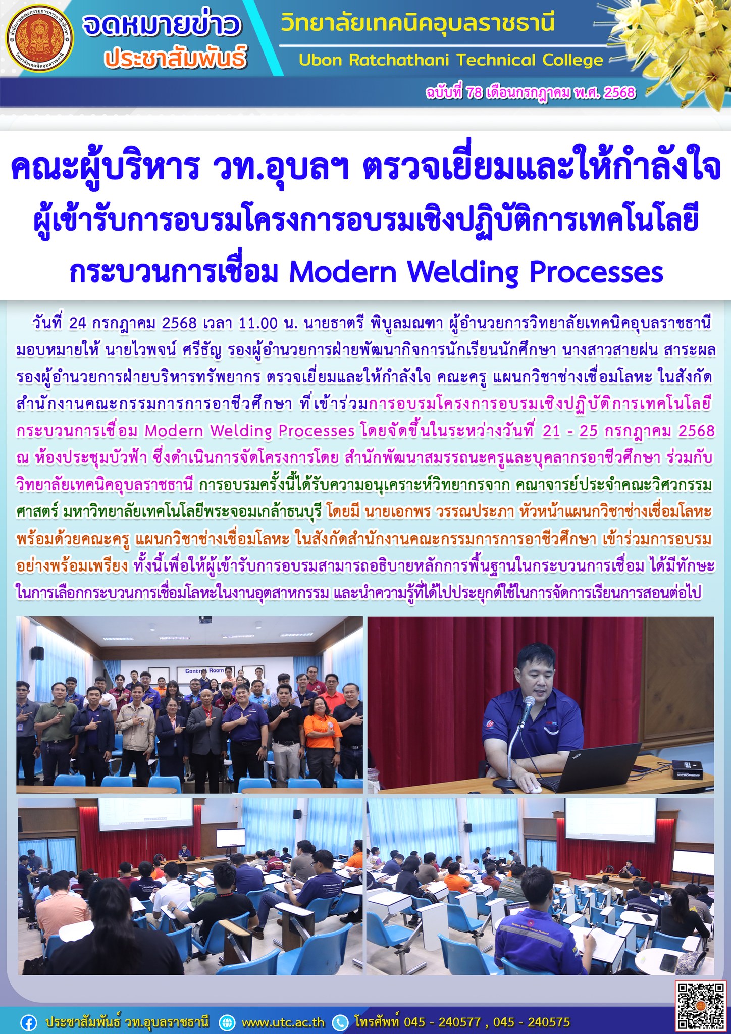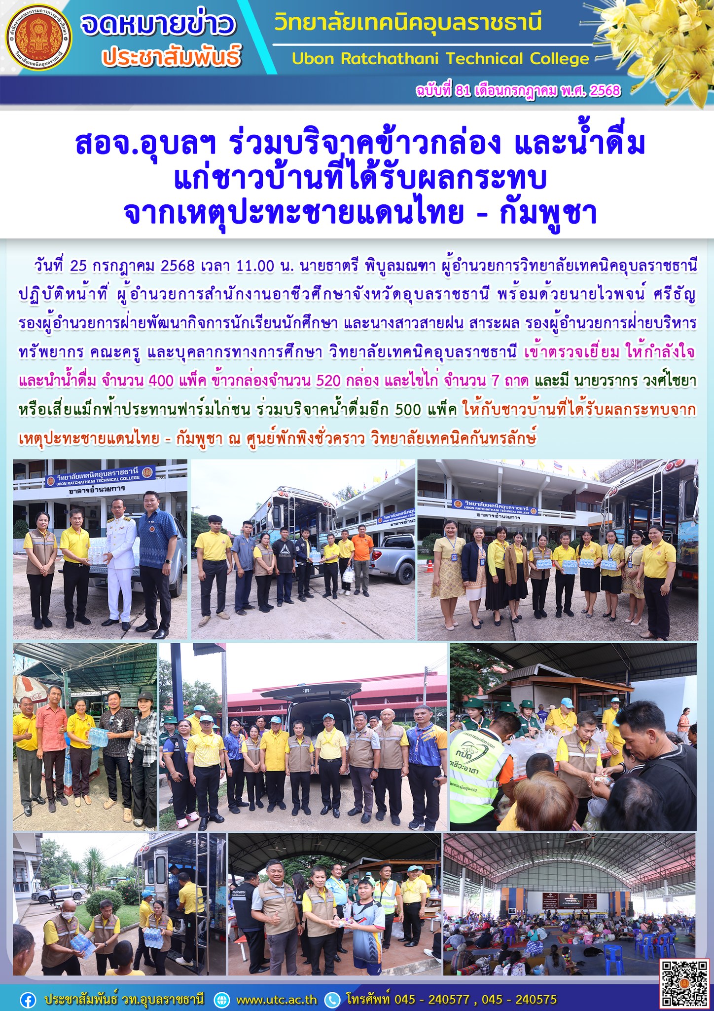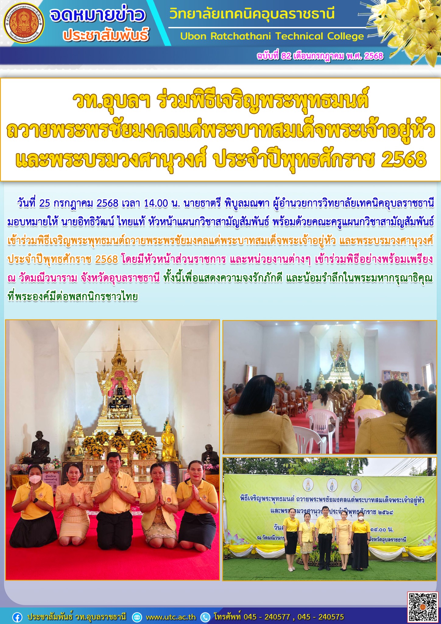 วันที่ 25 กรกฏาคม 2568 เวลา 18.00 น. นายธาตรี พิบูลมณฑา ผู้อำนวยการวิทยาลัยเทคนิคอุบลราชธานี มอบหมายให้ ว่าที่ ร.ต.ขวัญชัย เนืองเนตร ครูที่ปรึกษาชมรมนักศึกษาวิชาทหาร พร้อมด้วยคณะผู้ช่วยครูที่ปรึกษาชมรมนักศึกษาวิชาทหาร นำนัก (เพิ่มเติม…)