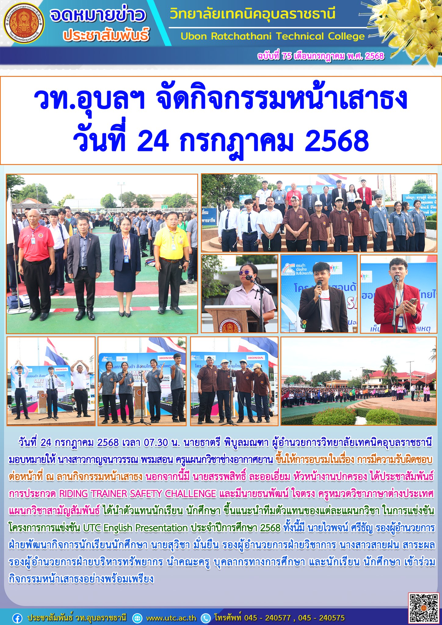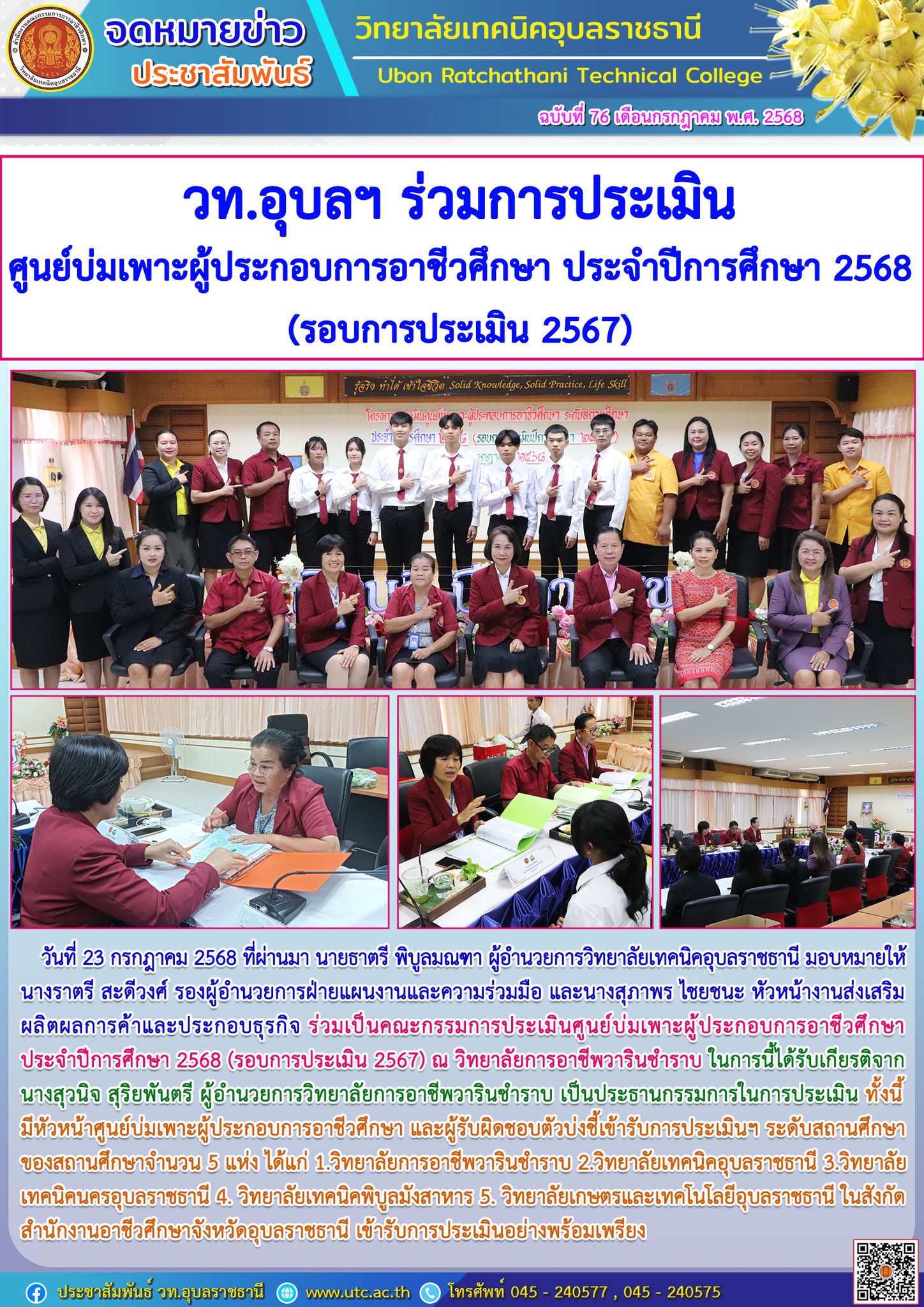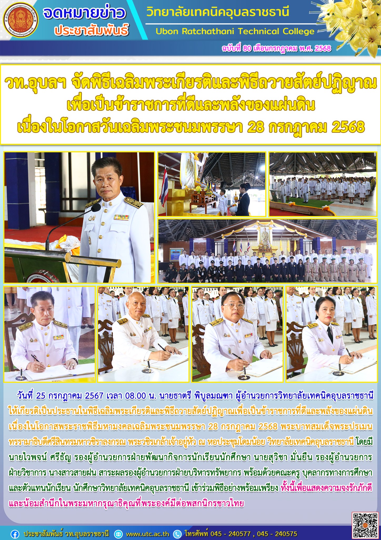 วันที่ 25 กรกฏาคม 2568 เวลา 18.00 น. นายธาตรี พิบูลมณฑา ผู้อำนวยการวิทยาลัยเทคนิคอุบลราชธานี มอบหมายให้ ว่าที่ ร.ต.ขวัญชัย เนืองเนตร ครูที่ปรึกษาชมรมนักศึกษาวิชาทหาร พร้อมด้วยคณะผู้ช่วยครูที่ปรึกษาชมรมนักศึกษาวิชาทหาร นำนัก (เพิ่มเติม…)