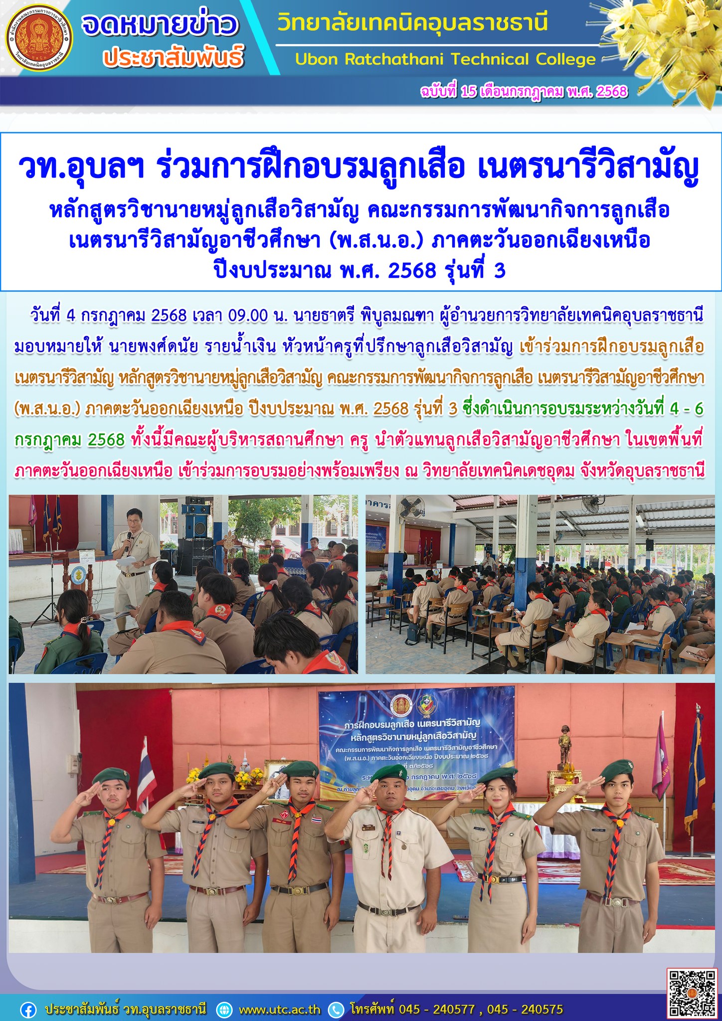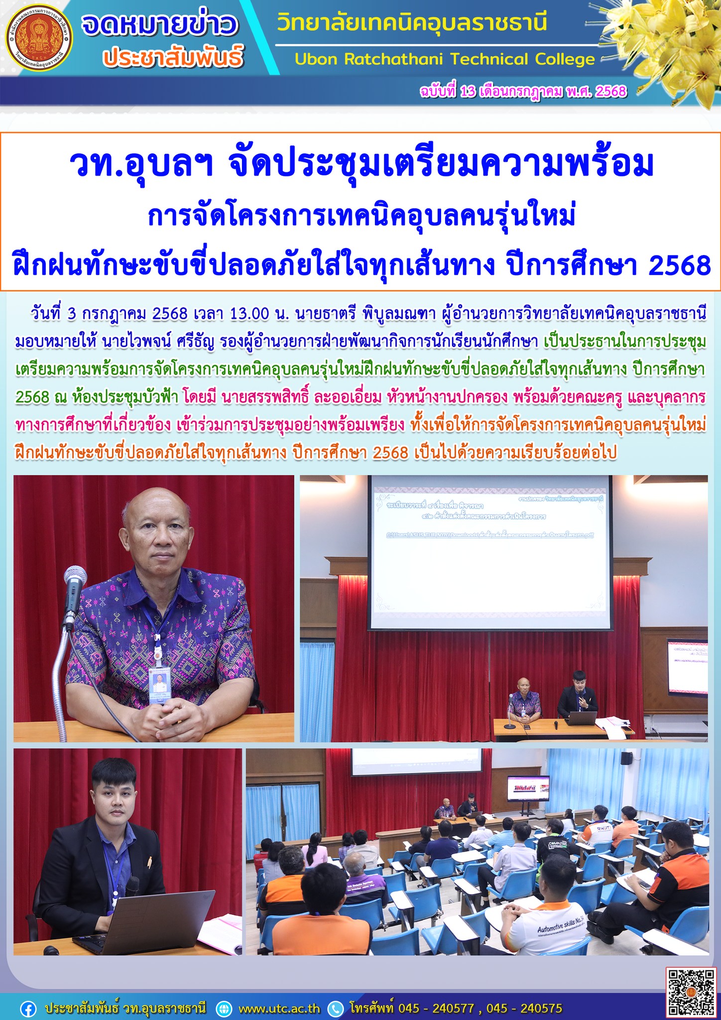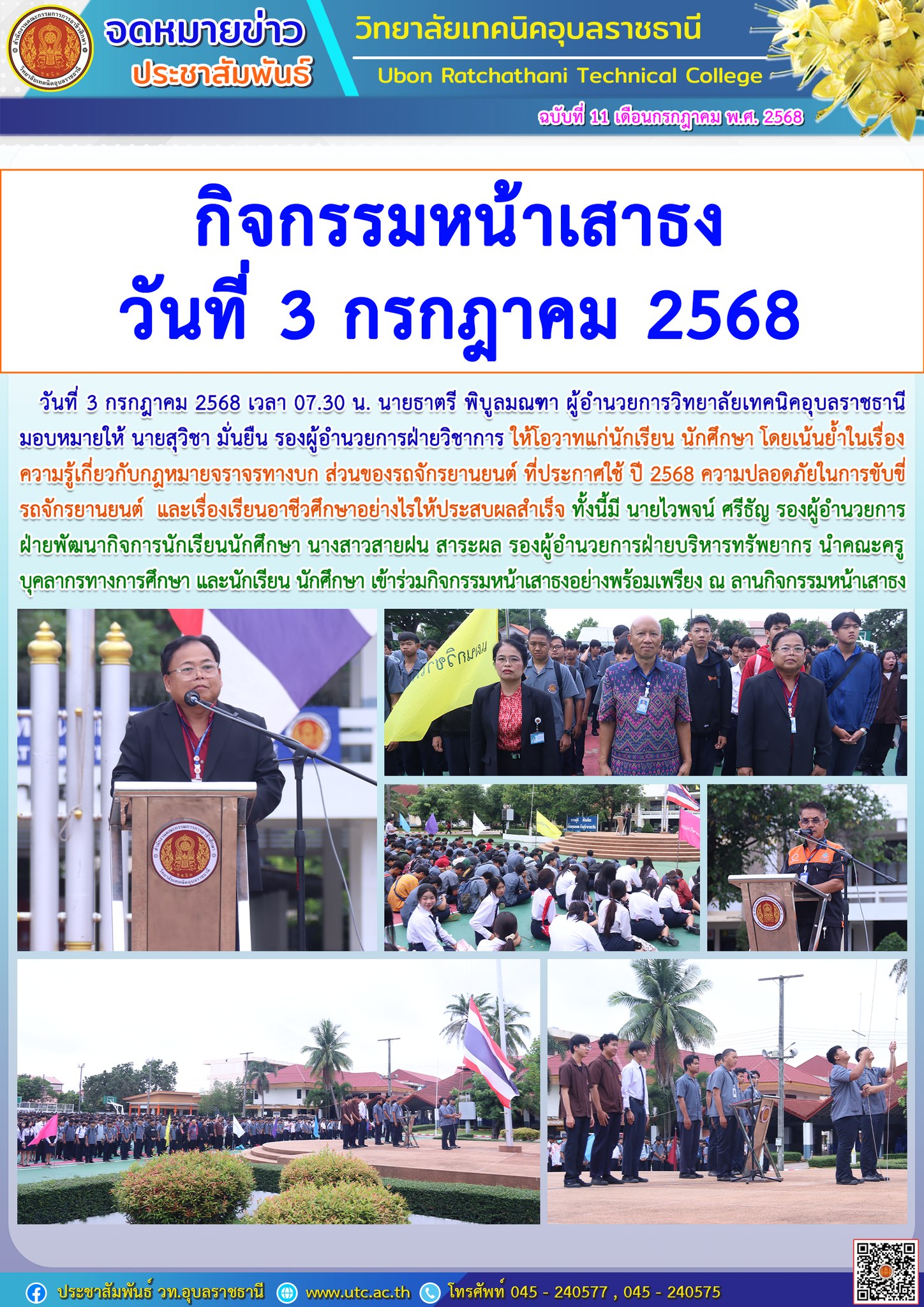 วันที่ 3 กรกฎาคม 2568 เวลา 07.30 น. นายธาตรี พิบูลมณฑา ผู้อำนวยการวิทยาลัยเทคนิคอุบลราชธานี มอบหมายให้ นายสุวิชา มั่นยืน รองผู้อำนวยการฝ่ายวิชาการ ให้โอวาทแก่นักเรียน นักศึกษา โดยเน้นย้ำในเรื่องความรู้เกี่ยวกับกฎหมายจราจรทางบก ส่วนของรถจักรยานยนต์ ที่ประกาศใช้ ปี 2568 ความปลอดภัยในการขับขี่รถจักรยานยนต์ และเรื่องเรียนอาชีวศึกษาอย่างไรให้ประสบผลสำเร็จ ทั้งนี้มี นายไวพจน์ ศรีธัญ รองผู้อำนวยการฝ่ายพัฒนากิจการนักเรียนนักศึกษา นางสาวสายฝน สาระผล รองผู้อำนวยการฝ่ายบริหารทรัพยากร นำคณะครู บุคลากรทางการศึกษา และนักเรียน นักศึกษา เข้าร่วมกิจกรรมหน้าเสาธงอย่างพร้อมเพรียง ณ ลานกิจกรรมหน้าเสาธง