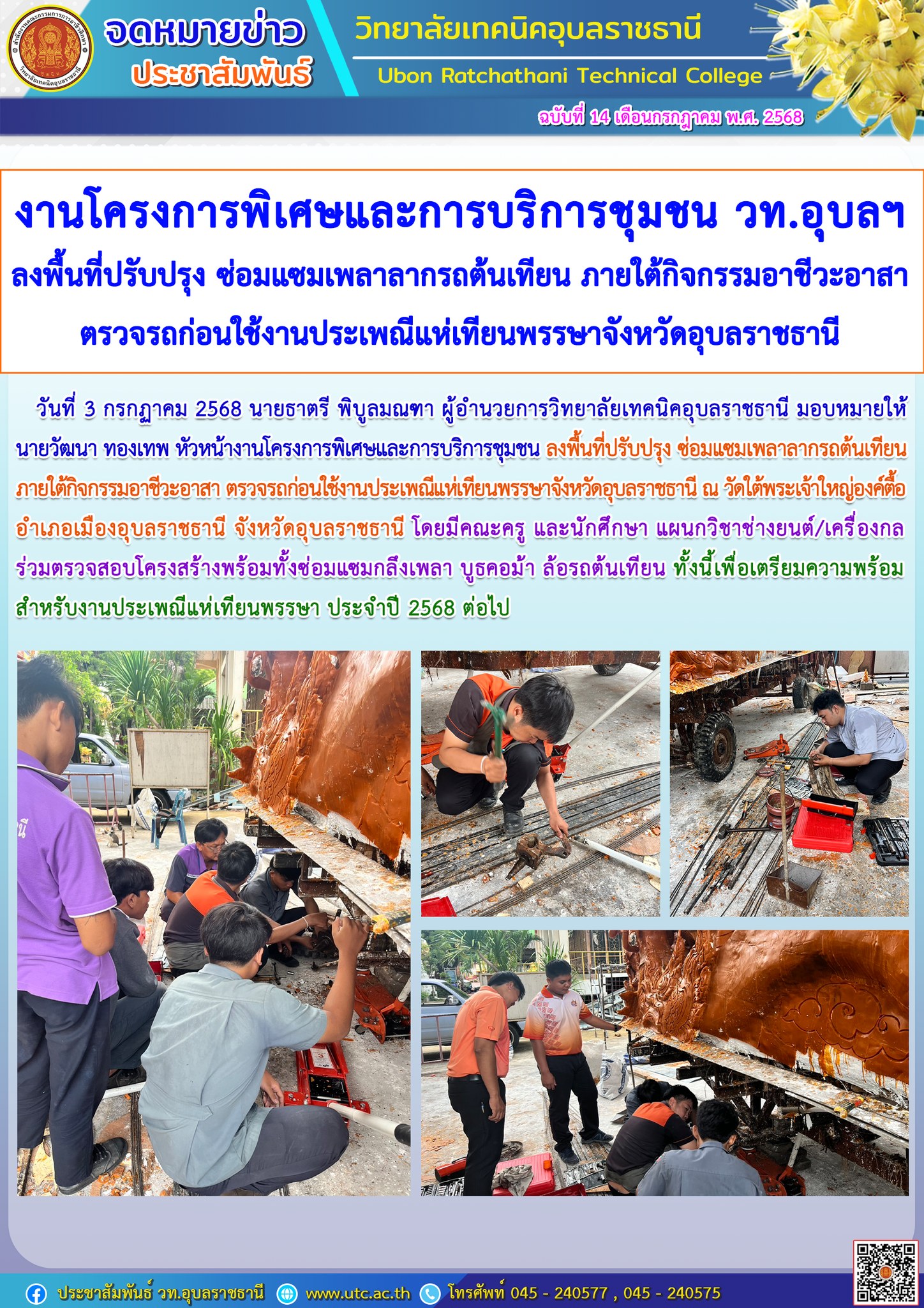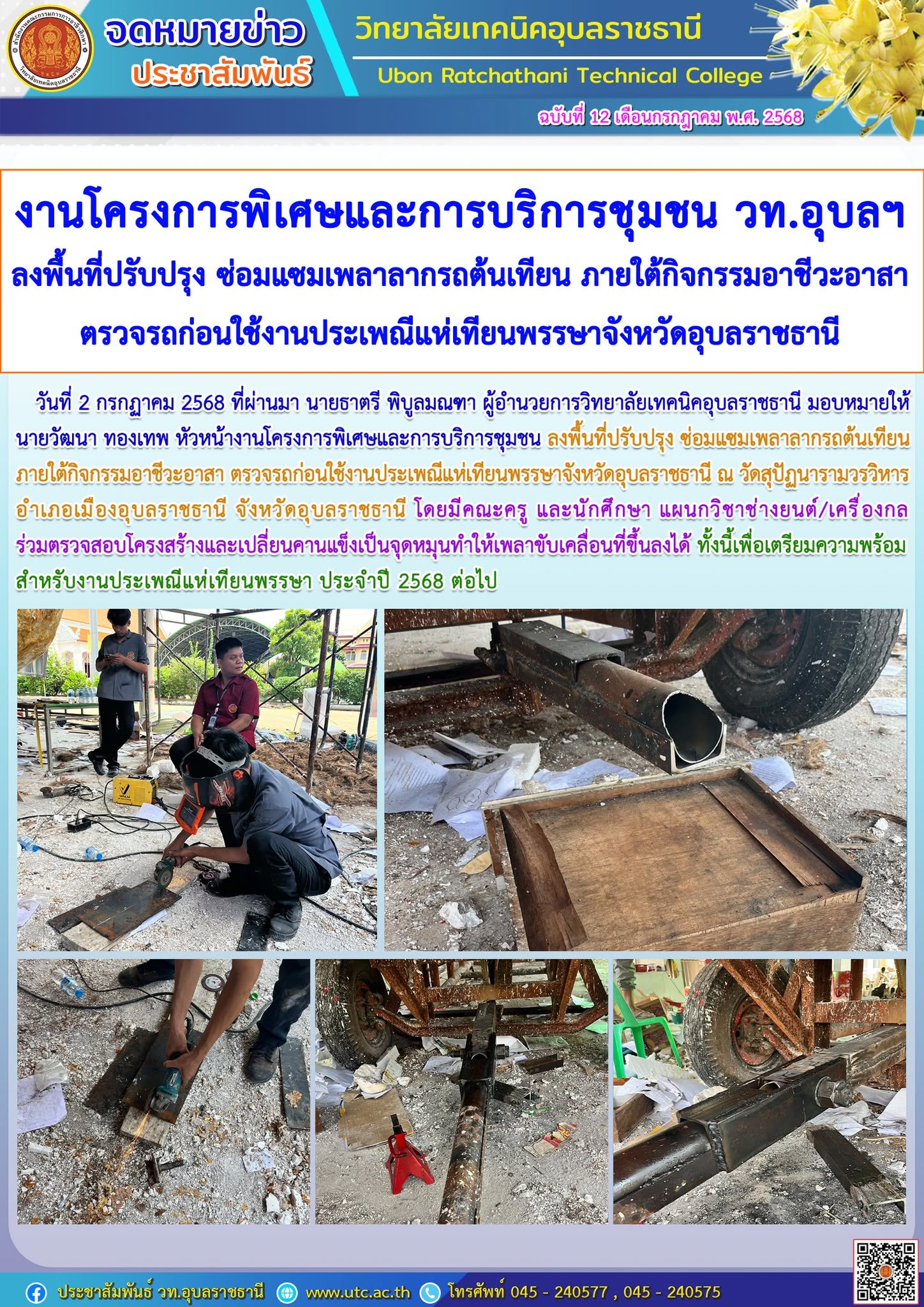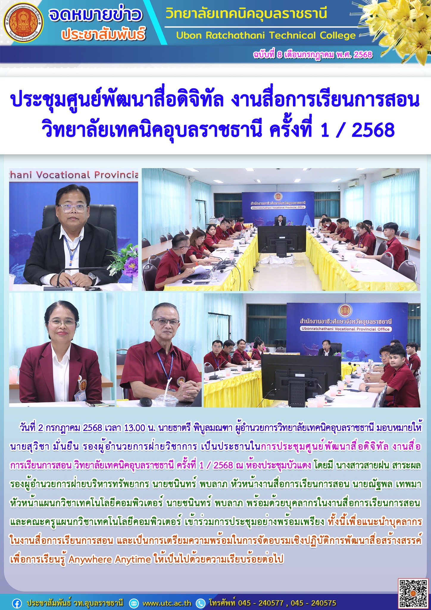วันที่ 3 กรกฎาคม 2568 เวลา 07.30 น. นายธาตรี พิบูลมณฑา ผู้อำนวยการวิทยาลัยเทคนิคอุบลราชธานี มอบหมายให้ นายสุวิชา มั่นยืน รองผู้อำนวยการฝ่ายวิชาการ ให้โอวาทแก่นักเรียน นักศึกษา โดยเน้นย้ำในเรื่องความรู้เกี่ยวกับกฎหมายจราจรทางบก ส่วนของรถจักรยานยนต์ ที่ประกาศใช้ ปี 2568 ความปลอดภัยในการขับขี่รถจักรยานยนต์ และเรื่องเรียนอาชีวศึกษาอย่างไรให้ประสบผลสำเร็จ ทั้งนี้มี นายไวพจน์ ศรีธัญ รองผู้อำนวยการฝ่ายพัฒนากิจการนักเรียนนักศึกษา นางสาวสายฝน สาระผล รองผู้อำนวยการฝ่ายบริหารทรัพยากร นำคณะครู บุคลากรทางการศึกษา และนักเรียน นักศึกษา เข้าร่วมกิจกรรมหน้าเสาธงอย่างพร้อมเพรียง ณ ลานกิจกรรมหน้าเสาธง