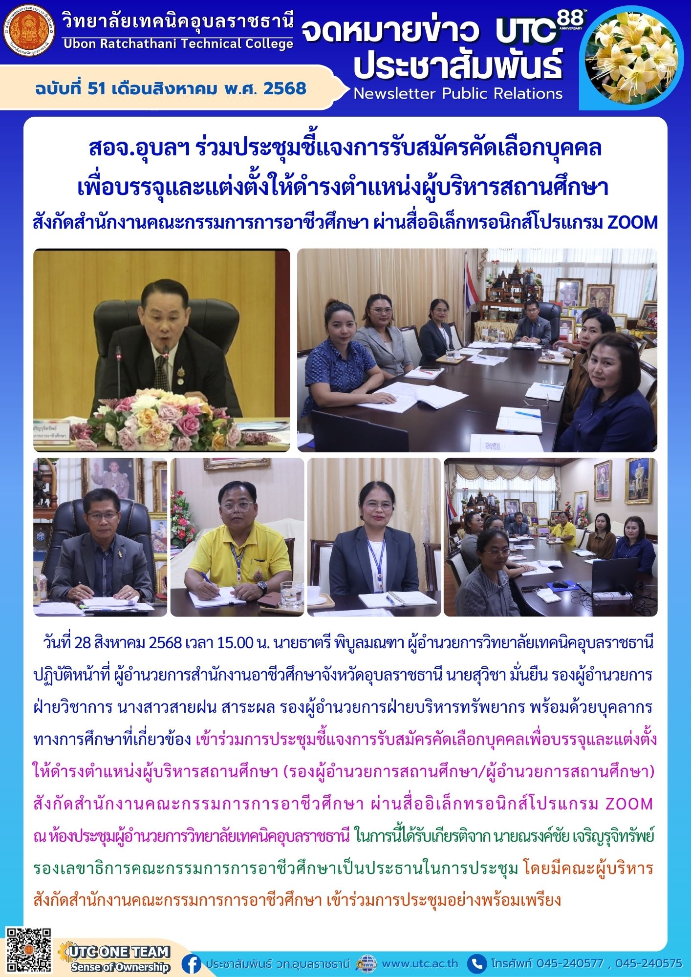 สอจ.อุบลฯ ร่วมการประชุมเข้าร่วมการประชุมการรับสมัครคัดเลือกบุคคลเพื่อบรรจุและแต่งตั้งให้ดำรงตำแหน่งผู้บริหารสถานศึกษา สังกัดสำนักงานคณะกรรมการการอาชีวศึกษา ผ่านสื่ออิเล็กทรอนิกส์โปรแกรม ZOOM