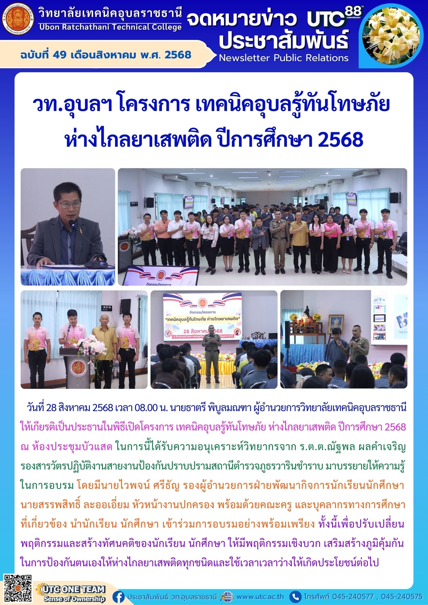วันที่ 28 สิงหาคม 2568 เวลา 08.00 น. นายธาตรี พิบูลมณฑา ผู้อำนวยการวิทยาลัยเทคนิคอุบลราชธานี ให้เกียรติเป็นประธานในพิธีเปิดโครงการ เทคนิคอุบลรู้ทันโทษภัย ห่างไกลยาเสพติด ปีการศึกษา 2568 ณ ห้องประชุมบัวแสด ในการนี้ได้รับความอนุ (เพิ่มเติม…)
