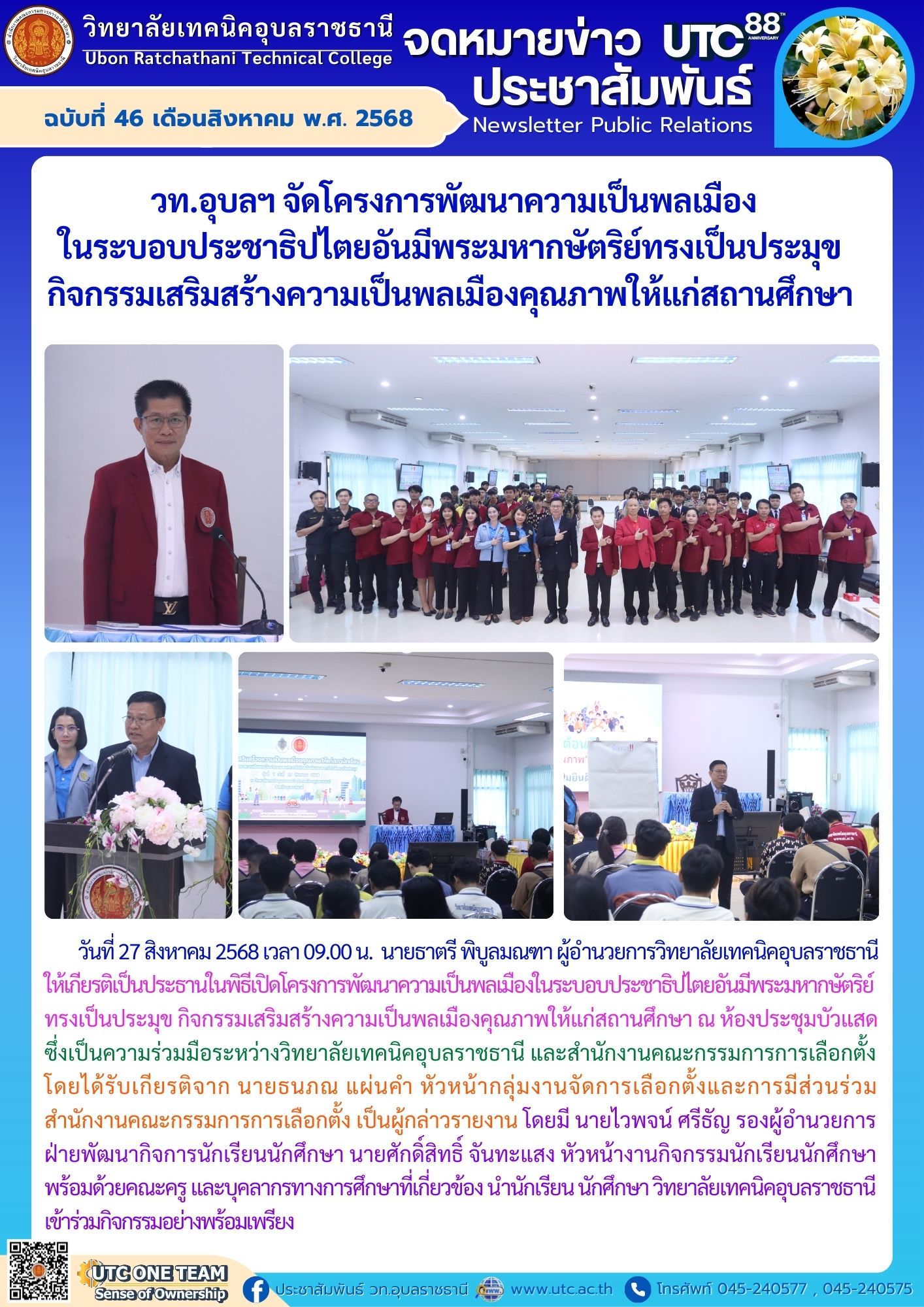 วันที่ 27 สิงหาคม 2568 เวลา 09.00 น. นายธาตรี พิบูลมณฑา ผู้อำนวยการวิทยาลัยเทคนิคอุบลราชธานี ให้เกียรติเป็นประธานในพิธีเปิดโครง (เพิ่มเติม…)