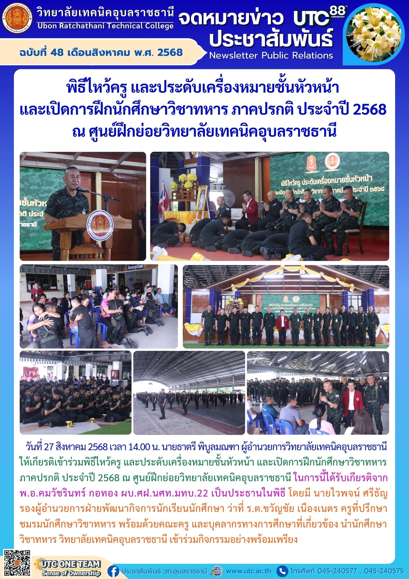 วันที่ 27 สิงหาคม 2568 เวลา 14.00 น. นายธาตรี พิบูลมณฑา ผู้อำนวยการวิทยาลัยเทคนิคอุบลราชธานี ให้เกียรติเข้าร่วมพิธีไหว้ครู และประดับเครื่องหมายชั้นหัวหน้า และ (เพิ่มเติม…)