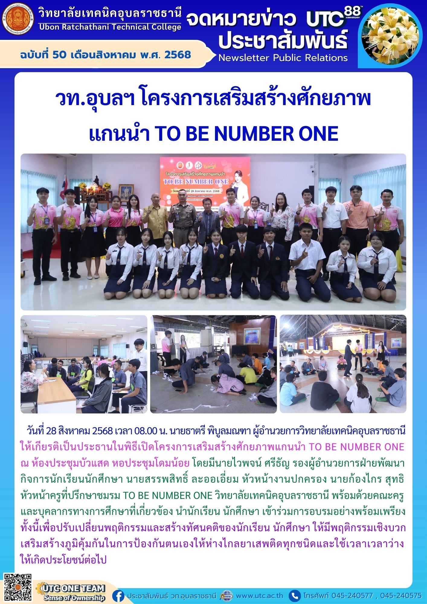 วันที่ 28 สิงหาคม 2568 เวลา 08.00 น. นายธาตรี พิบูลมณฑา ผู้อำนวยการวิทยาลัยเทคนิคอุบลราชธานี ให้เกียรติเป็นประธานในพิธีเปิดโครงการเสริมสร้างศักยภาพแกนนำ TO BE NUMBER ONE ณ ห้องประชุมบัวแสด หอประชุมโดมน้อย โดยมีนายไวพจน์ ศรีธัญ (เพิ่มเติม…)