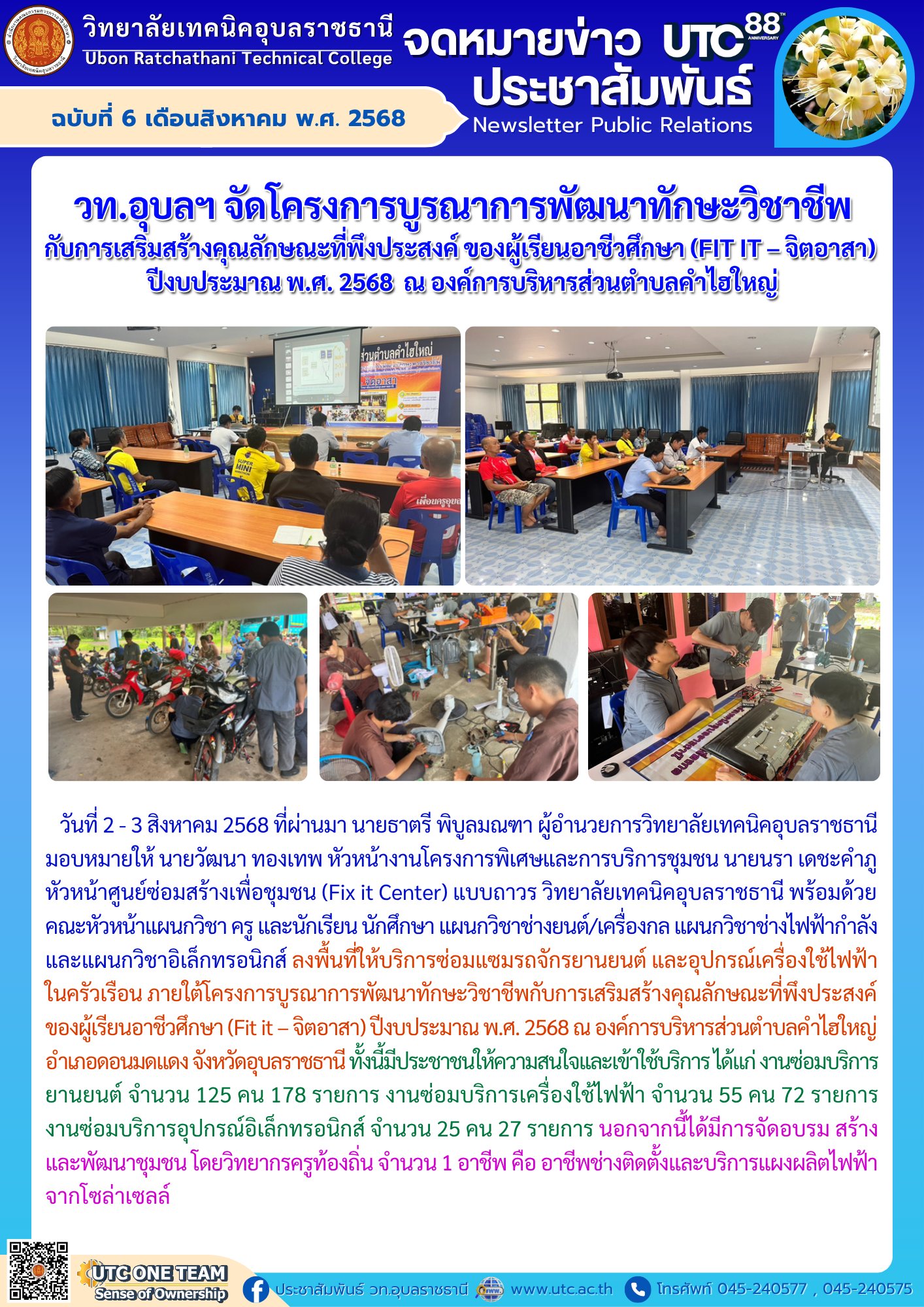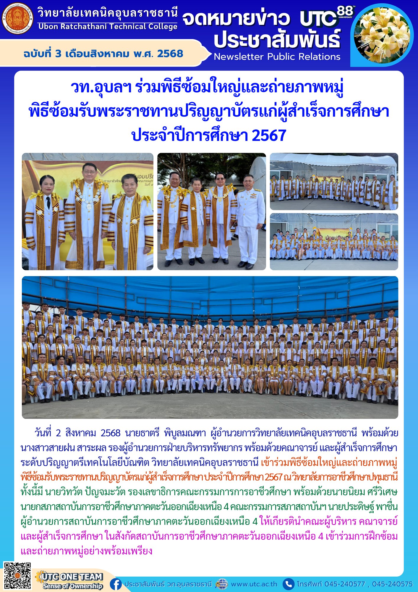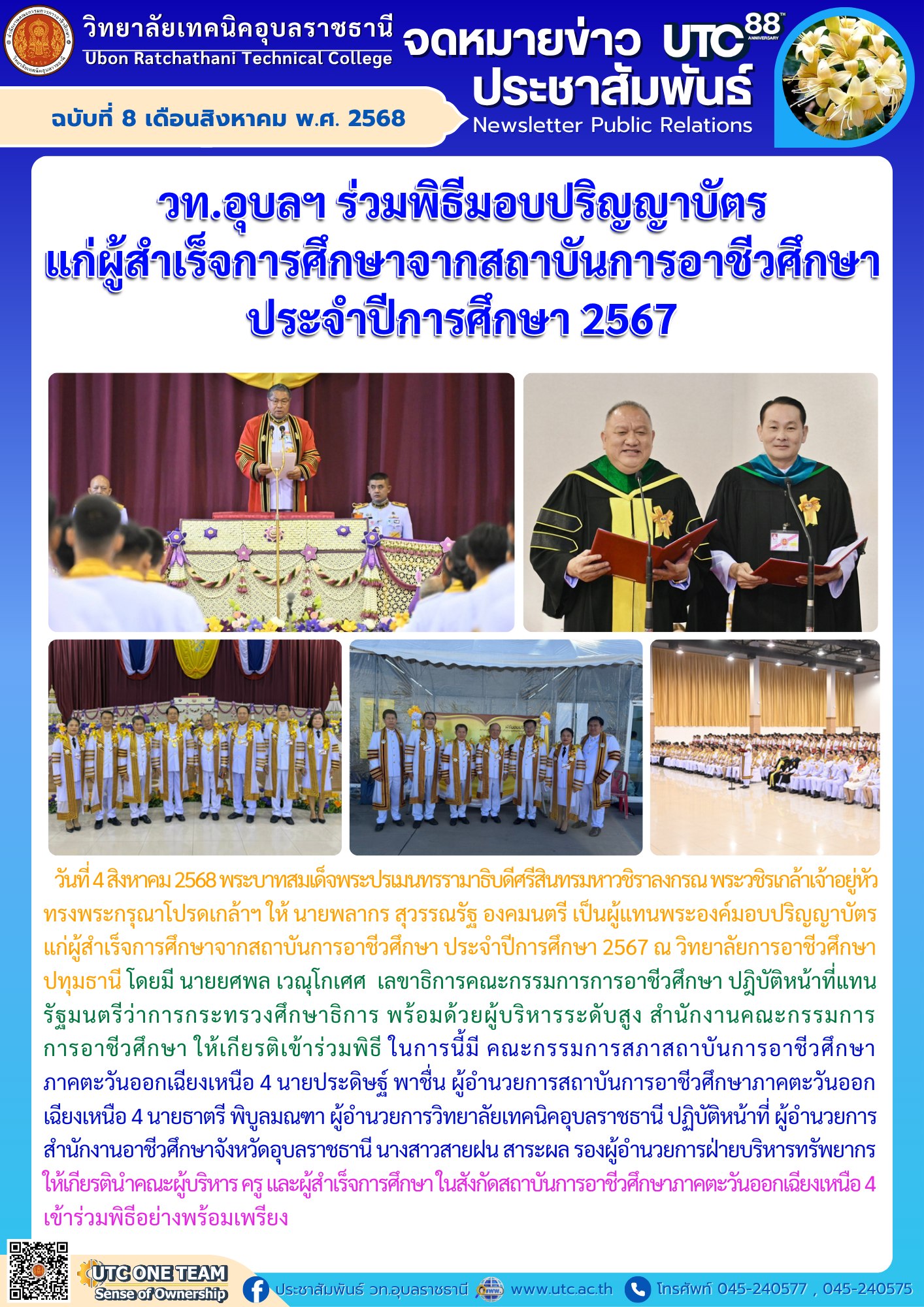 วท.อุบลฯ เข้าร่วมพิธีมอบปริญญาบัตรแก่ผู้สำเร็จการศึกษาจากสถาบันการอาชีวศึกษา ประจำปีการศึกษา 2567