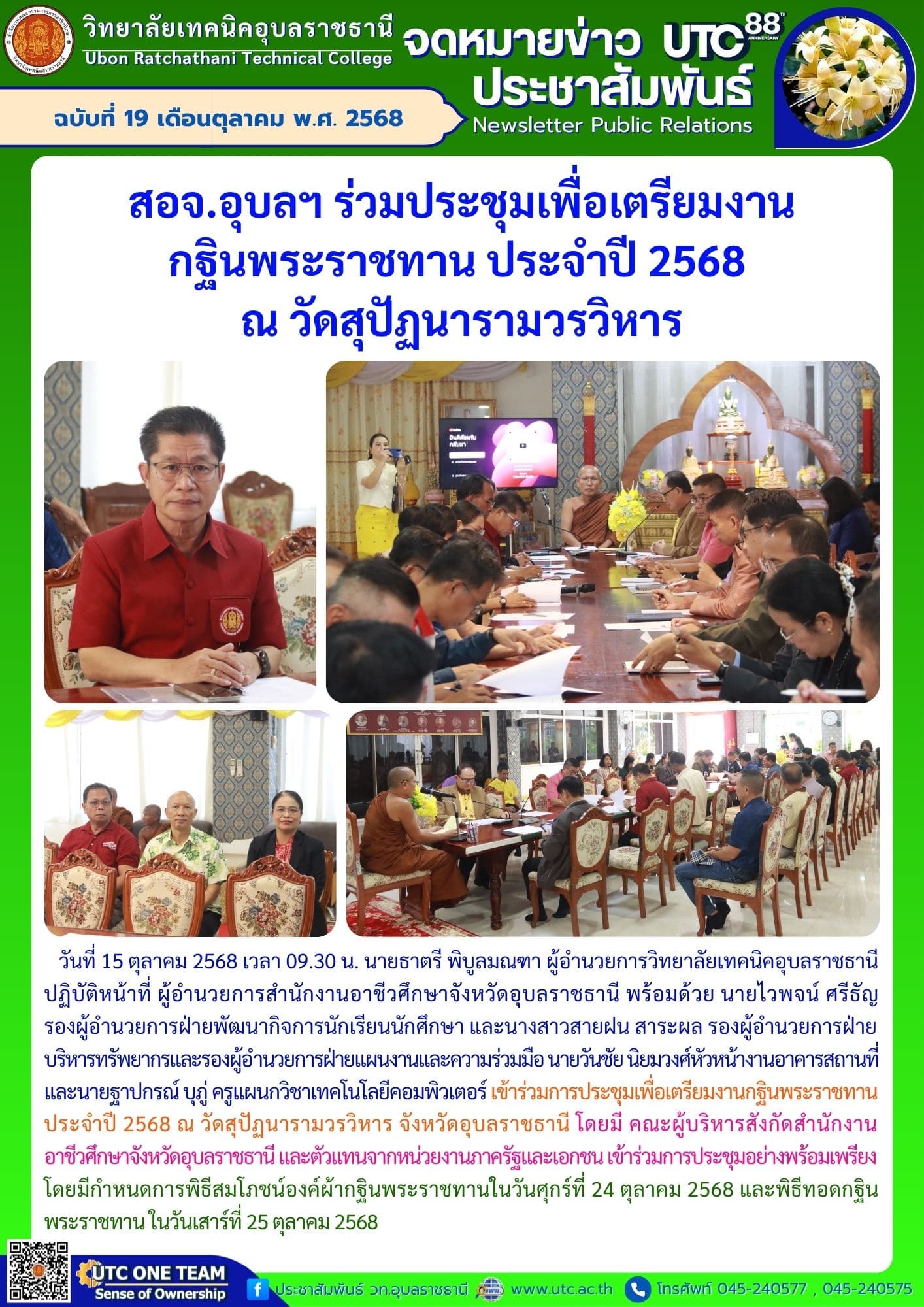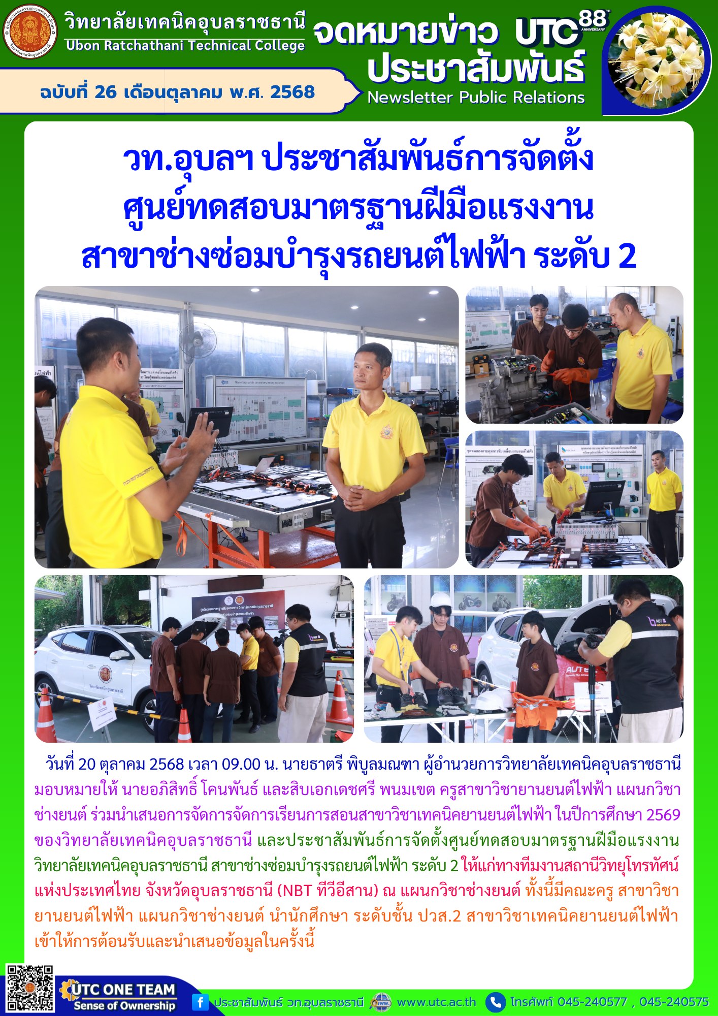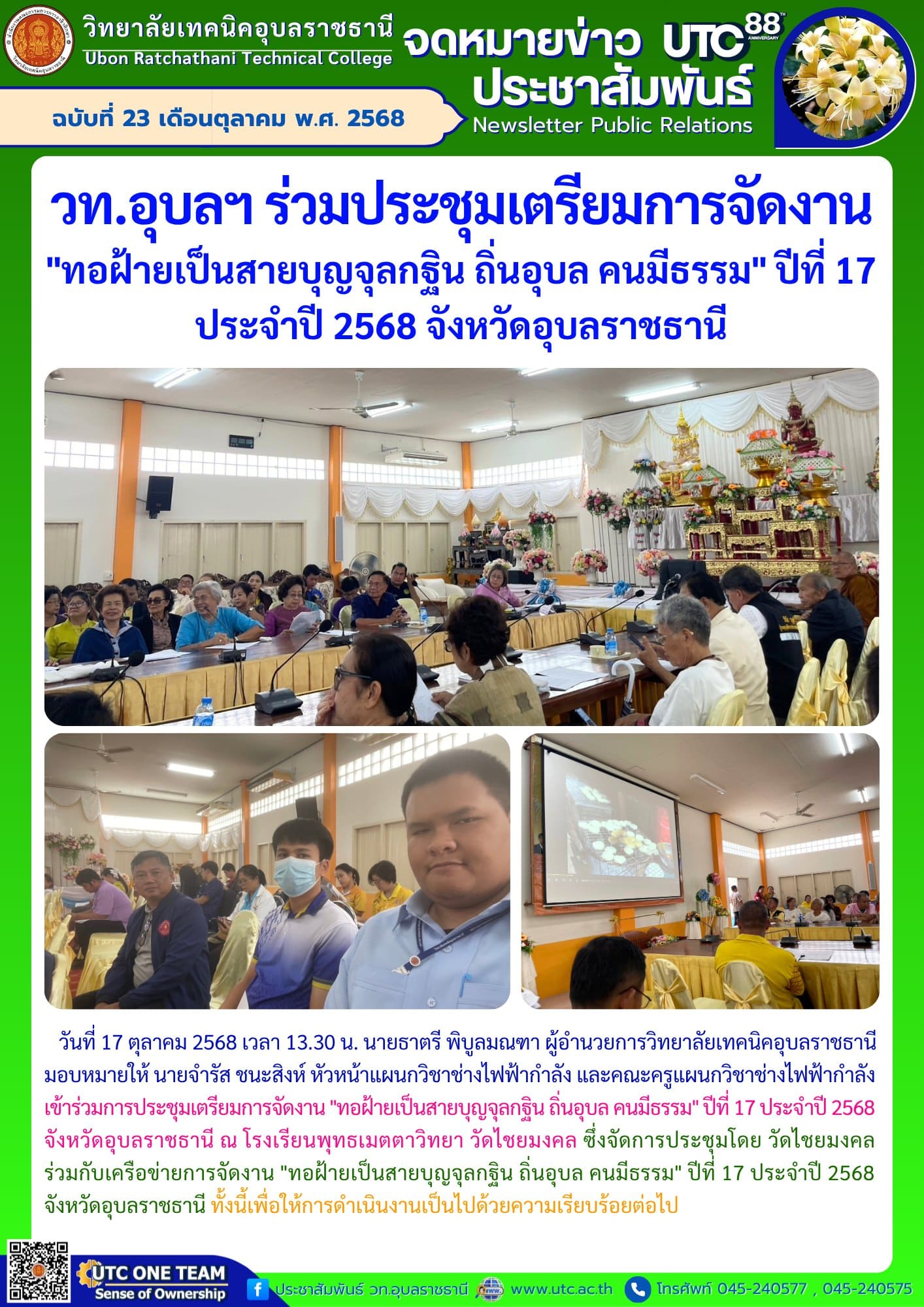 วันที่ 20 ตุลาคม 2568 เวลา 09.00 น. นายธาตรี พิบูลมณฑา ผู้อำนวยการวิทยาลัยเทคนิคอุบลราชธานี มอบหมายให้ ว่าที่ ร.ต. ศตวัฒน์ มงคลดิษฐ์ หัวหน้าแผนกวิชาอิเล็กทรอนิกส์ นายทรงศักดิ์ สัตนาโค หัวหน้างาน (เพิ่มเติม…)