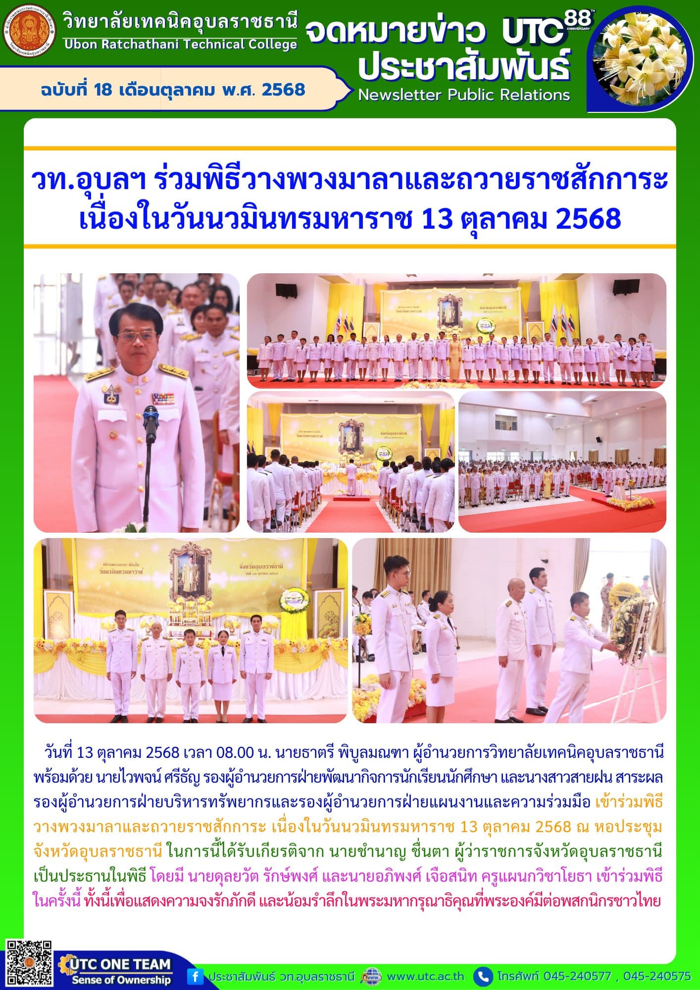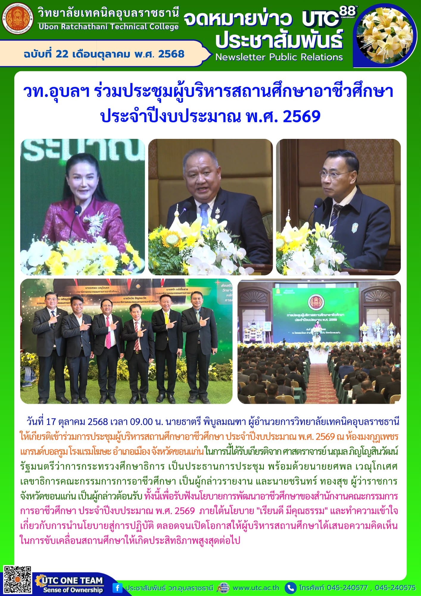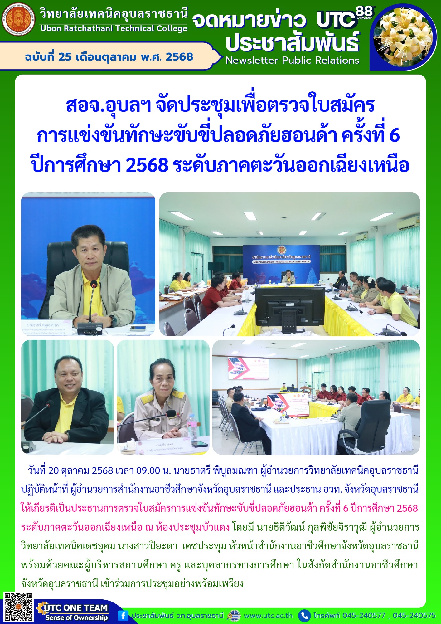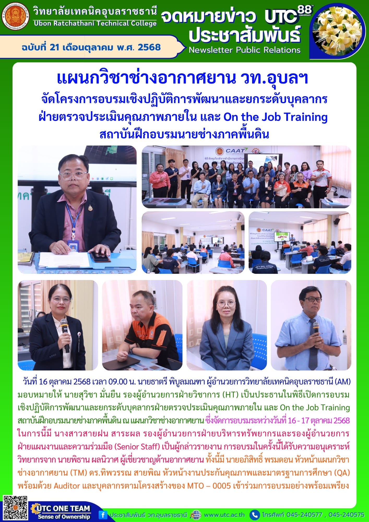 วันที่ 20 ตุลาคม 2568 เวลา 09.00 น. นายธาตรี พิบูลมณฑา ผู้อำนวยการวิทยาลัยเทคนิคอุบลราชธานี มอบหมายให้ ว่าที่ ร.ต. ศตวัฒน์ มงคลดิษฐ์ หัวหน้าแผนกวิชาอิเล็กทรอนิกส์ นายทรงศักดิ์ สัตนาโค หัวหน้างาน (เพิ่มเติม…)