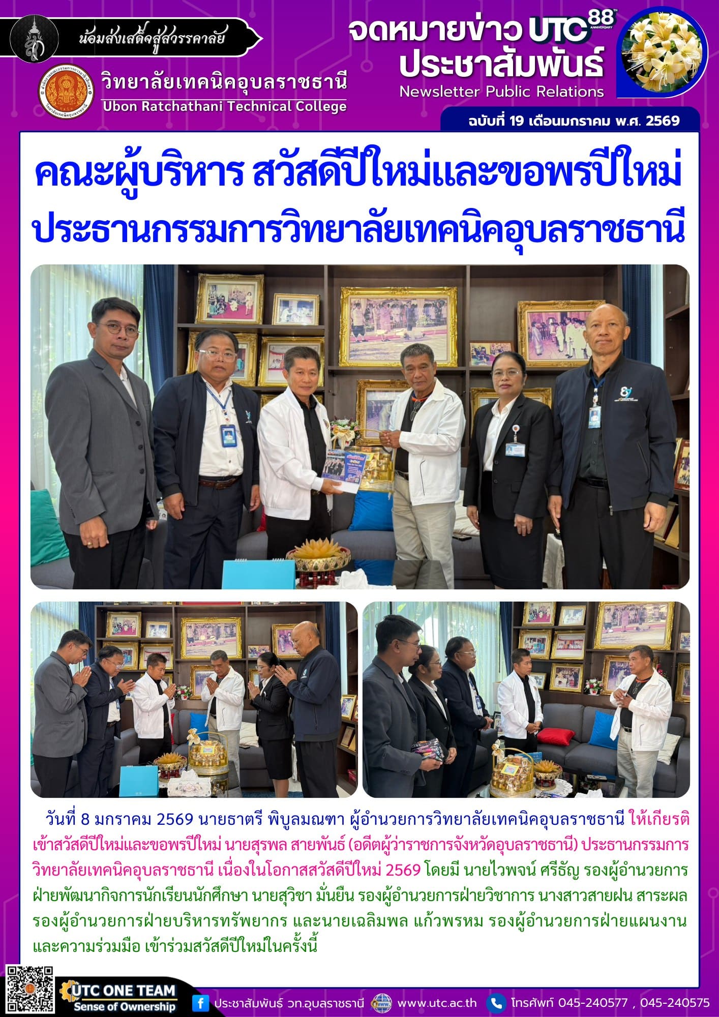วันที่ 8 มกราคม 2569 นายธาตรี พิบูลมณฑา ผู้อำนวยการวิทยาลัยเทคนิคอุบลราชธานี ให้เกียรติเข้าสวัสดีปีใหม่และขอพรปีใหม่ นายสุรพล สายพันธ์ (อดีตผู้ว่าราชการจังหวัดอุบลราชธานี) ประธานกรรมการวิทยาลัย (เพิ่มเติม…)